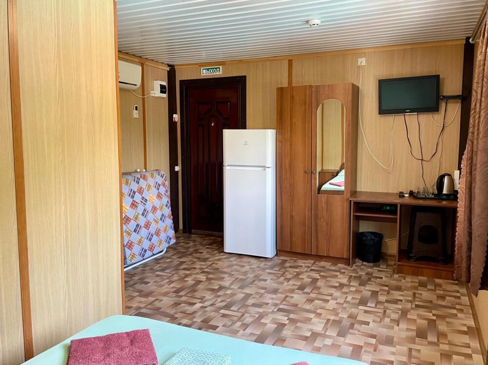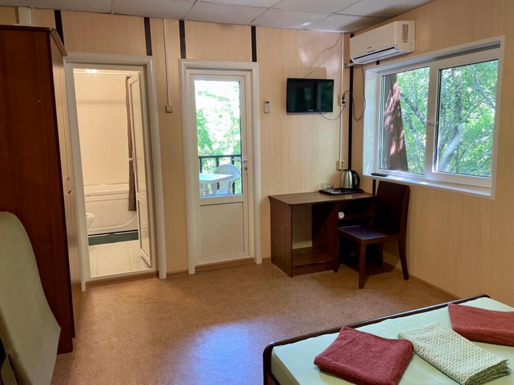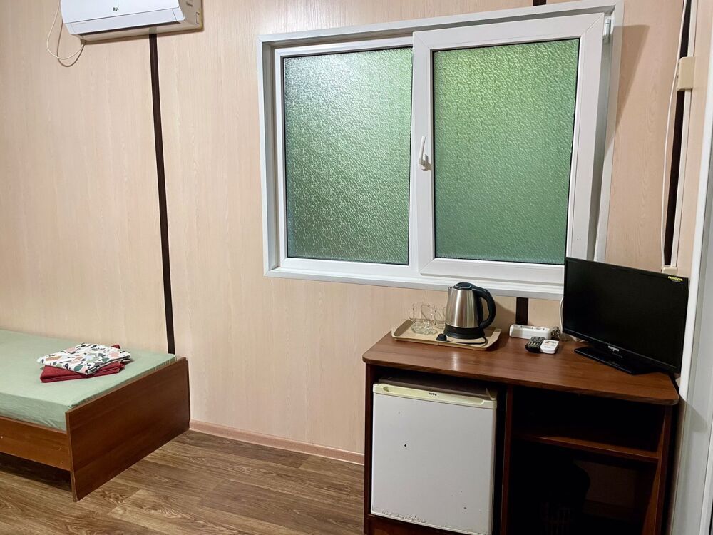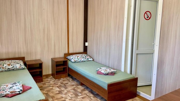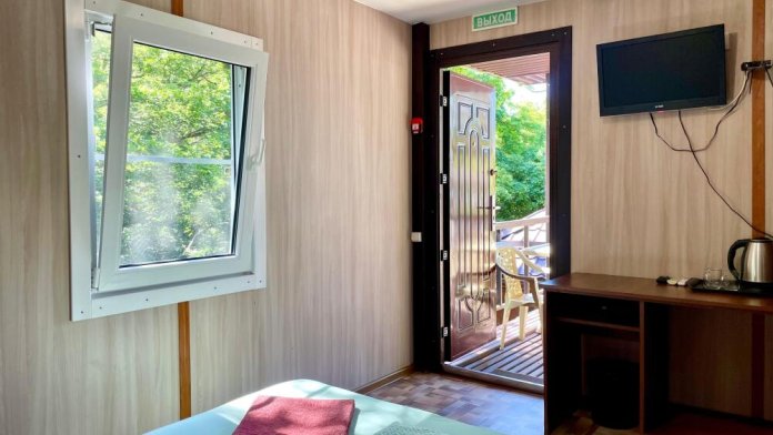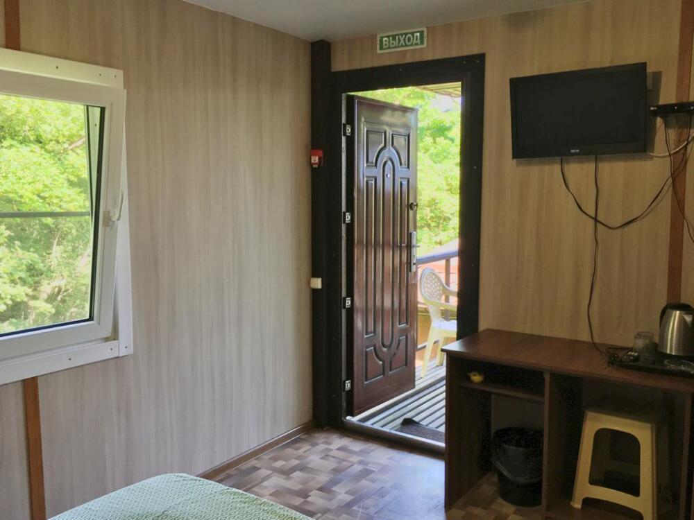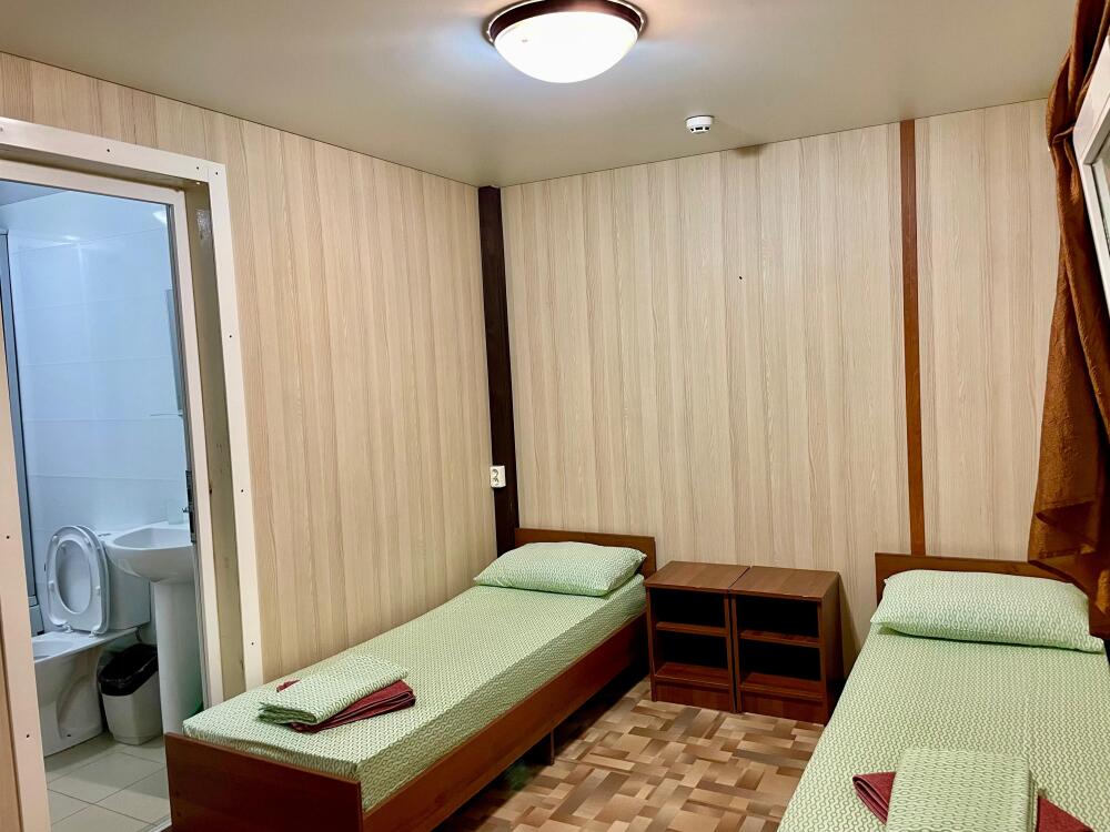 Двухместный номер с 2 односпальными кроватями и кондиционером, общая веранда на 2 номера. В номере: 2 односпальные кровати, душ, туалет, чайник, телевизор, кондиционер, холодильник на веранде (на 2 номера).