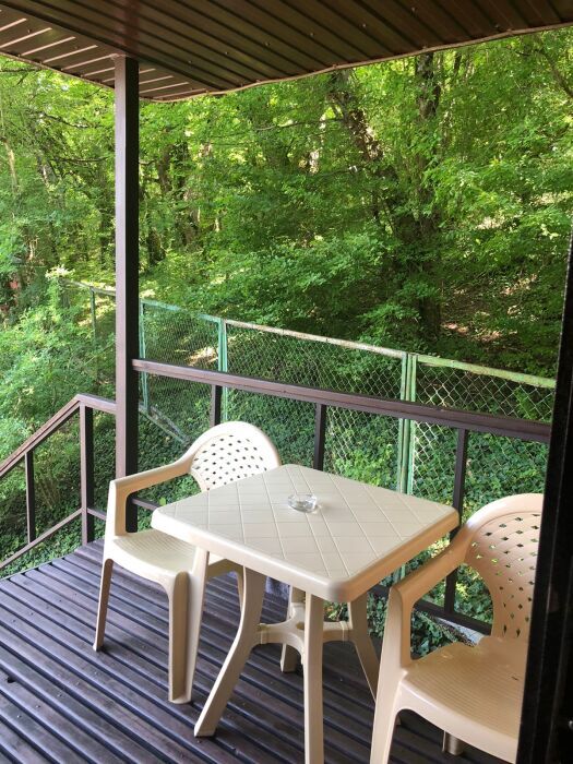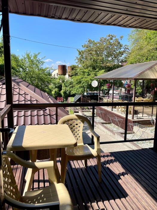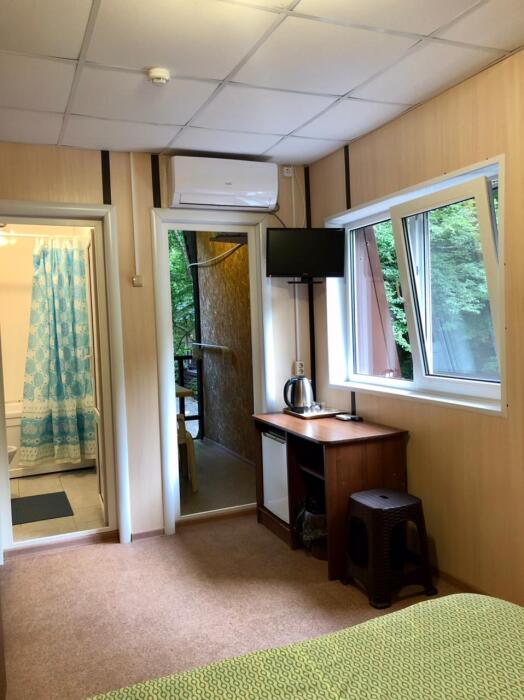 В номере: 2 односпальные кровати, ванна, туалет, чайник, телевизор, кондиционер, мини-холодильник, веранда. 1 этаж.