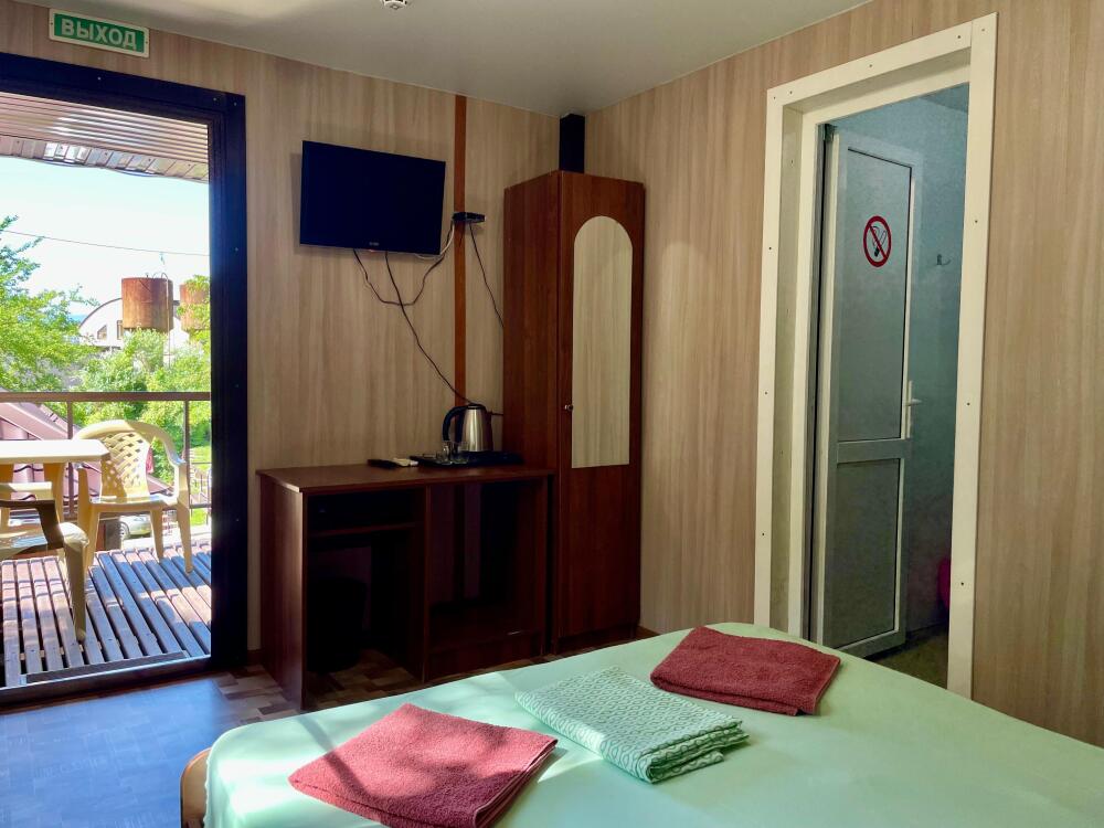 В номере: двуспальная и 1 раскладная кровать, ванна, туалет, чайник, телевизор, кондиционер, холодильник, веранда/балкон. Номера расположены в двухэтажных корпусах, на 1 и 2 этаже. Вход на 2 этаж по винтовой лестнице.