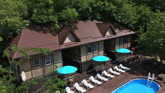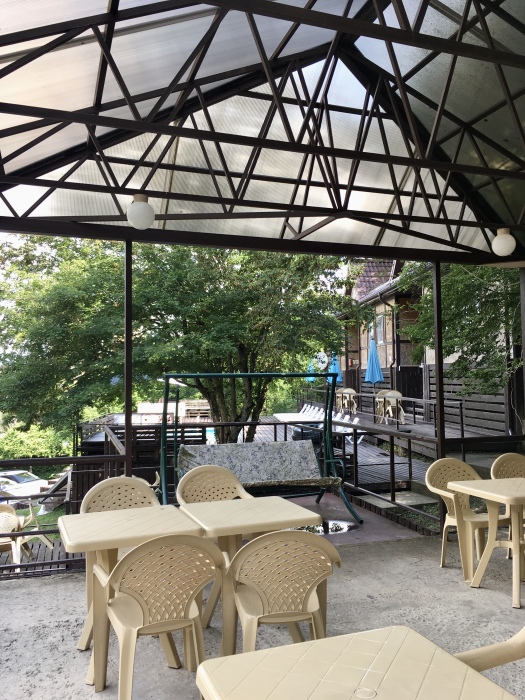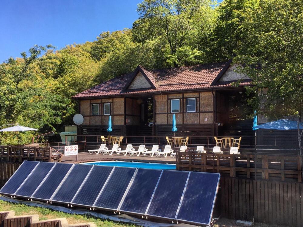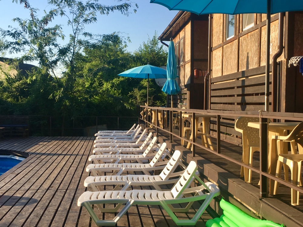 - подогреваемый бассейн с зоной отдыха (подогрев от солнечных батарей, температура воды 23−28 гр., время работы бассейна с 10:00 до 20:00);