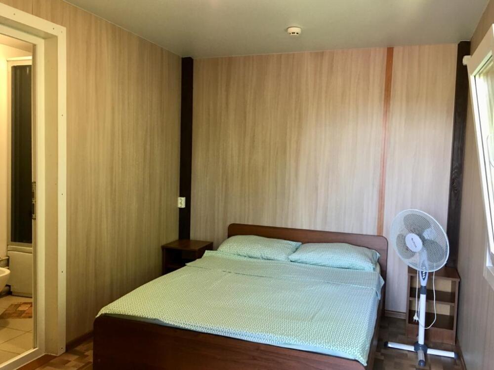 Двухместный номер двуспальной кроватью и вентилятором, в номере: душ, туалет, чайник, телевизор, вентилятор, холодильник на веранде.