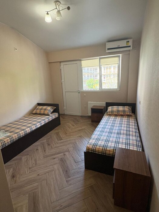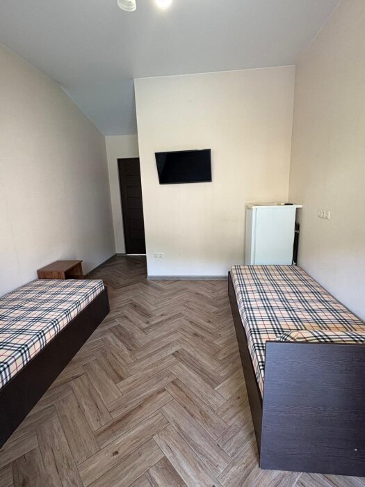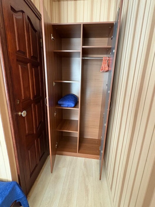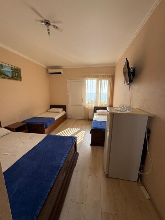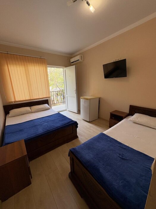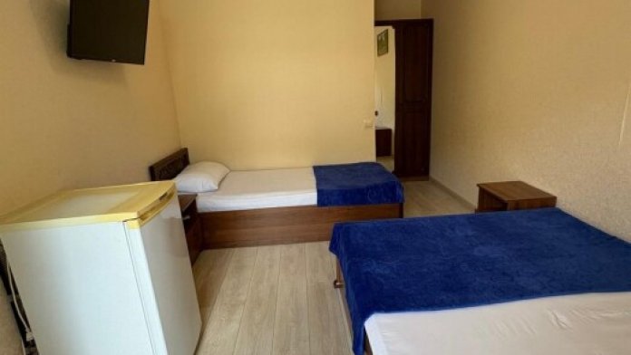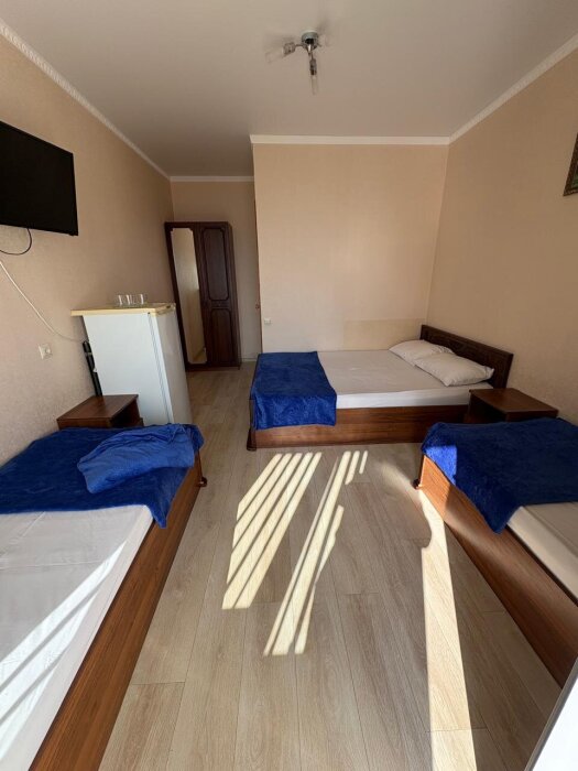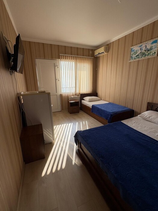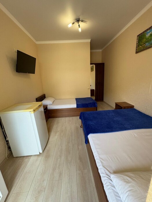 В номере: 1 двуспальная и 2 односпальные кровати.