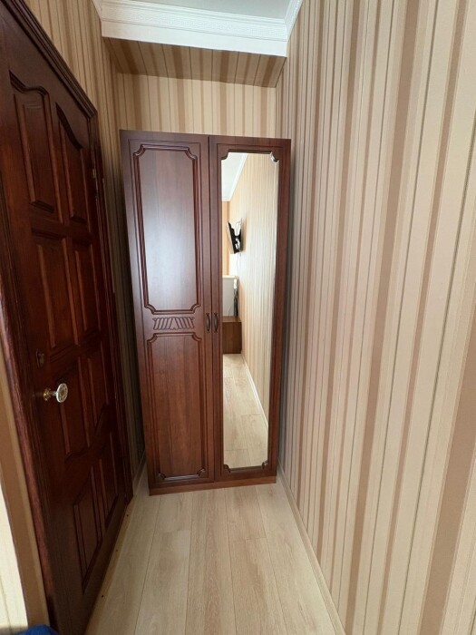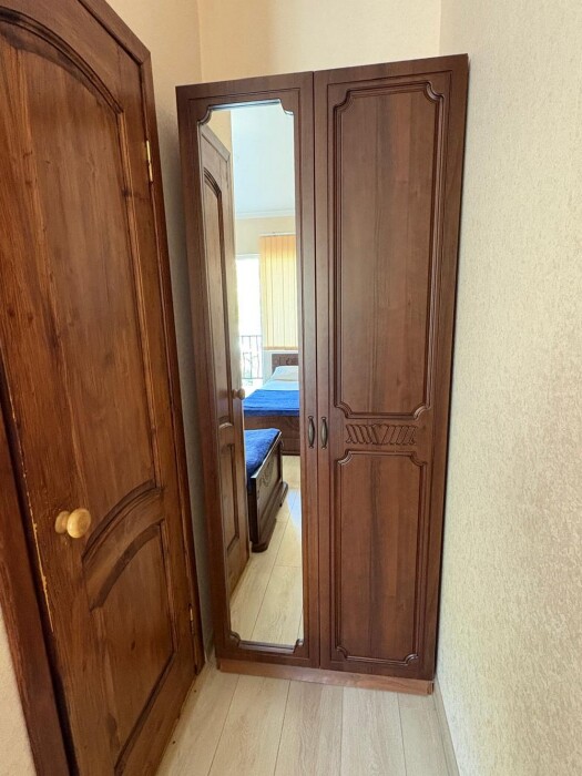 Имеется терраса, телевизор, кондиционер, шкаф, вешалка, зеркало, журнальный столик, посуда, столовые приборы, холодильник, стулья.
