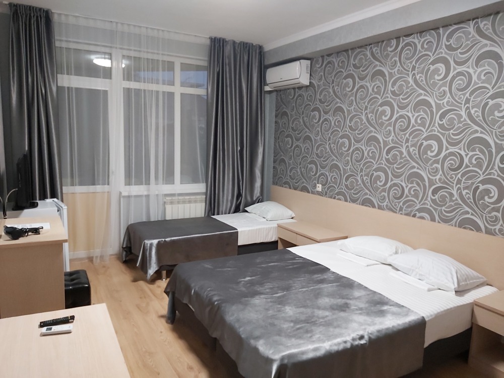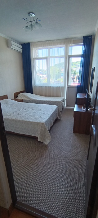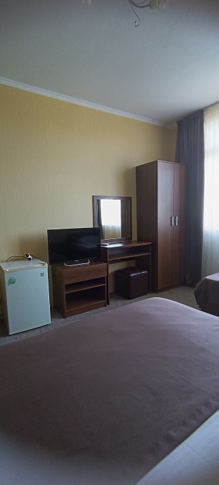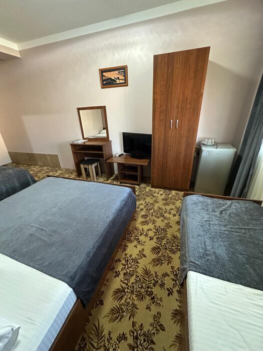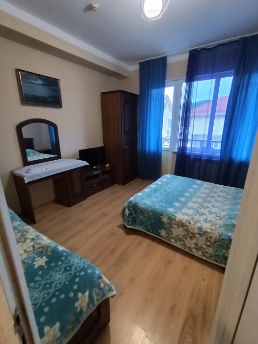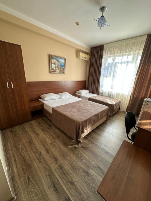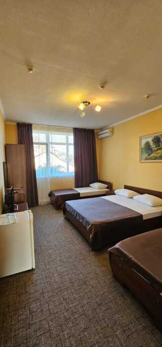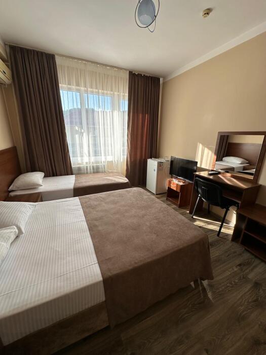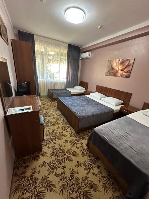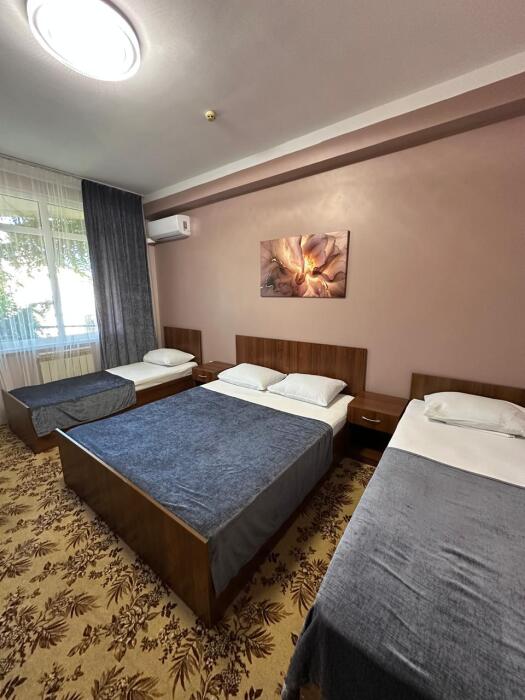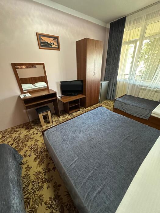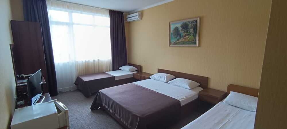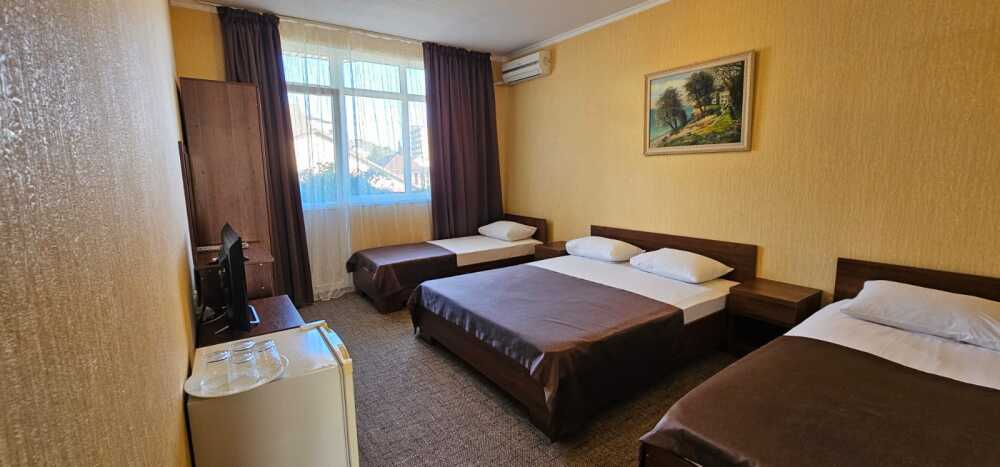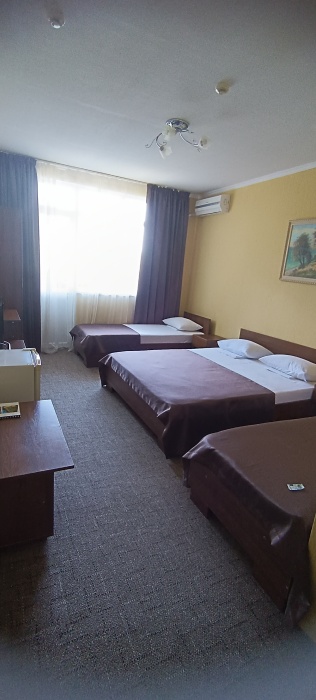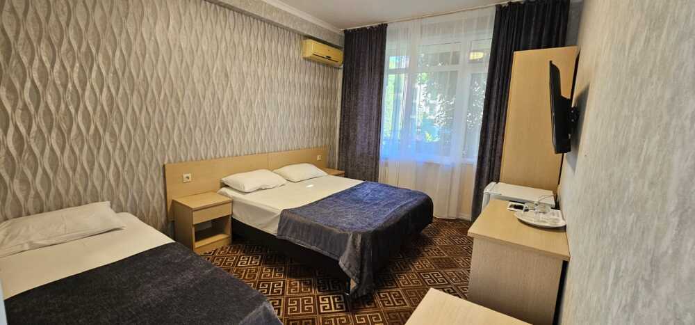 Трёхместные номера стандарт расположены на втором и третьем этажах. Номера с индивидуальным балконом. В номере двухспальная кровать и односпальная ,шкаф, туалетный столик с зеркалом , тумбочки , холодильник ,кондиционер и телевизор , фен, комплект полотенец , постельное белье . Душ и туалет находят ся в номере . ,
