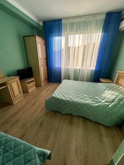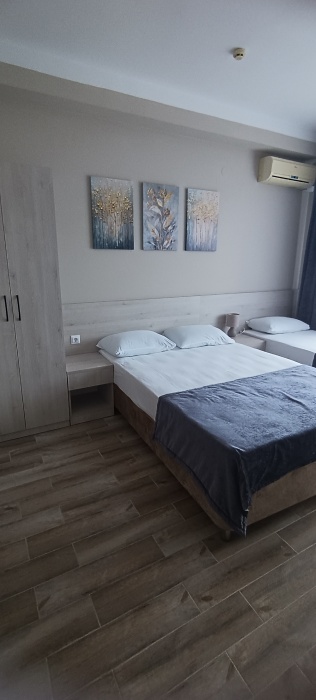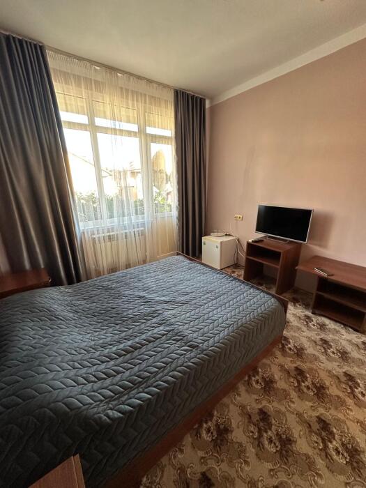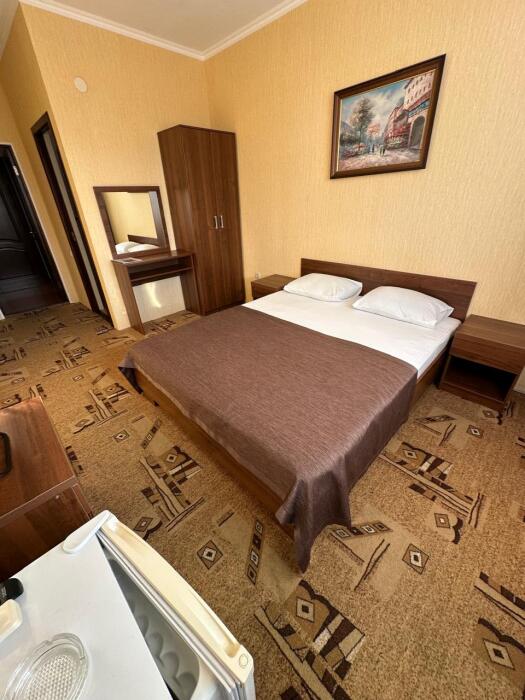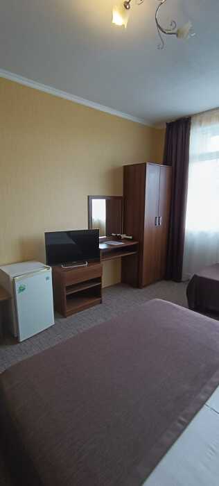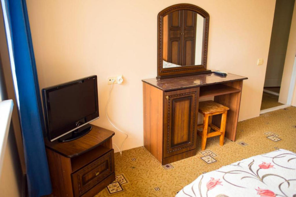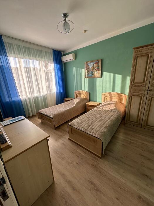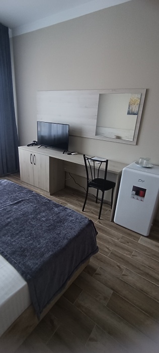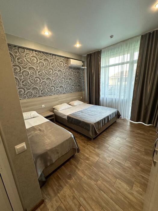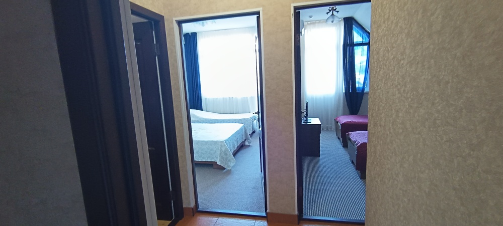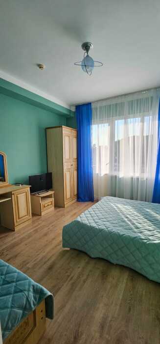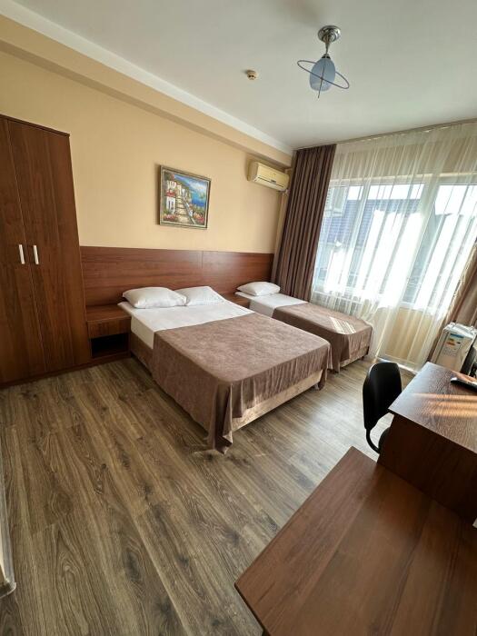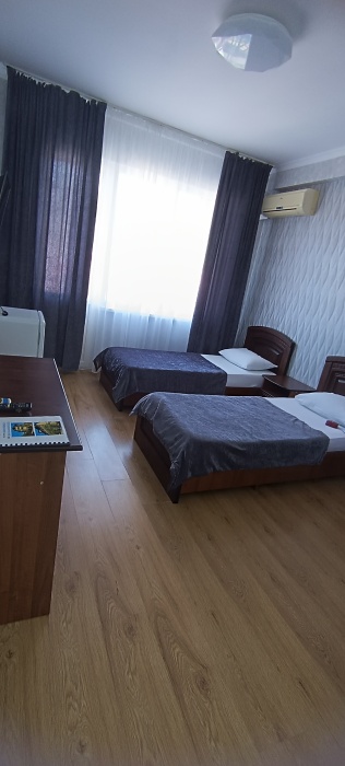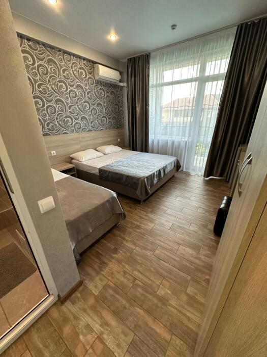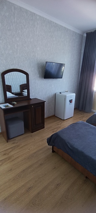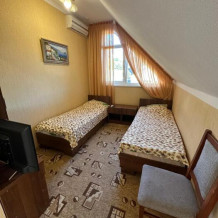 Трёхместные номера стандарт расположены на втором и третьем этажах. Номера с индивидуальным балконом. В номере двухспальная кровать и односпальная ,шкаф, туалетный столик с зеркалом , тумбочки , холодильник ,кондиционер и телевизор , фен, комплект полотенец , постельное белье . Душ и туалет находят ся в номере . ,