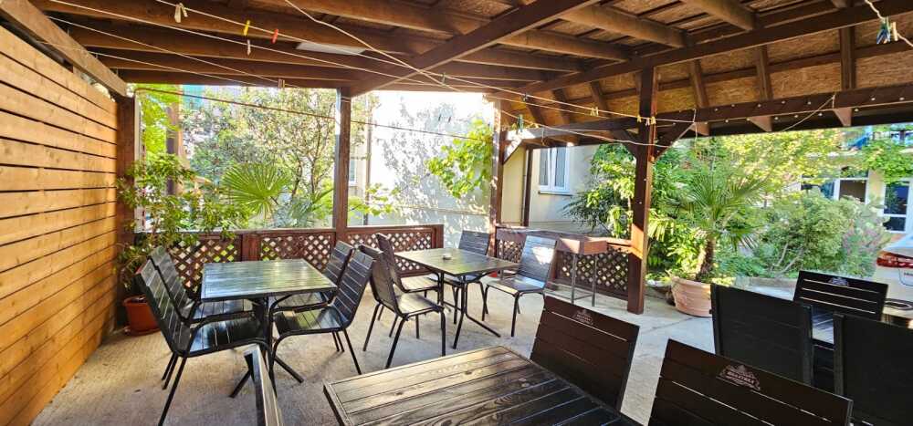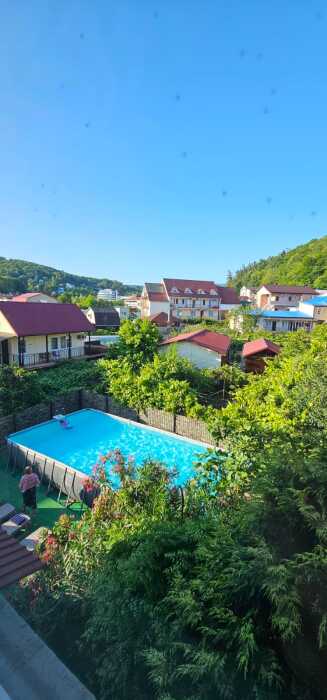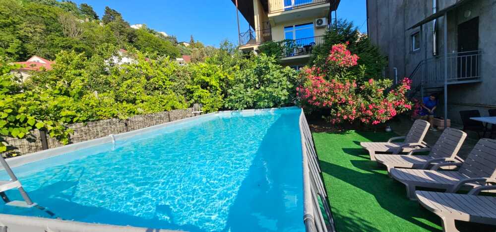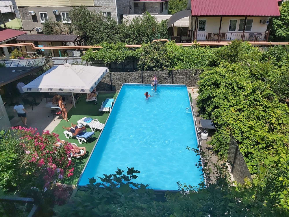 На территории гостевого дома имеется просторный, увитый зеленью двор. Во дворе есть бесплатная парковка на 12 машиномест, летняя беседка, мангал, каркасный бассейн. Предлагаются номера различных ценовых категорий. Уборка номеров проводится по требованию, смена белья раз в 7 дней, замена полотенец каждые 2-3 дня.