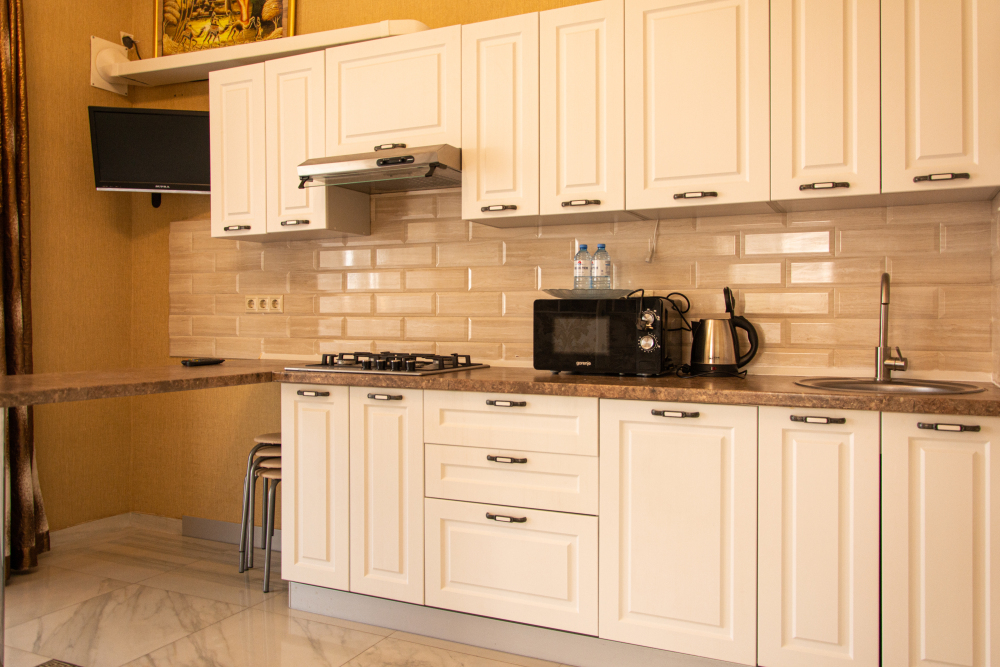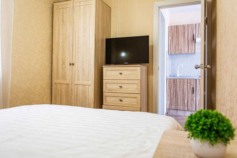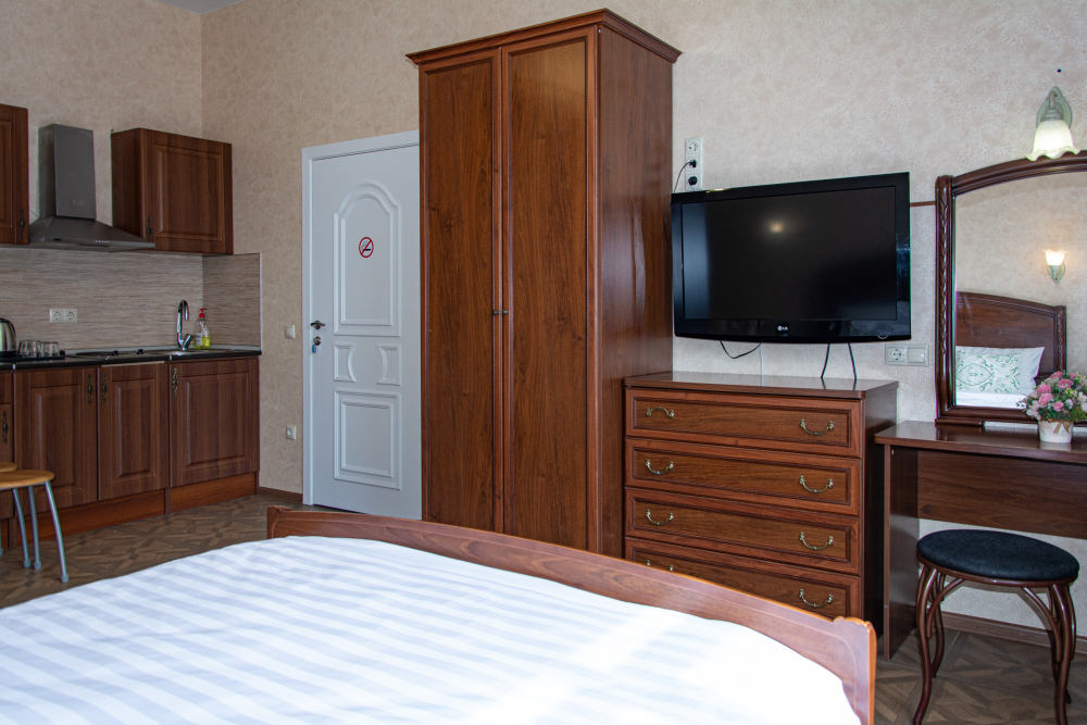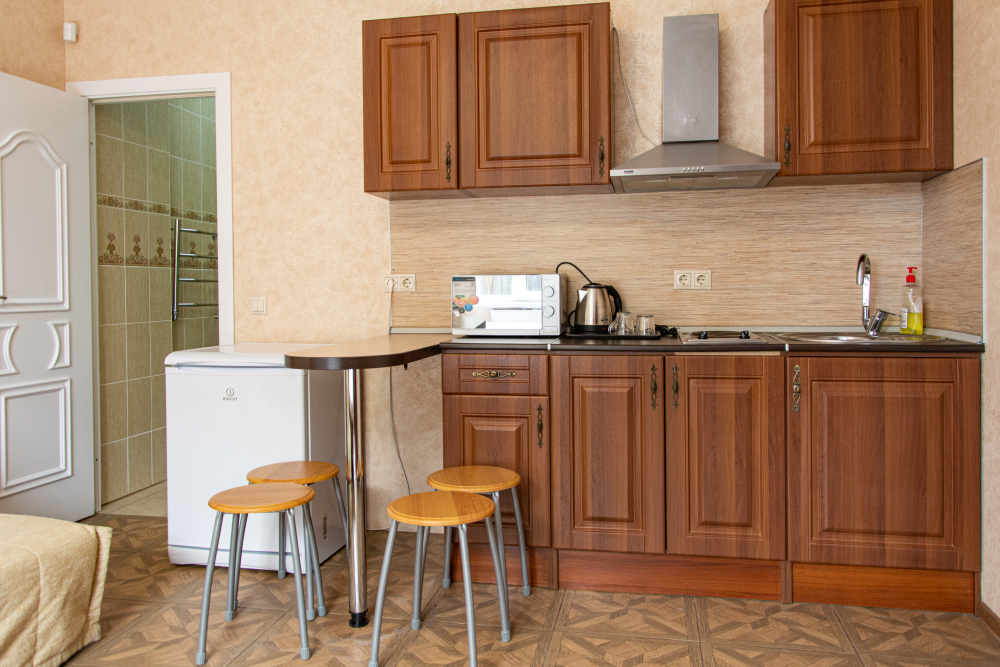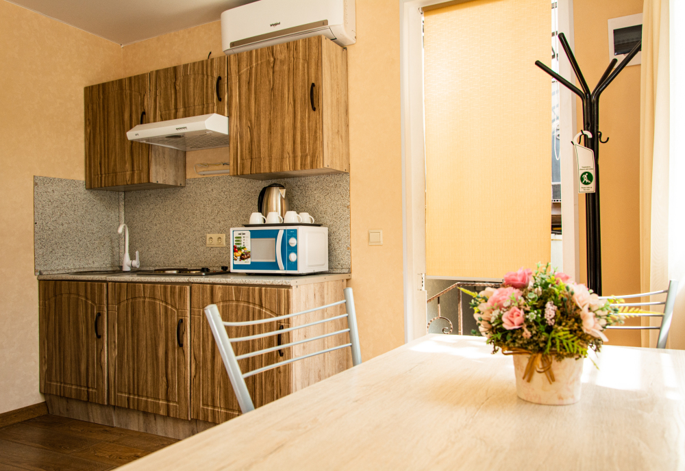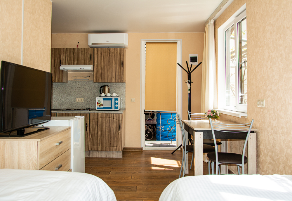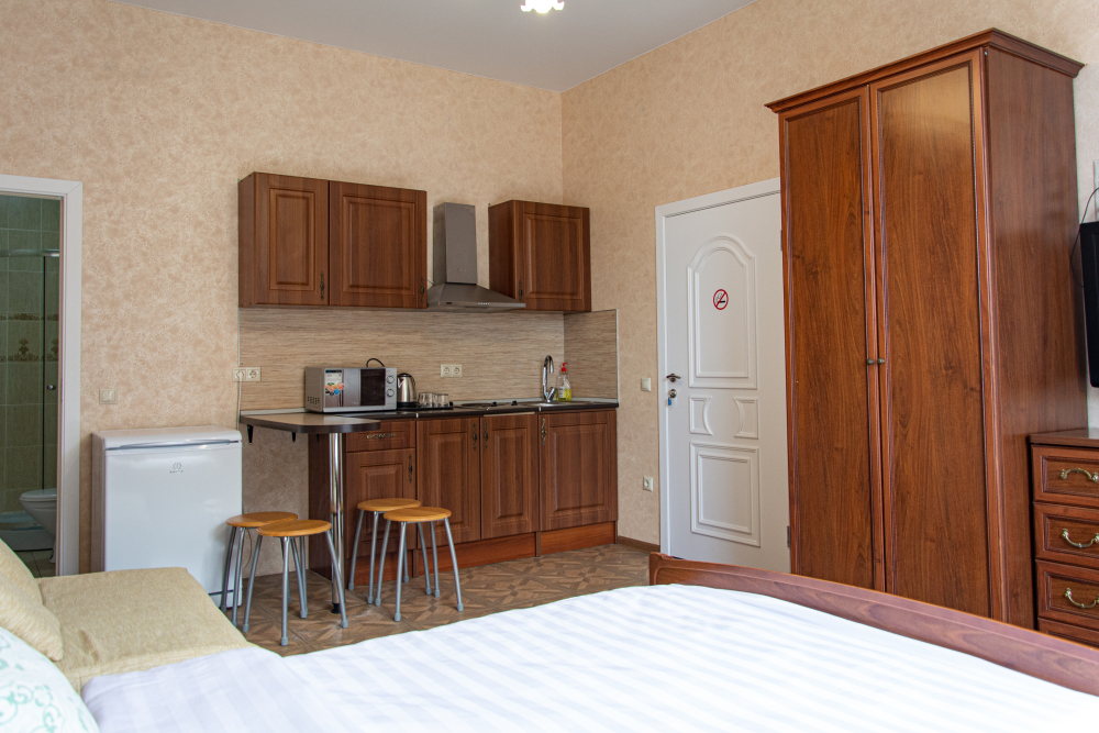 Номер Студия с полноценной кухней со всем необходимым для приготовления пищи. Возможно размещение дополнительного места на кресле-диване.