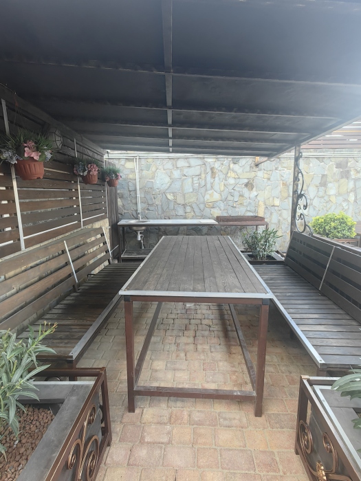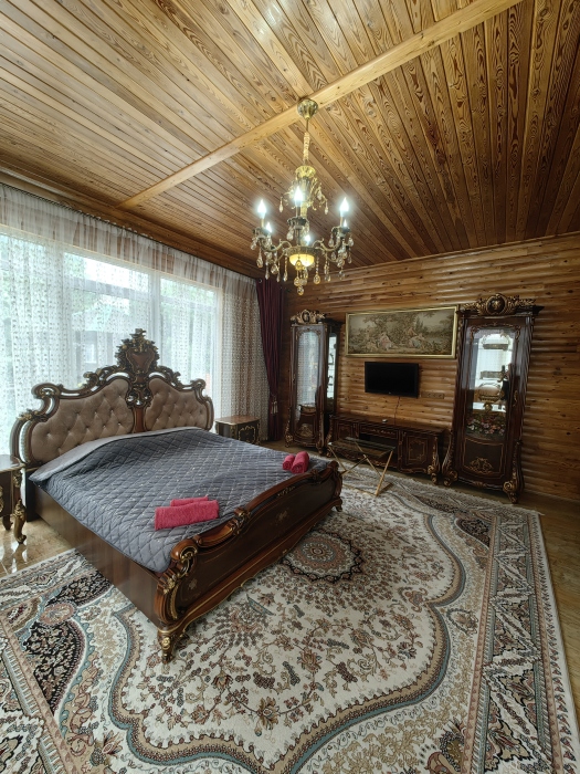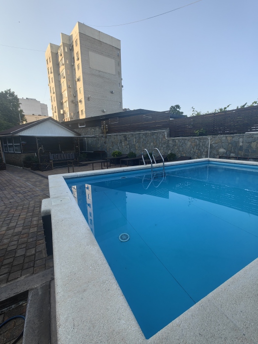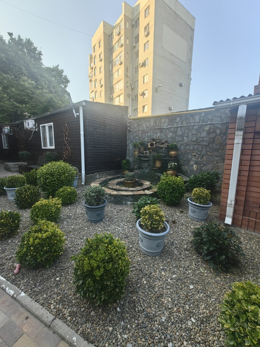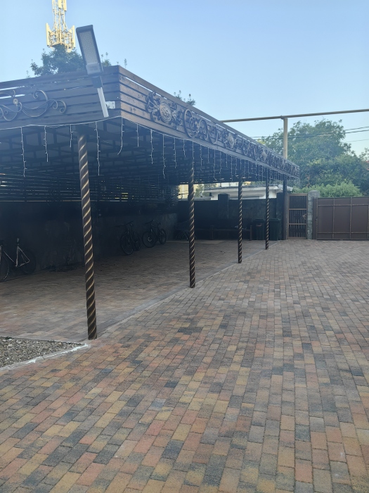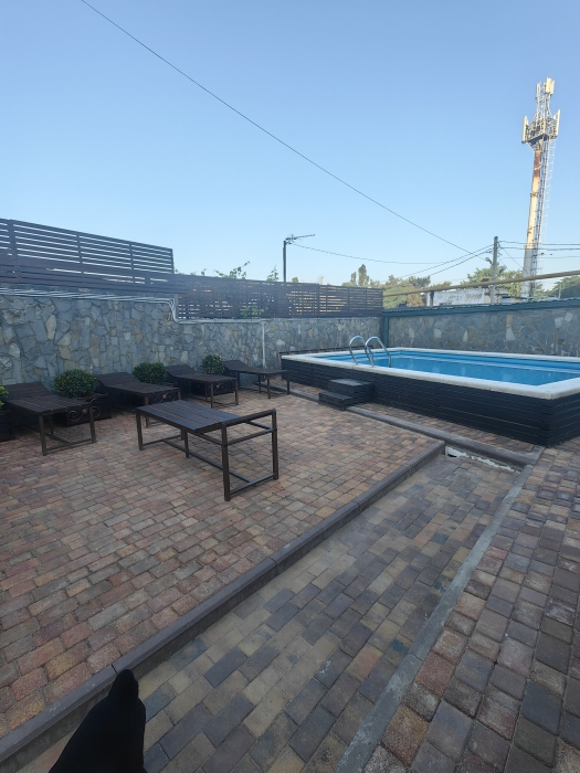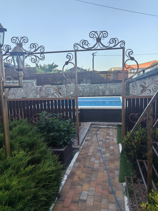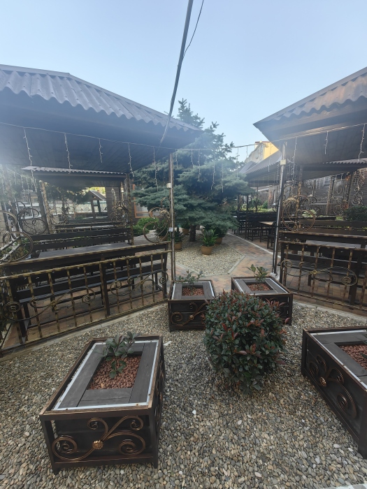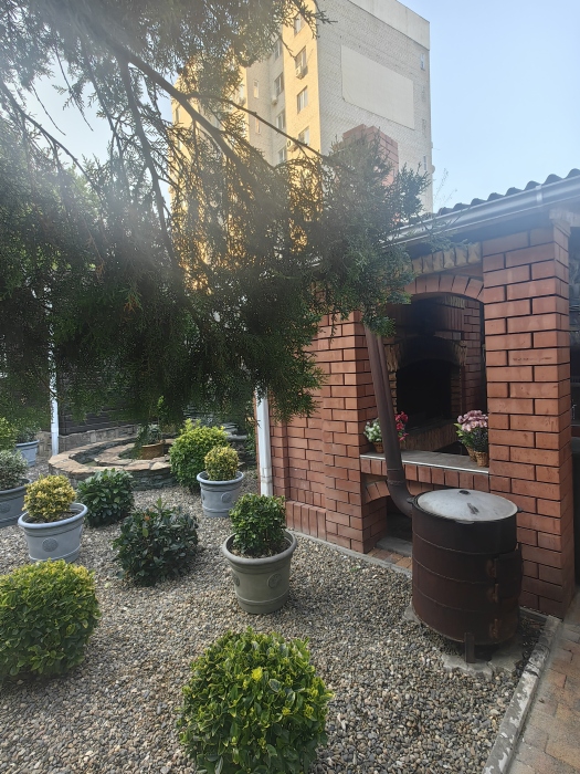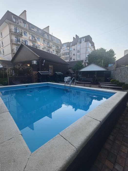 Территория просторная. Установлен бассейн, Во дворе много зелени, есть места для отдыха: шесть беседок, которые вмещают в себя до 8 человек. Для любителей блюд на углях есть 2 мангальные зоны .