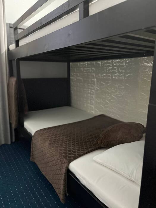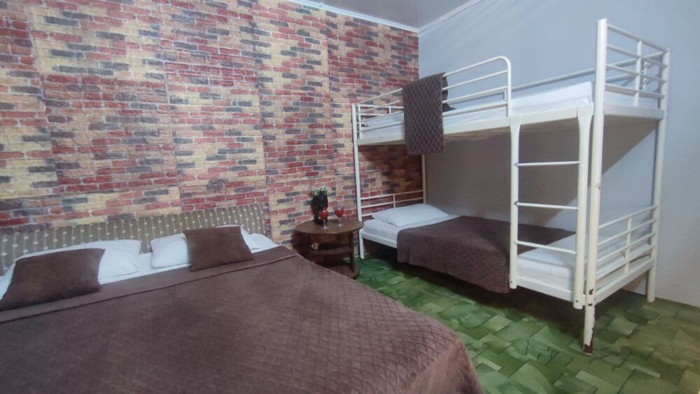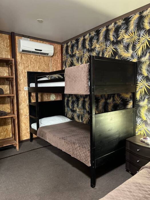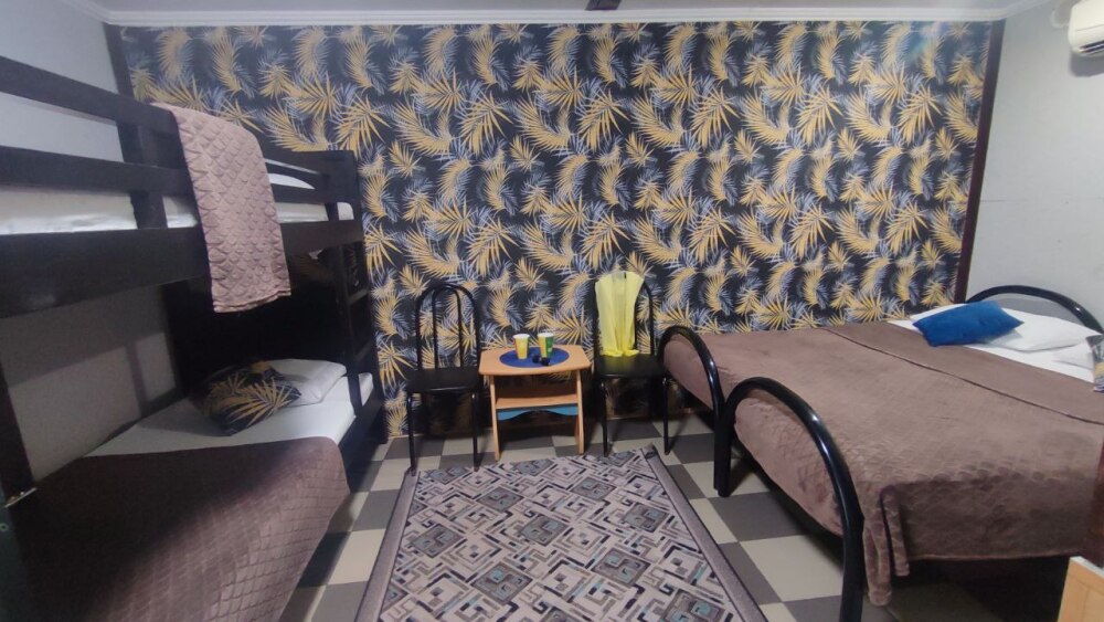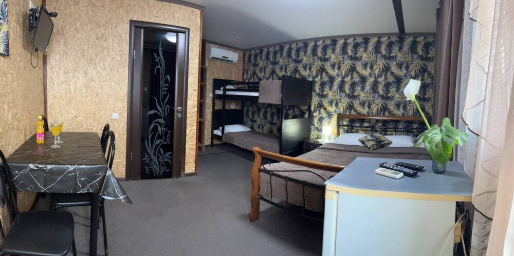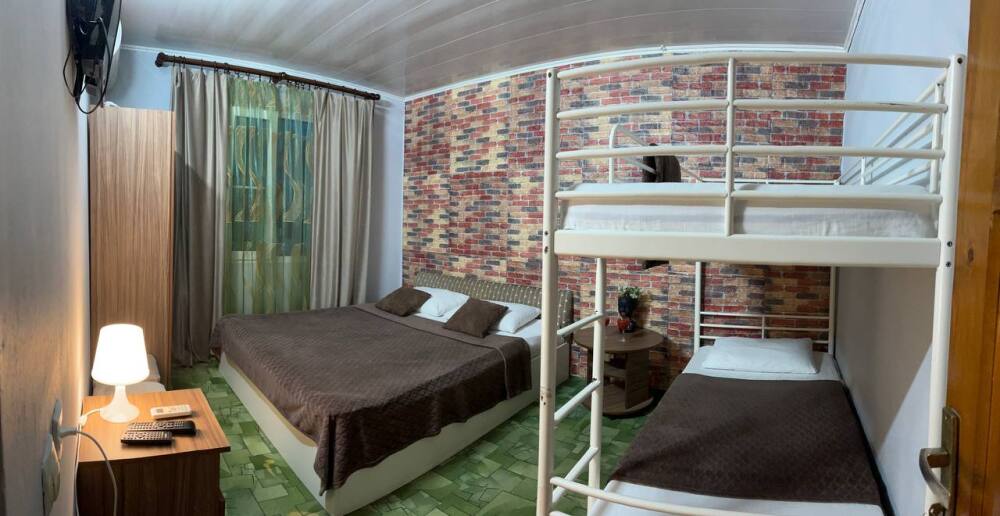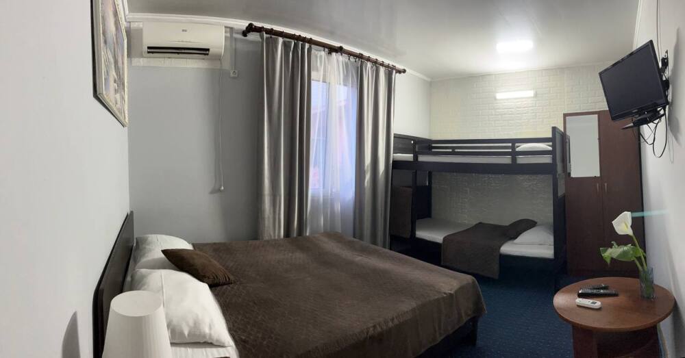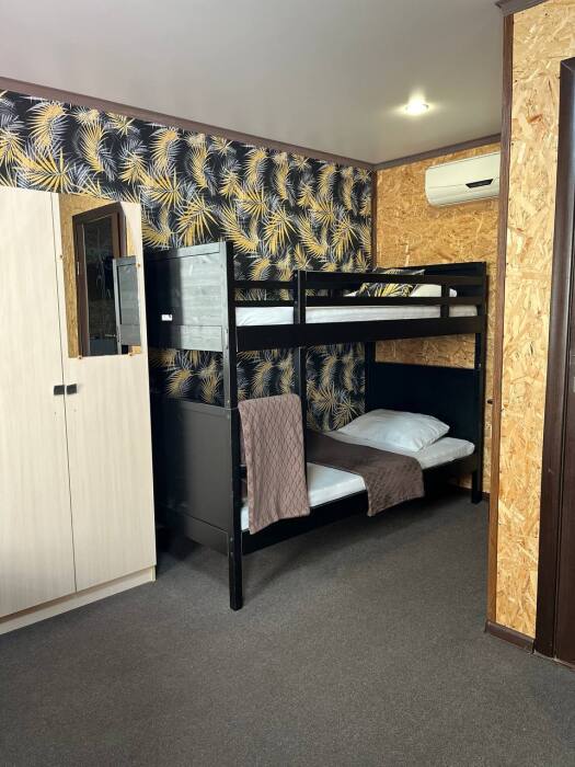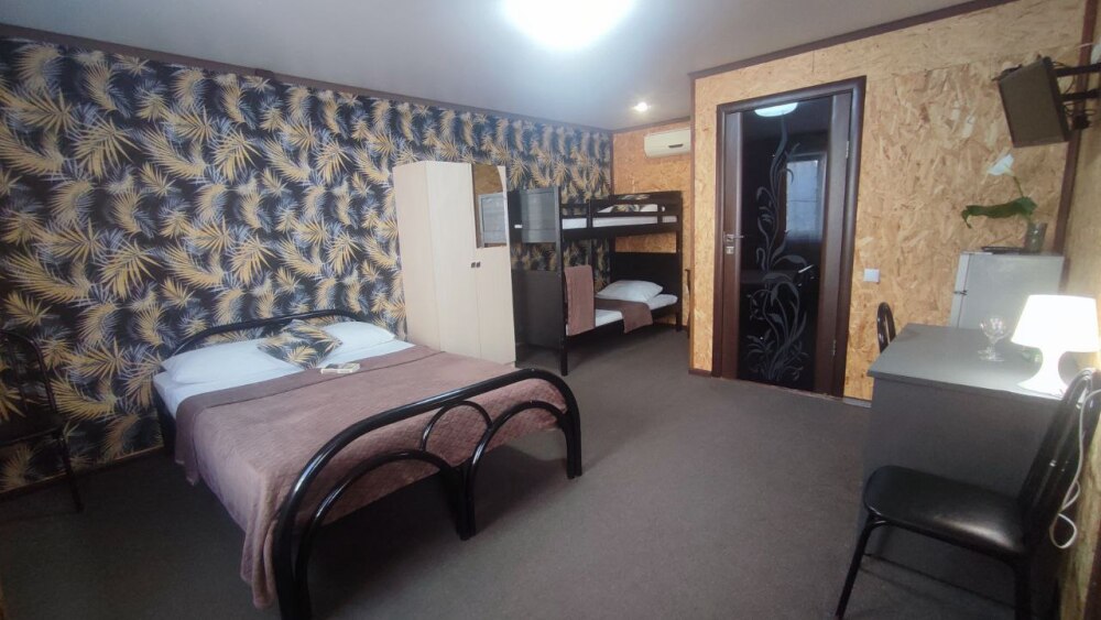 В номере двуспальная кровать, двухъярусная кровать, шкаф для одежды, зеркало, столик или тумбочка, телевизор, кондиционер.
