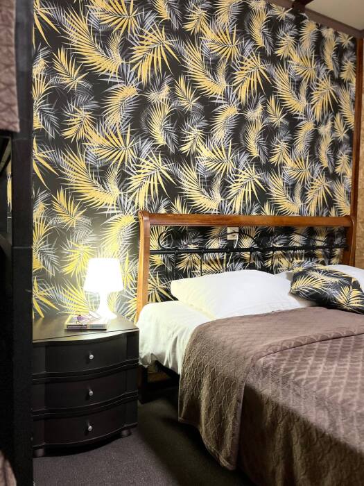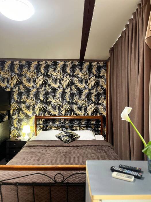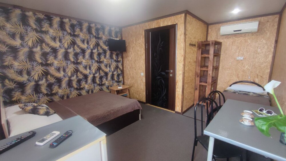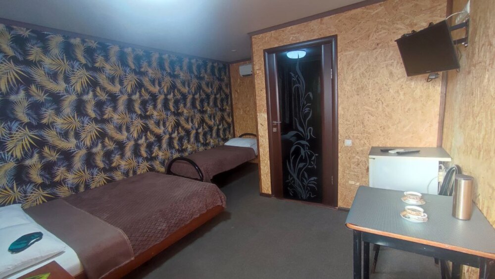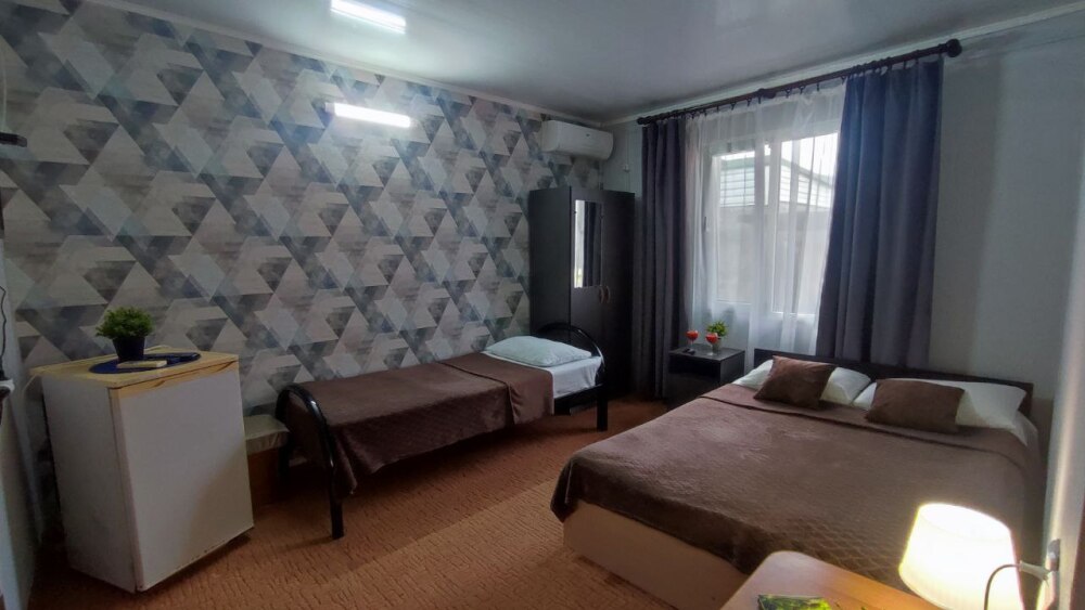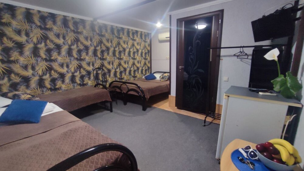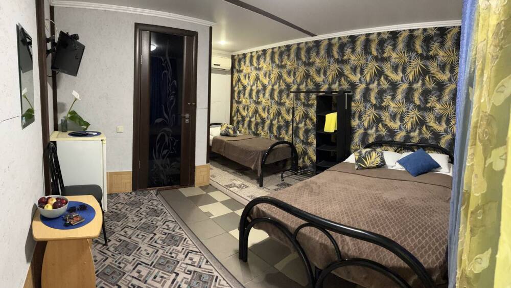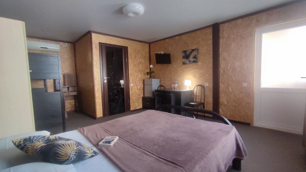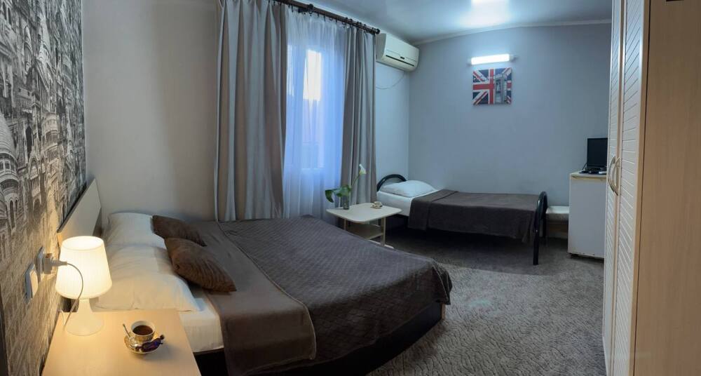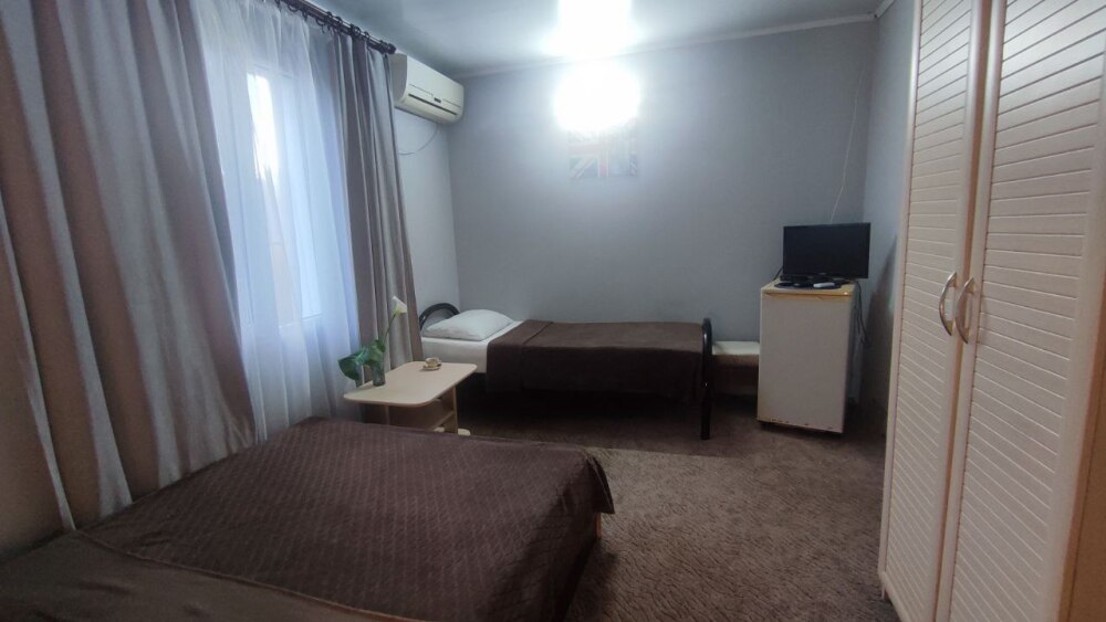В номере двуспальная кровать, односпалльная кровать, шкаф для одежды, зеркало, столик или тумбочка, телевизор, холодильник, кондиционер.