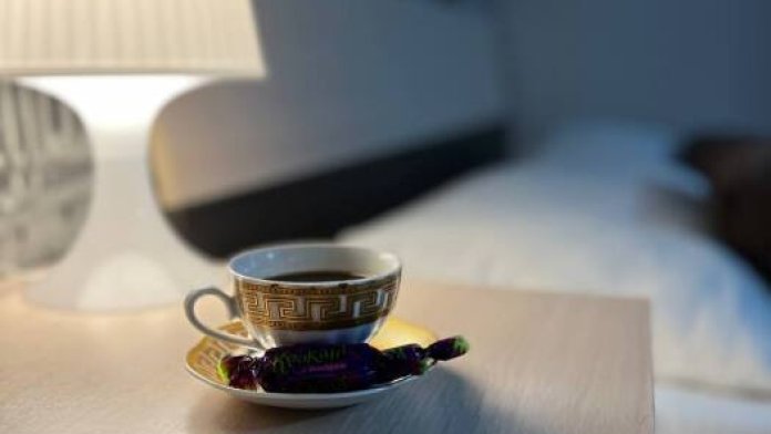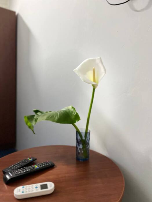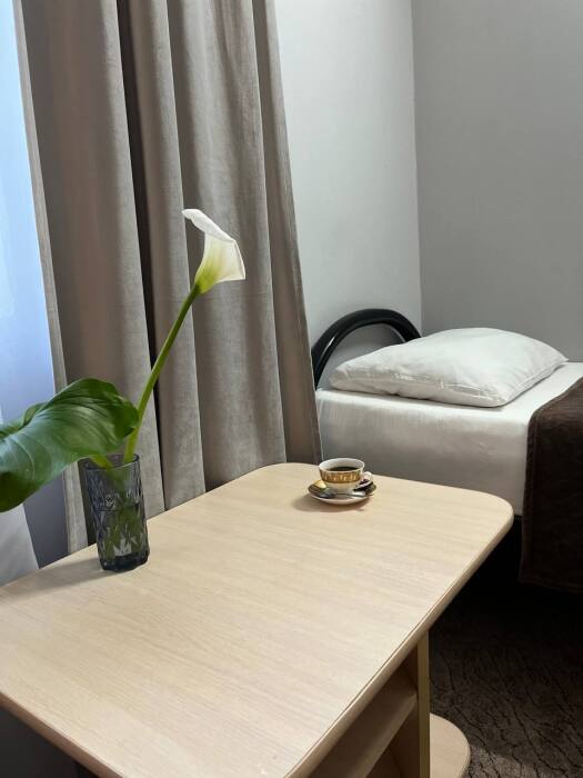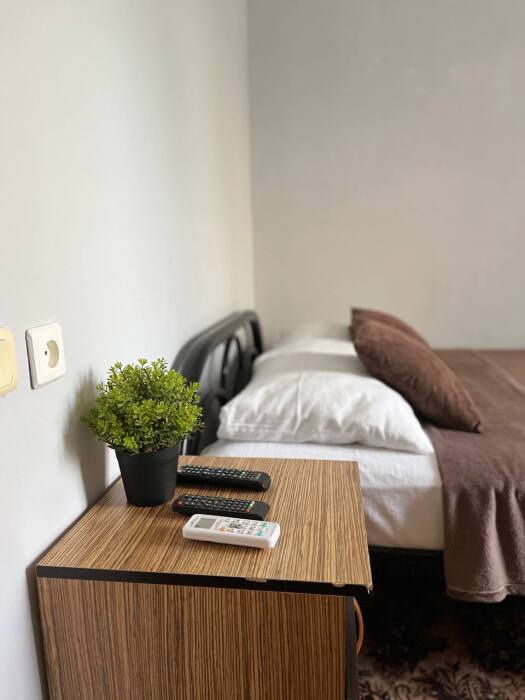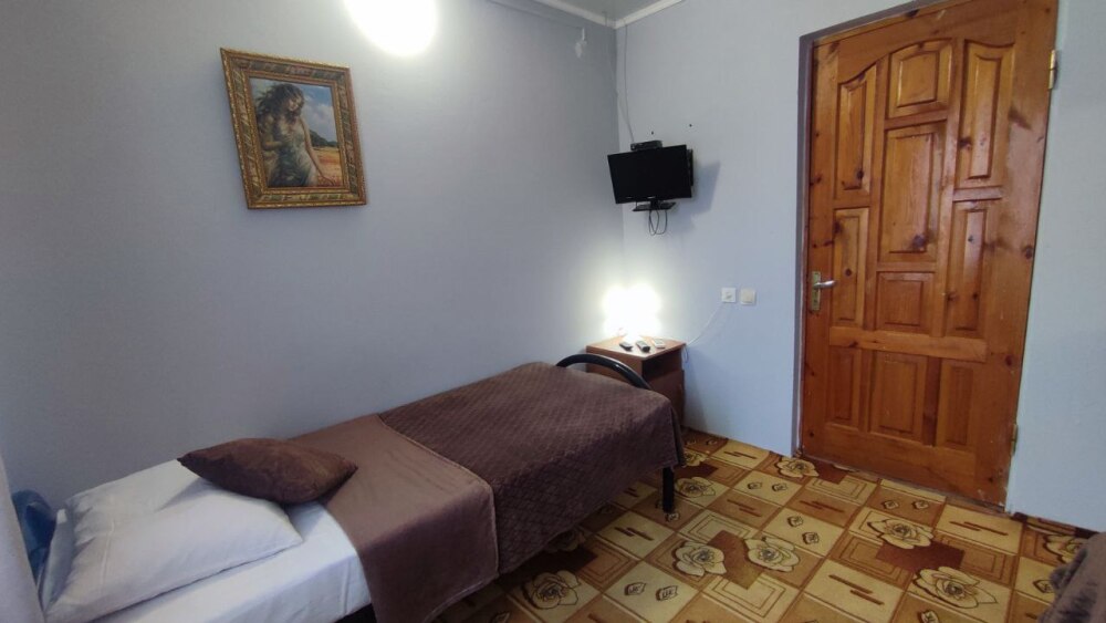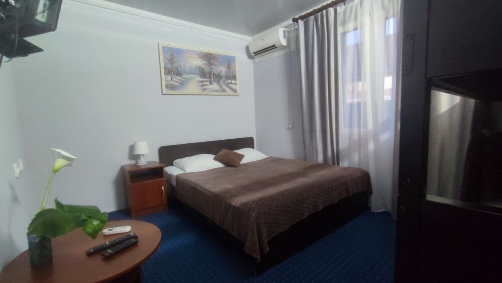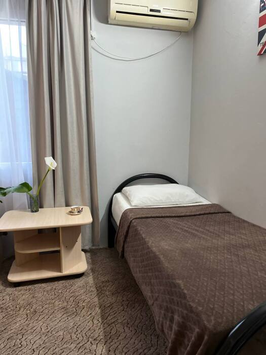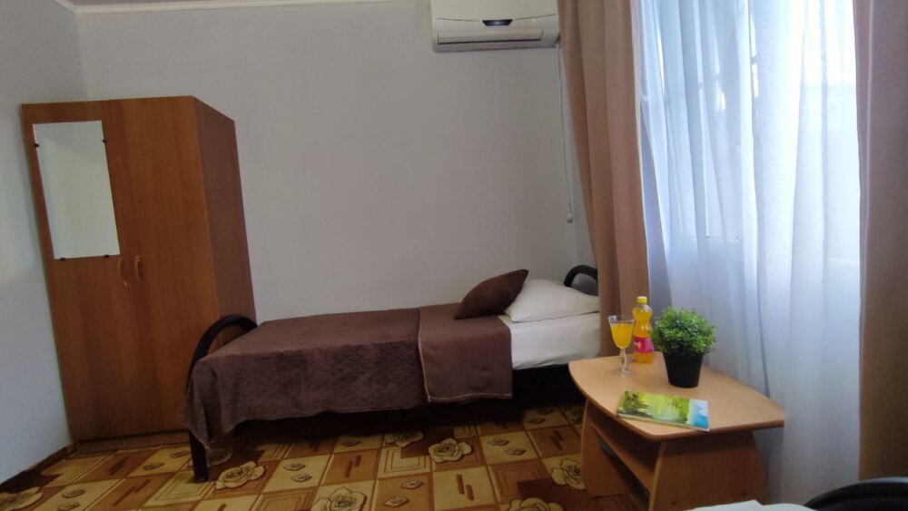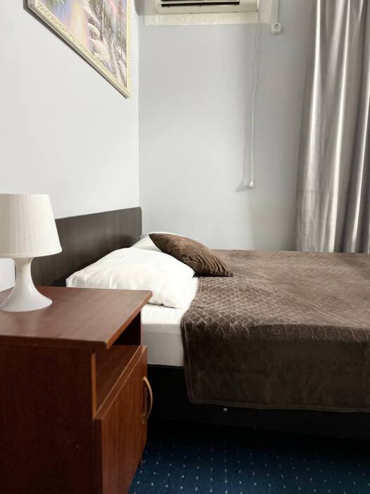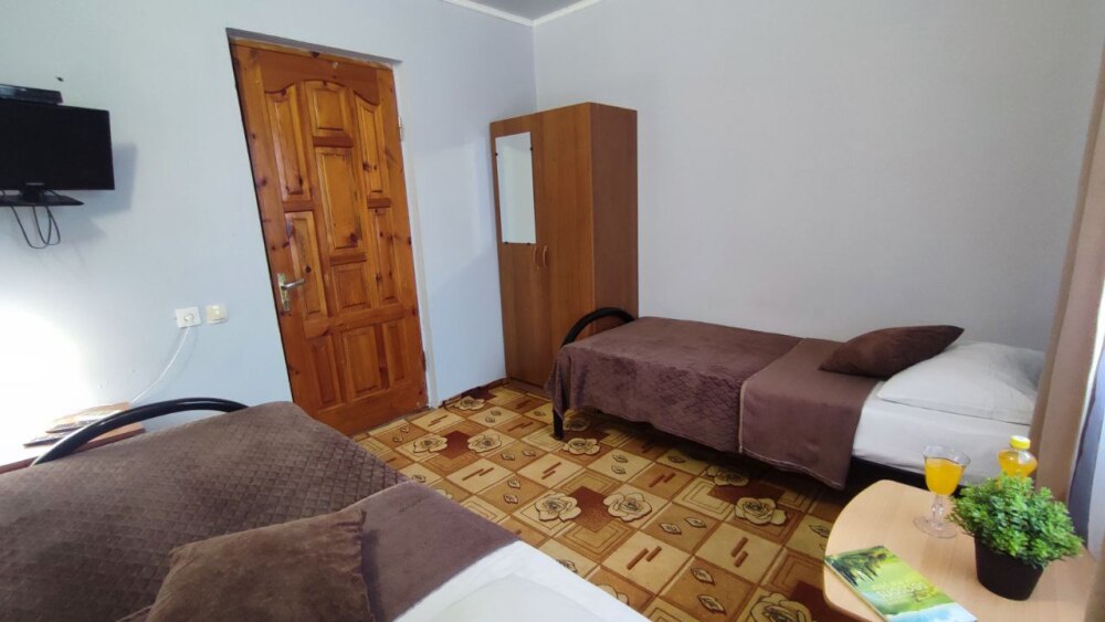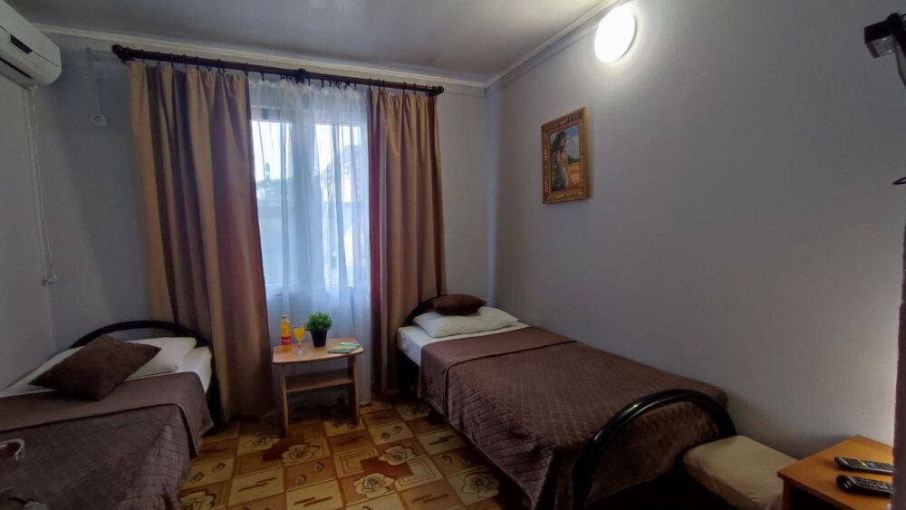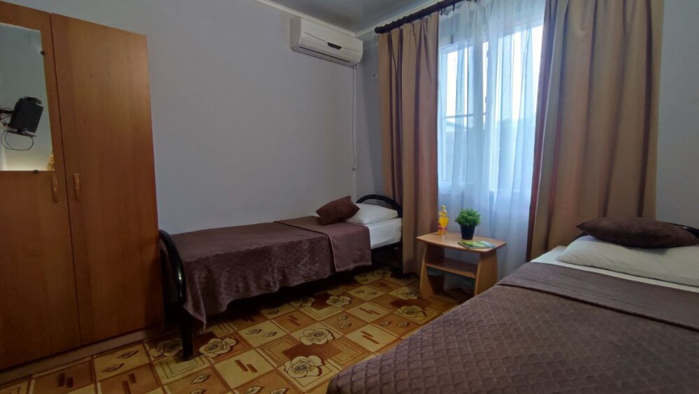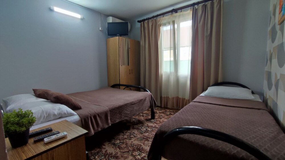 В номере две односпалльные кровати, шкаф для одежды, зеркало, столик или тумбочка, кондиционер, телевизор.