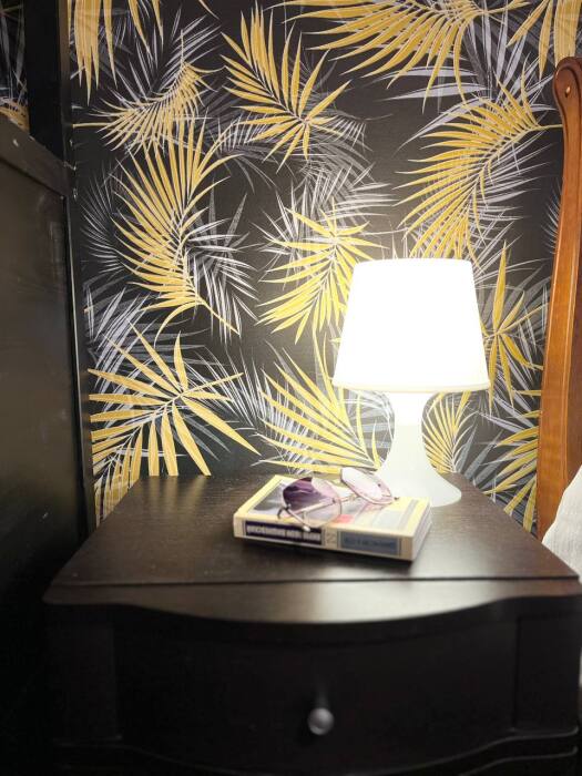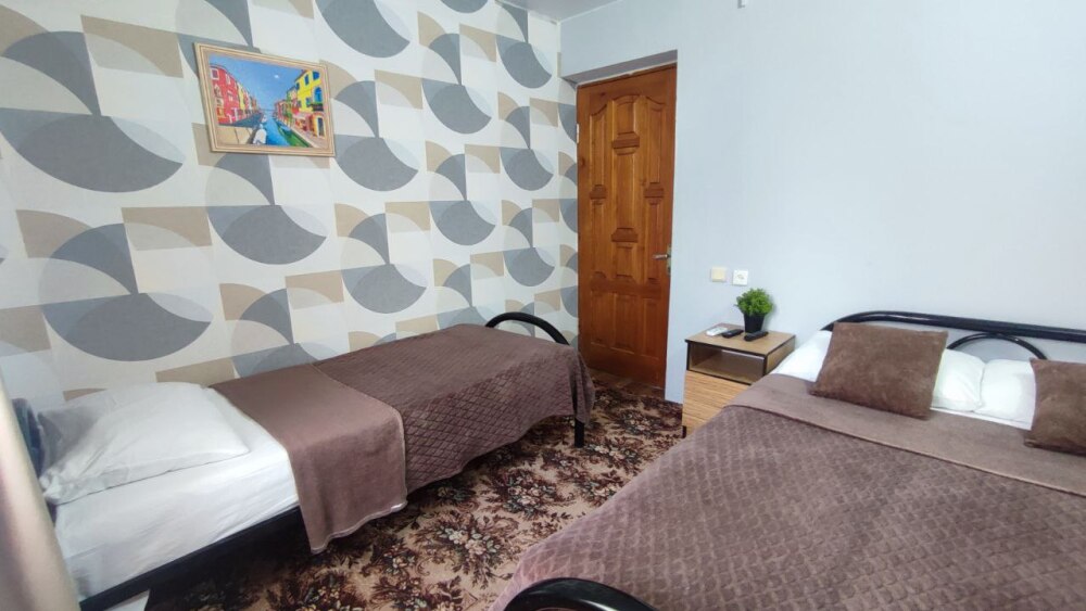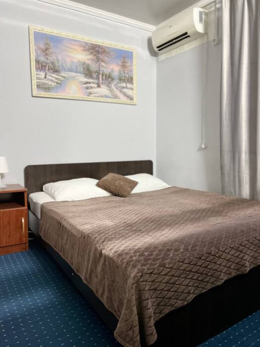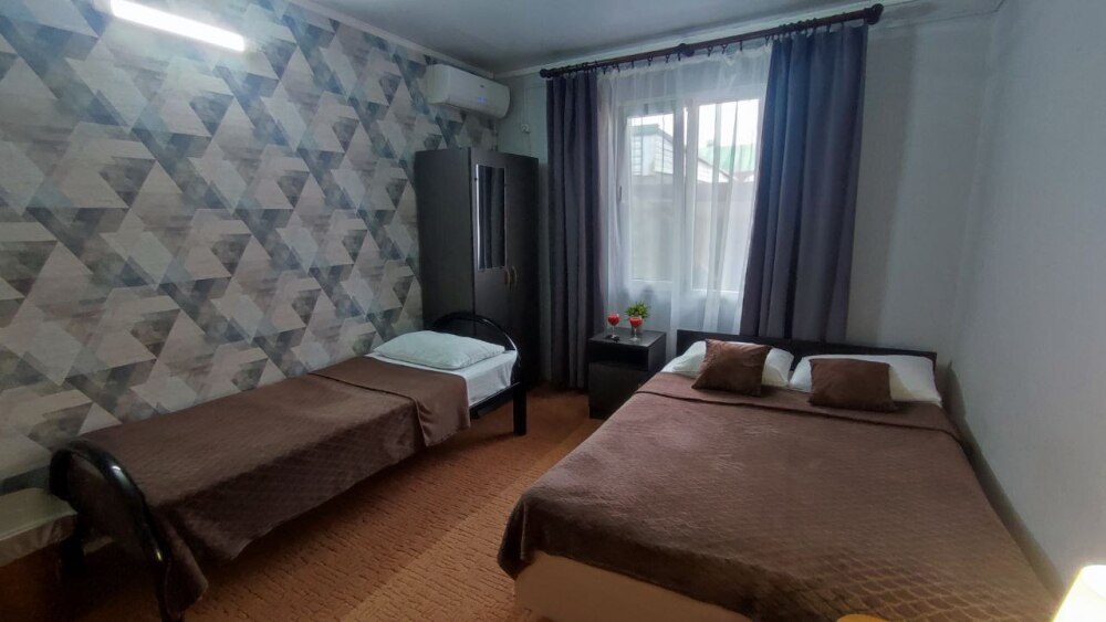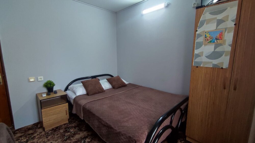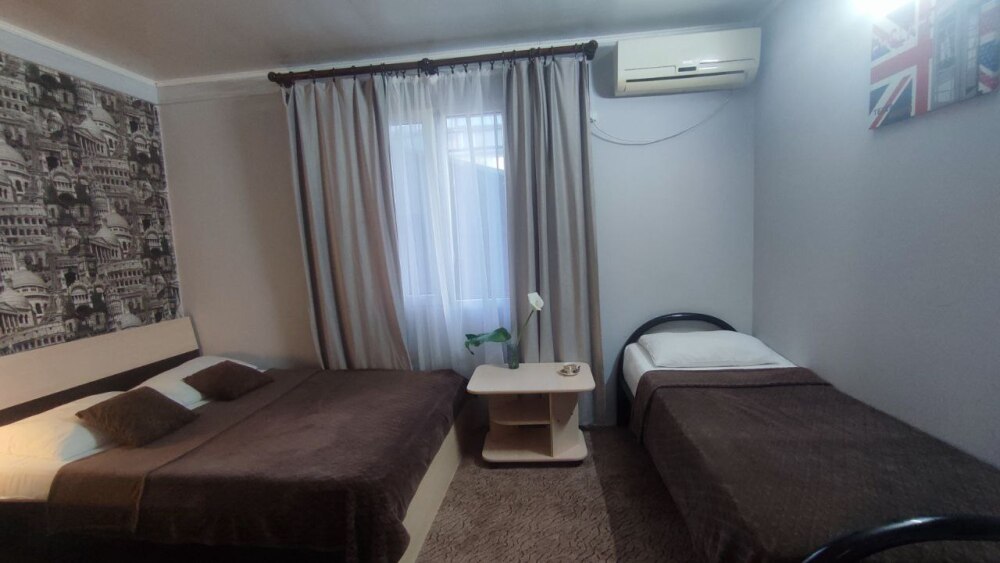 В номере двуспальная кровать, односпалльная кровать, шкаф для одежды, зеркало, столик или тумбочка, телевизор, кондиционер.
