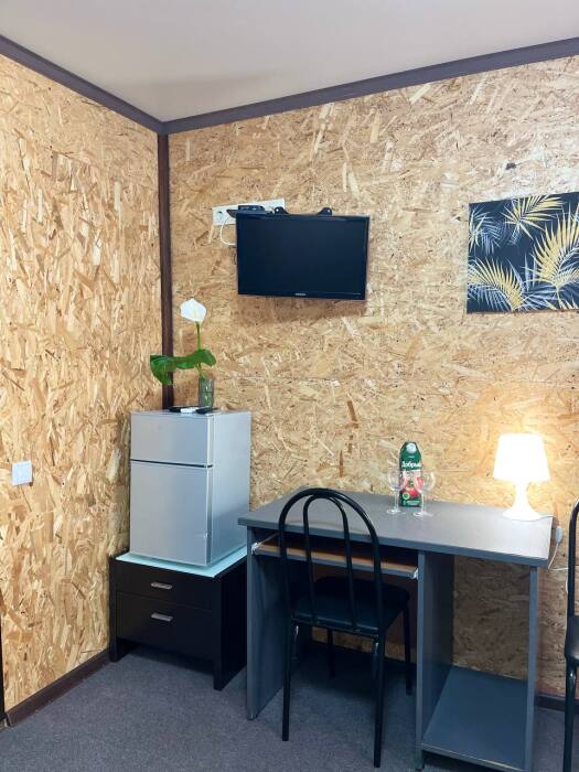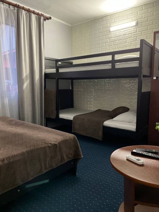 В номере: двухспальная кровать, двухъярусная кровать, шкаф для одежды, журнальный столик или тумбочка, зеркало, телевизор, холодильник, кондиционер, ванная комната с санузлом, укомплектован гигиеническими средствами.