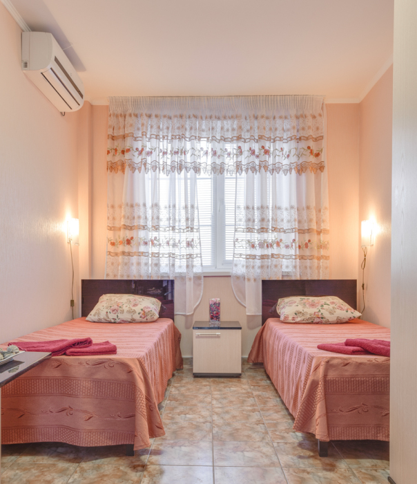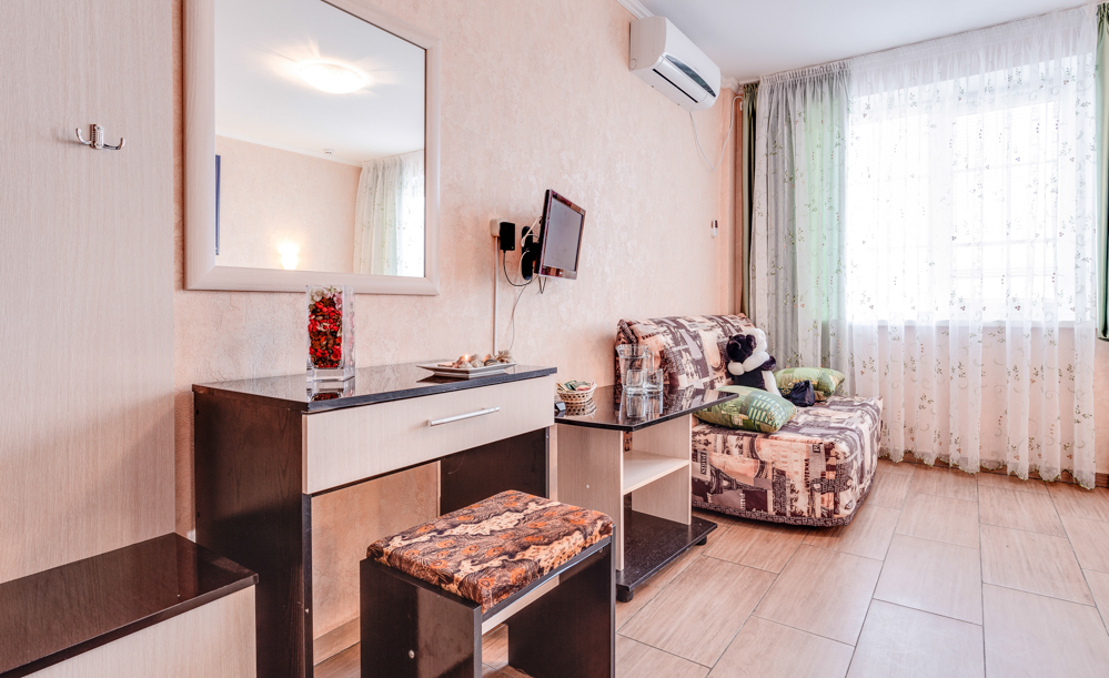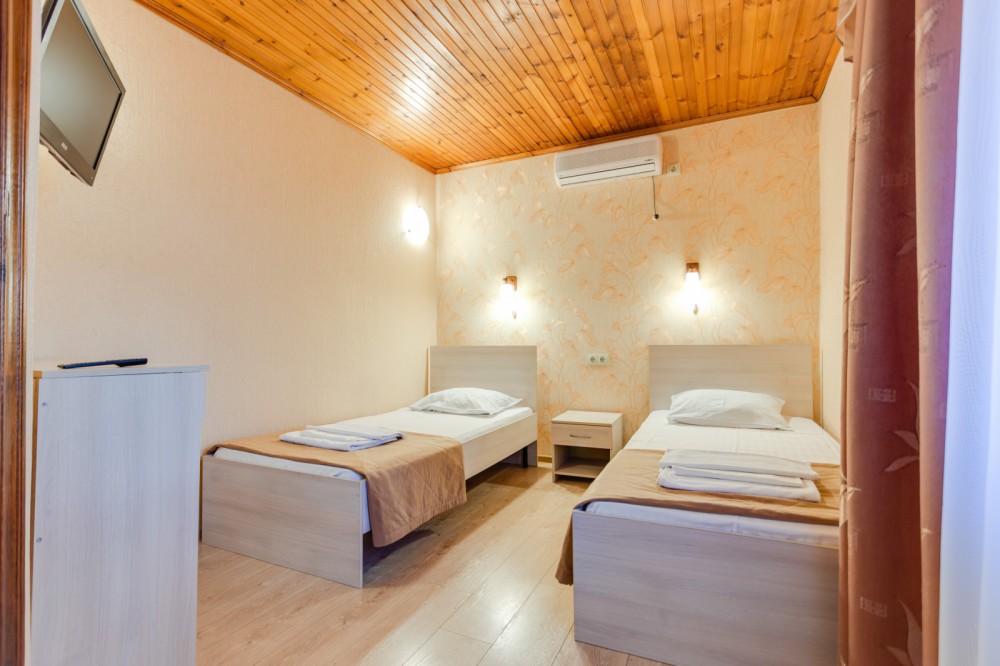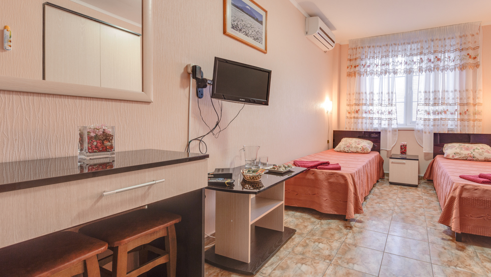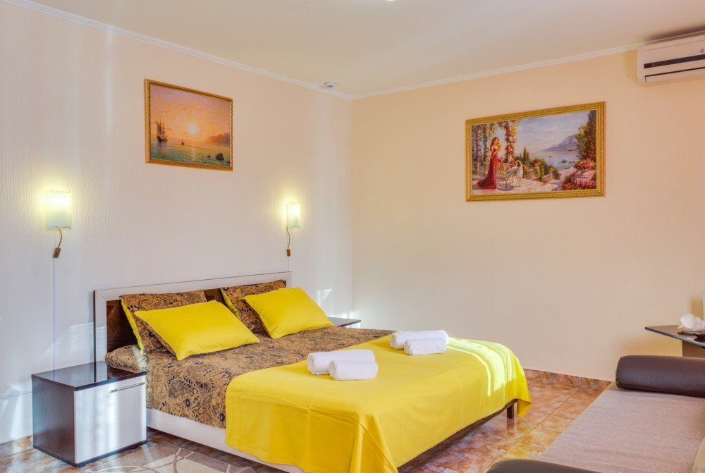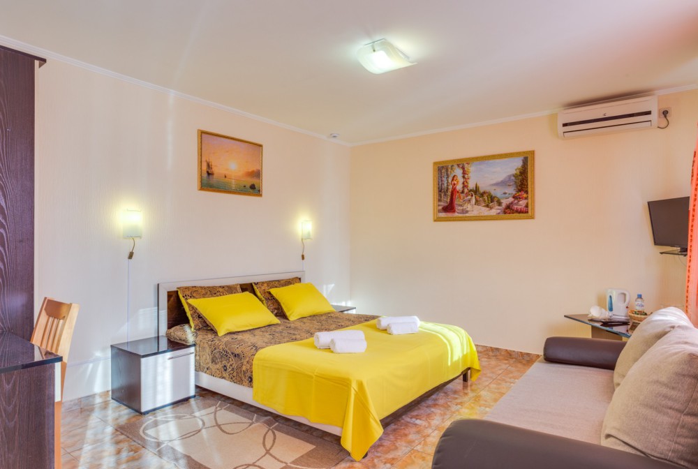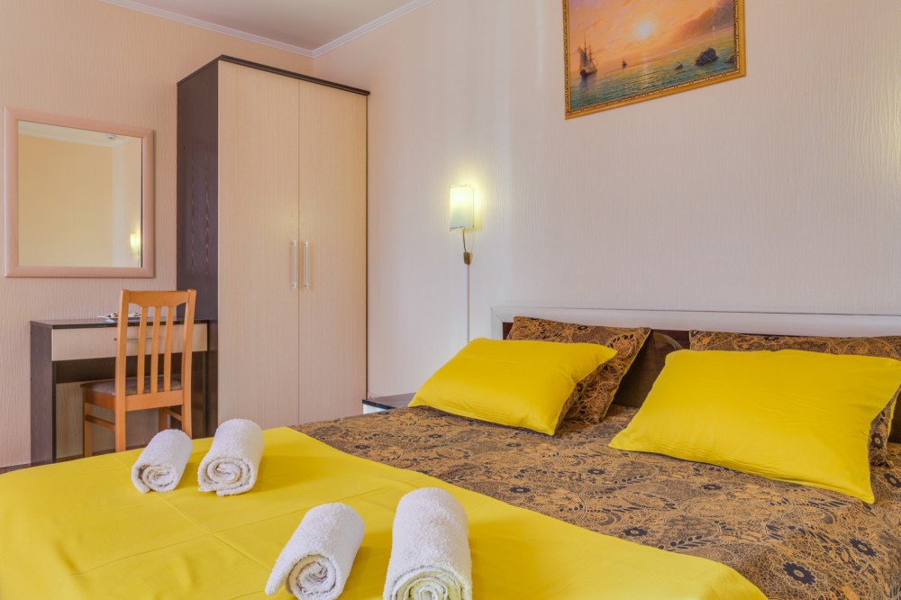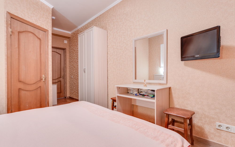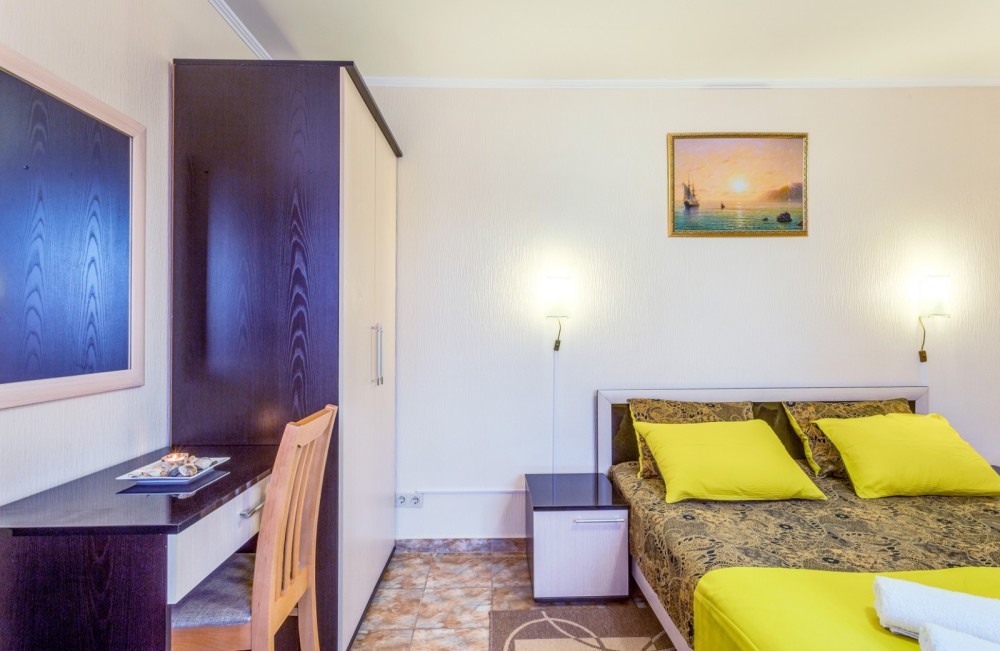 В номере двухспальная или 2-односпальные кровати, прикроватные тумбочки, шкаф, туалетный столик, цифровое тв, холодильник, чайник, сейф, кондиционер, все удобства в номере. Размещение 2-4 человек.