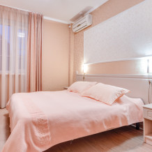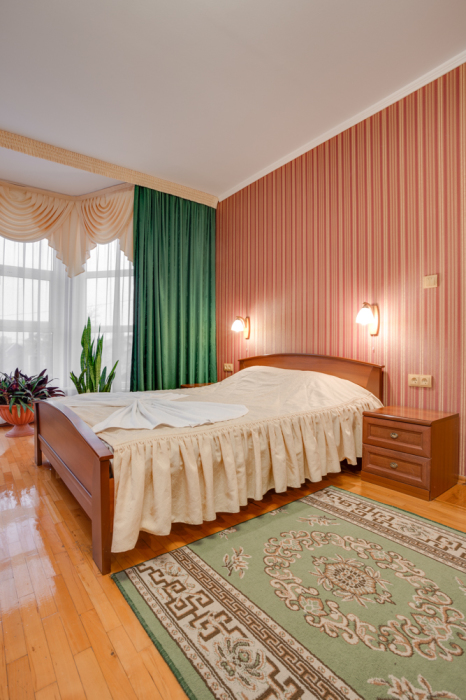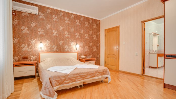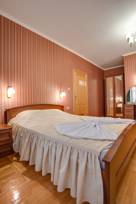 В номере двухспальная или 2 односпальные кровати, прикроватные тумбочки, шкаф, туалетный столик, сейф