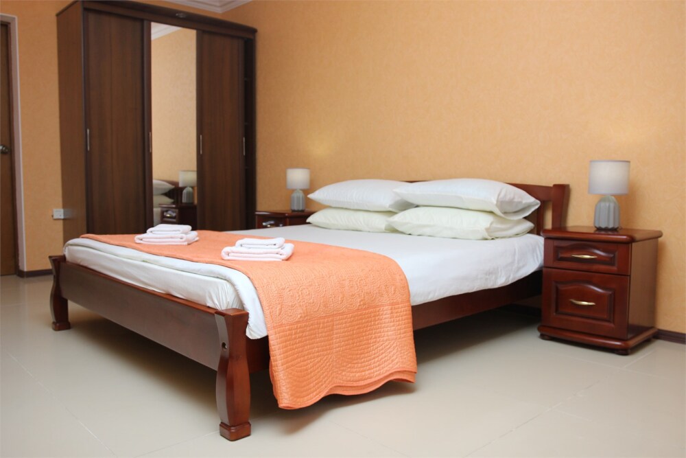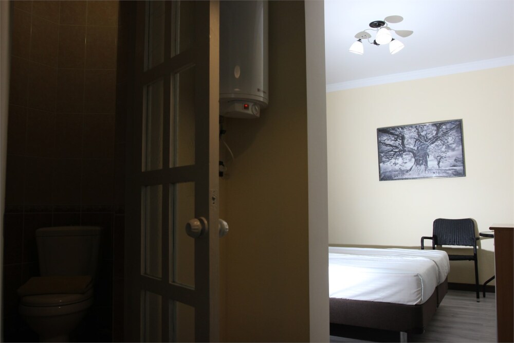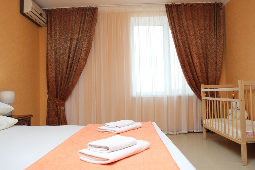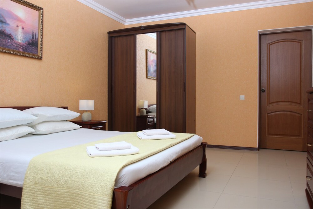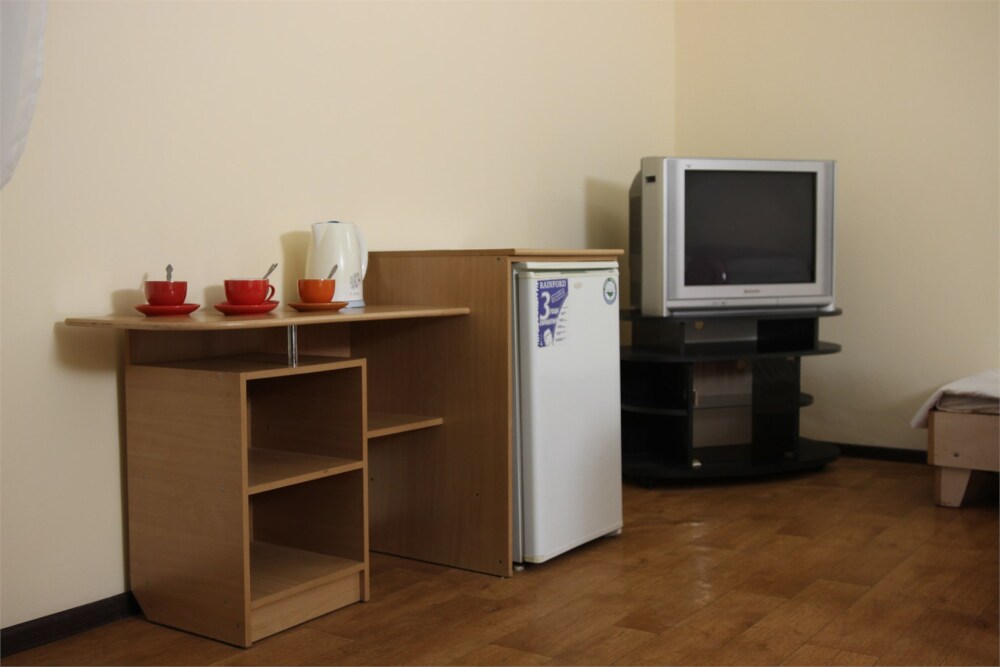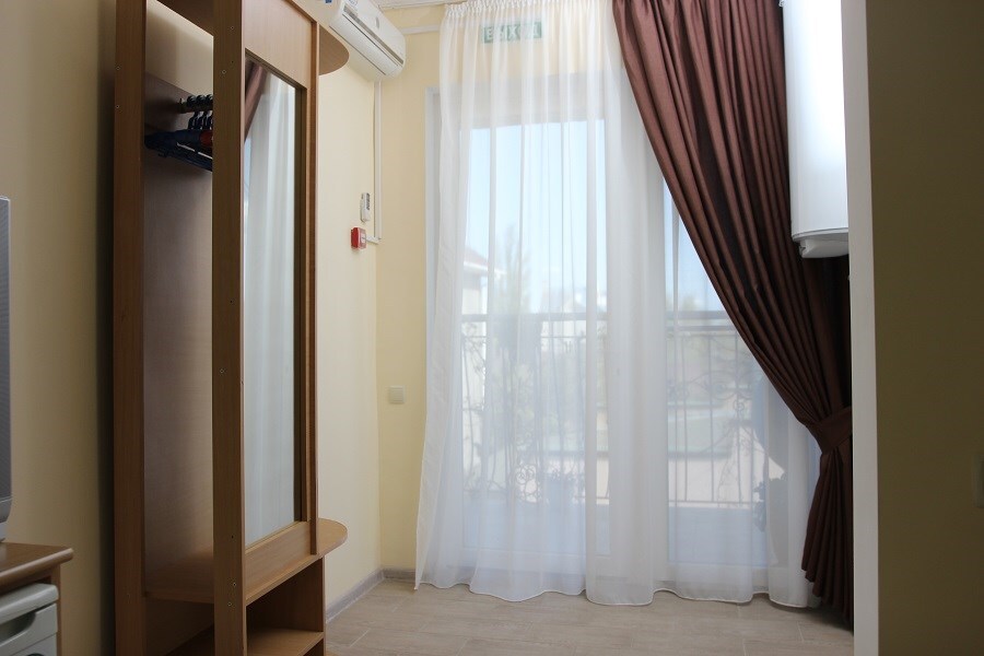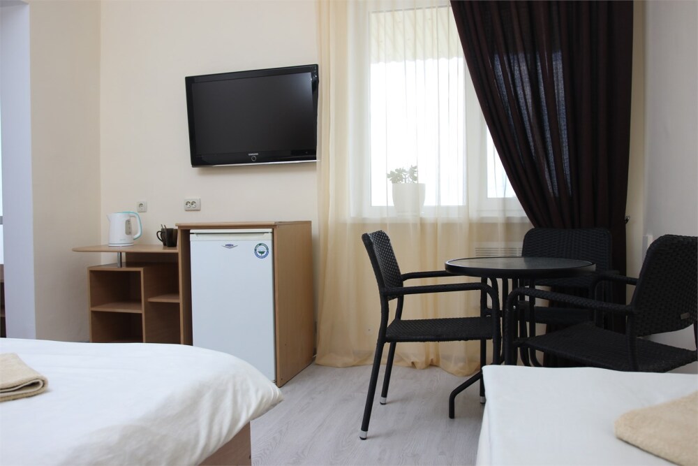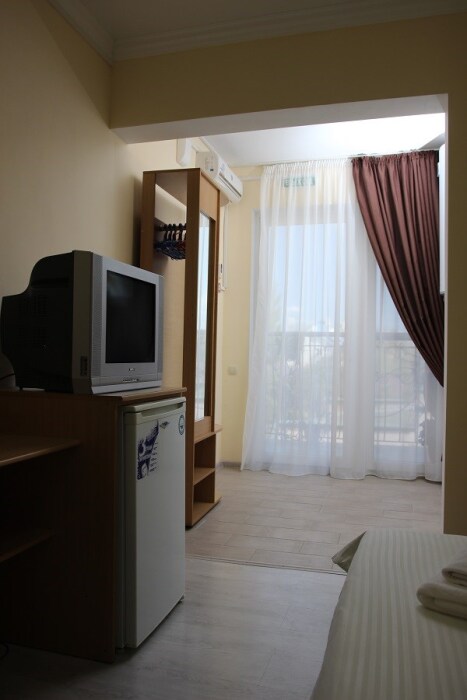 Вход в номер осуществляется с проходного балкона (у каждого гостя есть своя часть балкона для отдыха). В номере: телевизор, холодильник, кондиционер, шкаф-купе, стол, стулья, чайник, печь свч, санузел, горячая/холодная вода круглосуточно, душ. Смена полотенец и первая уборка номера происходят на 3й день проживания. Смена постельного белья, полотенец и уборка происходят на 6й день проживания. Отопление: кондиционер, электробатарея. На кроватях ортопедические матрасы. Возможна трансформация двуспальной кровати в две односпальные.
