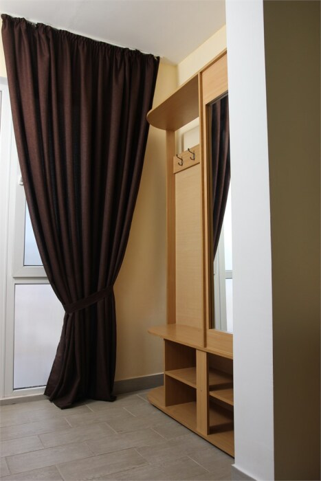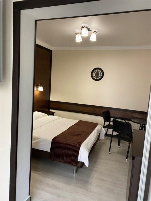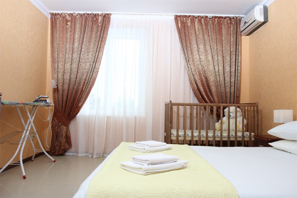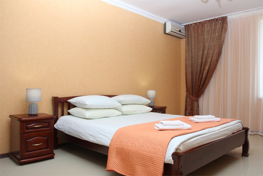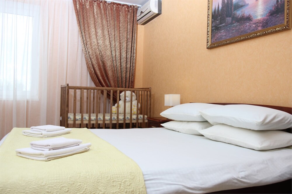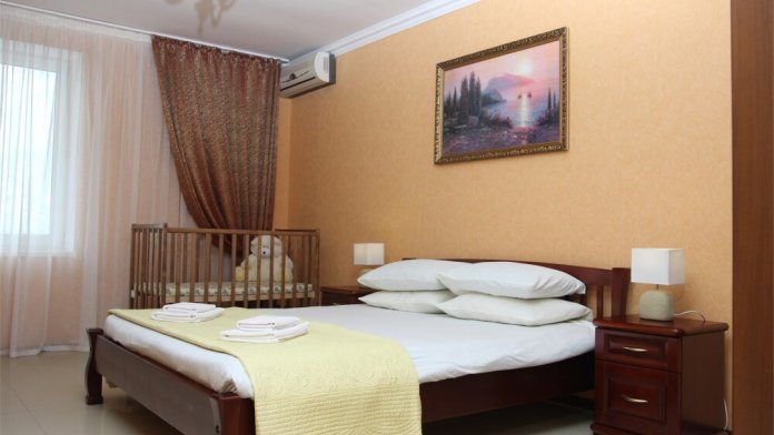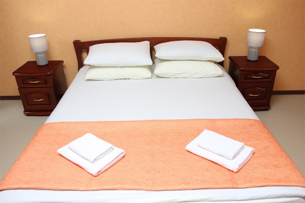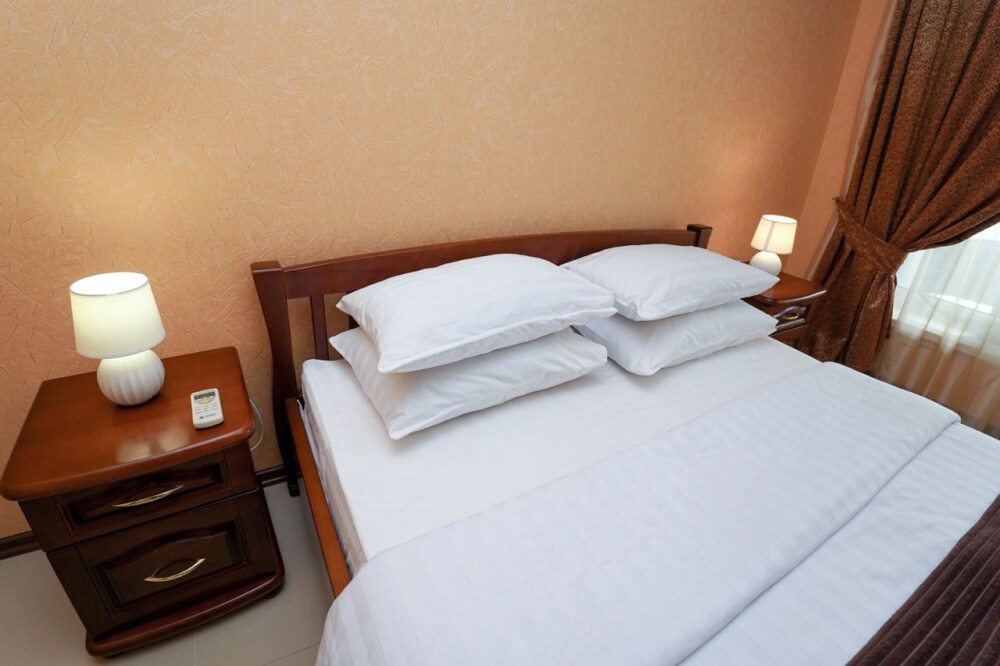 Вход в номер осуществляется с проходного балкона (у каждого гостя есть своя часть балкона для отдыха). В номере: телевизор, холодильник, кондиционер, шкаф-купе, стол, стулья, чайник, печь свч, санузел, горячая/холодная вода круглосуточно, душ. Смена полотенец и первая уборка номера происходят на 3й день проживания. Смена постельного белья, полотенец и уборка происходят на 6й день проживания. Отопление: кондиционер, электробатарея. На кроватях ортопедические матрасы. Возможна трансформация двуспальной кровати в две односпальные.