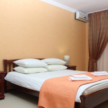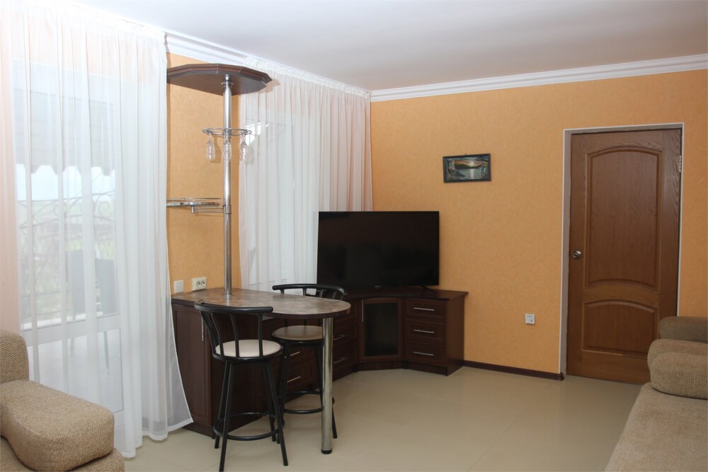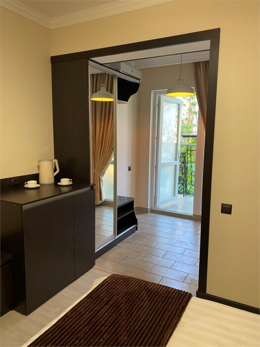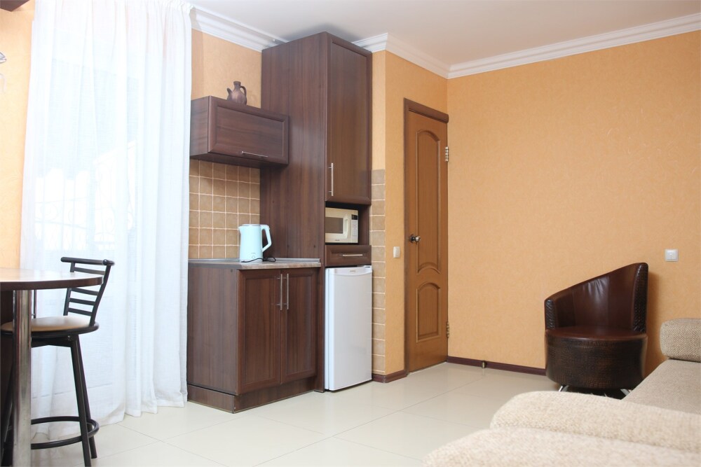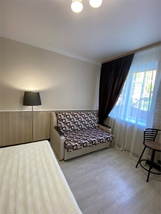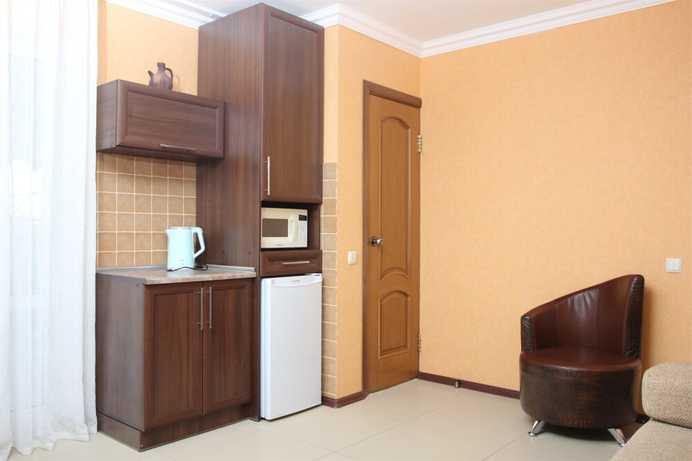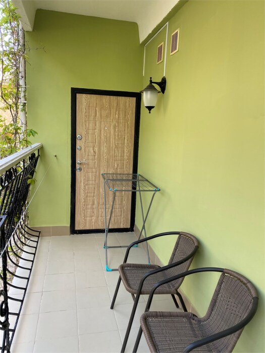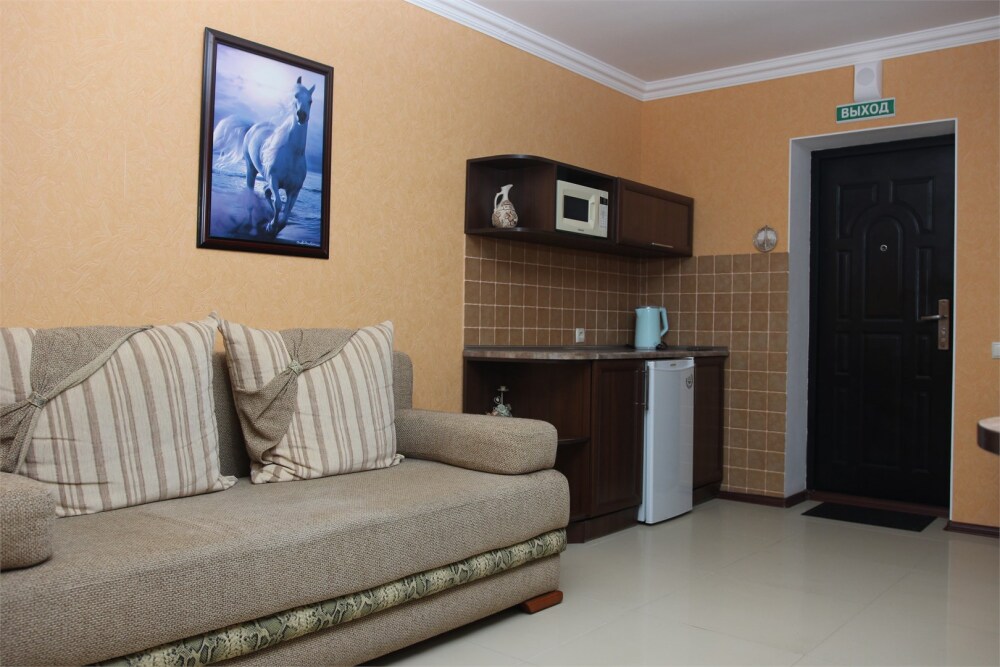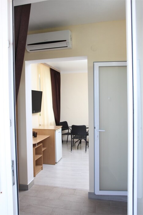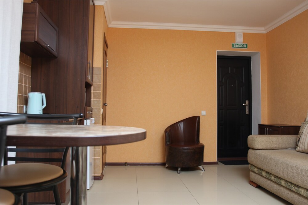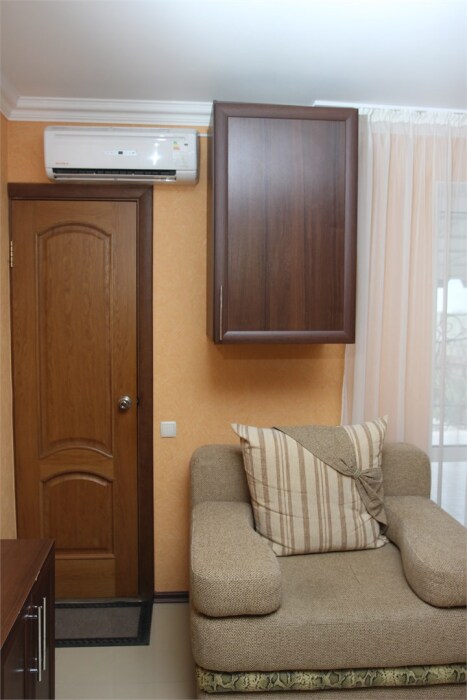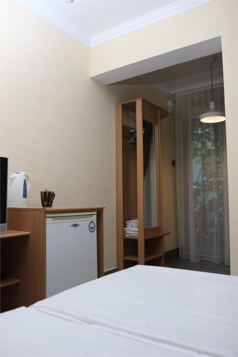В номере отдельный балкон с ротанговой мебелью, вход в номер осуществляется с балкона. В номере: телевизор, холодильник, кондиционер, шкаф-купе, стол, стулья, чайник, печь свч, мини-кухня, куллер с водой, санузел, горячая/холодная вода круглосуточно, душ, тапочки. Смена полотенец и первая уборка номера происходят на 3-й день проживания. Смена постельного белья, полотенец и уборка происходят на 6й день проживания. Отопление: кондиционер и электробатарея. На кроватях ортопедические матрасы. Возможна трансформация двуспальной кровати в две односпальные. Полуторный диван.