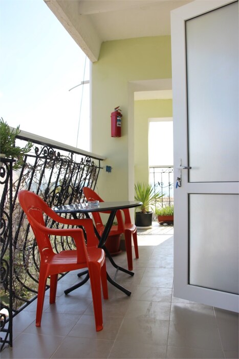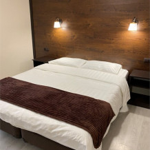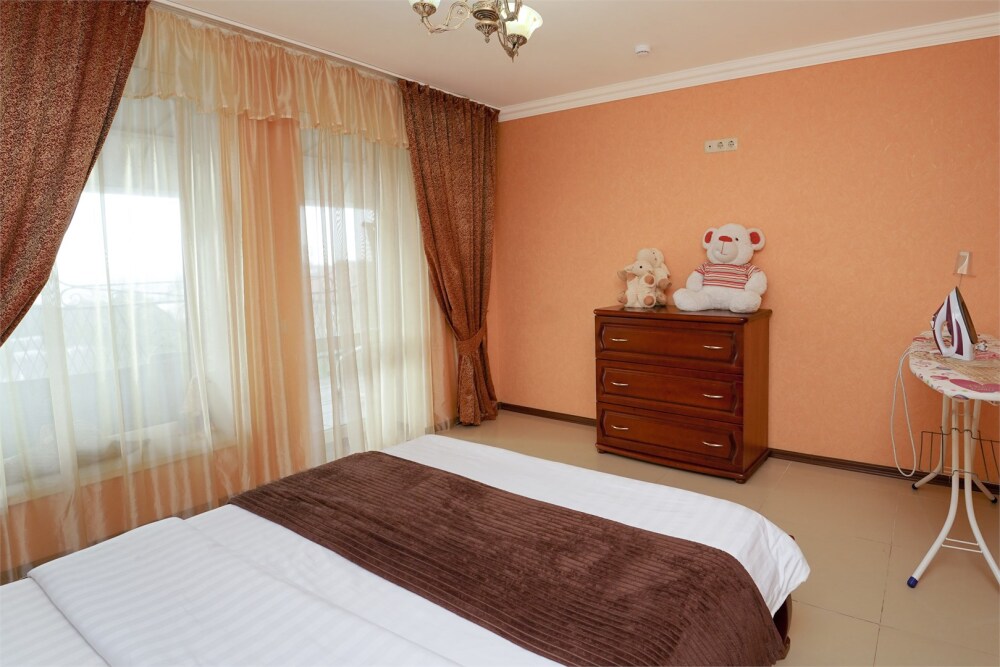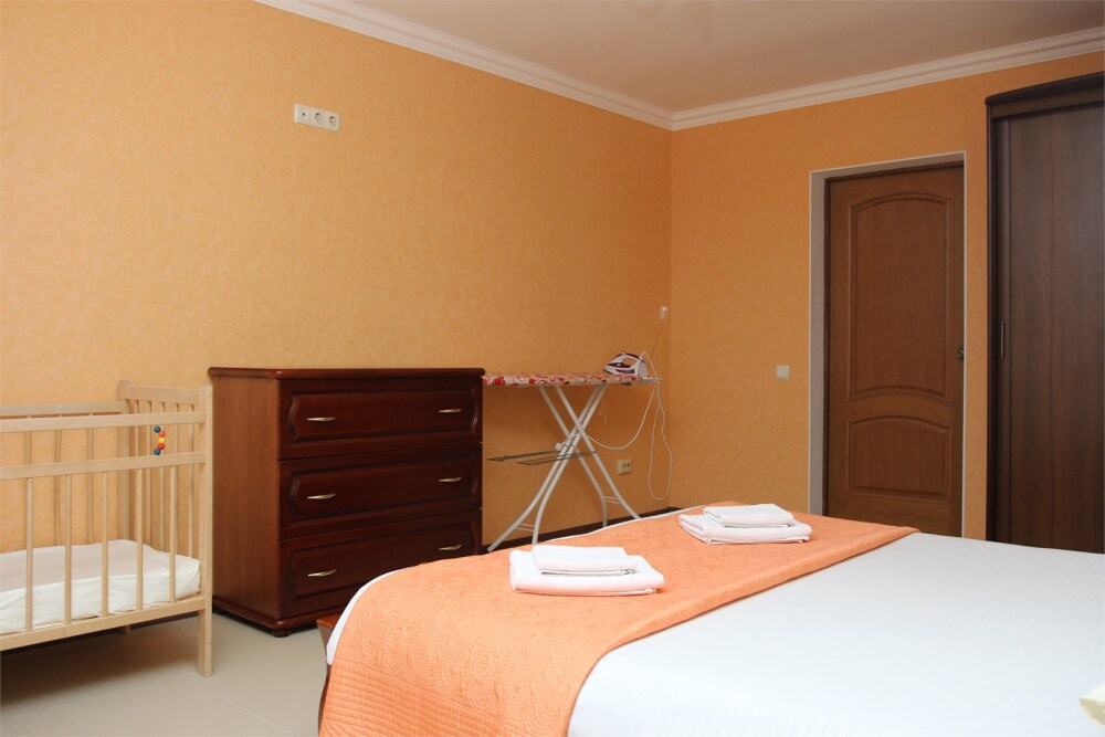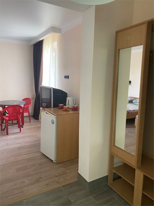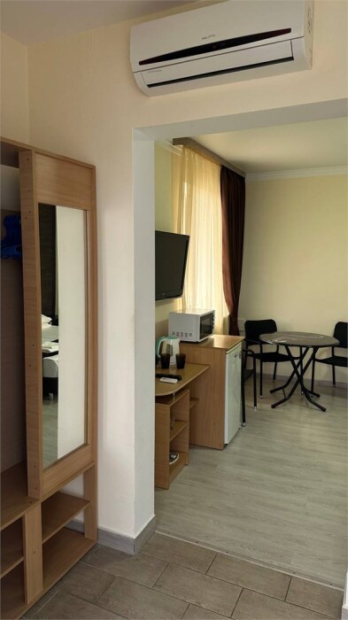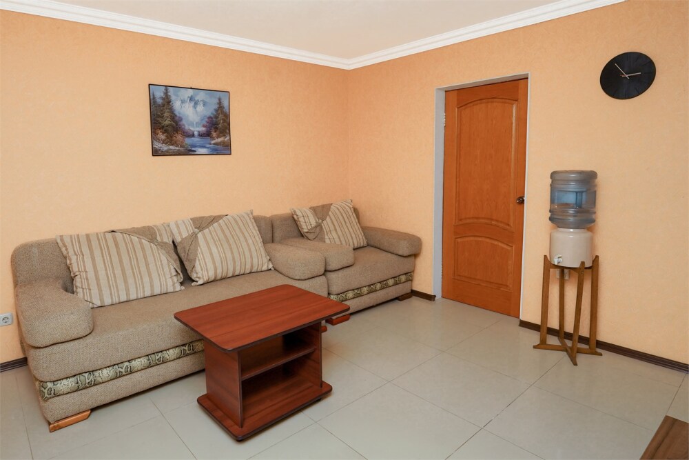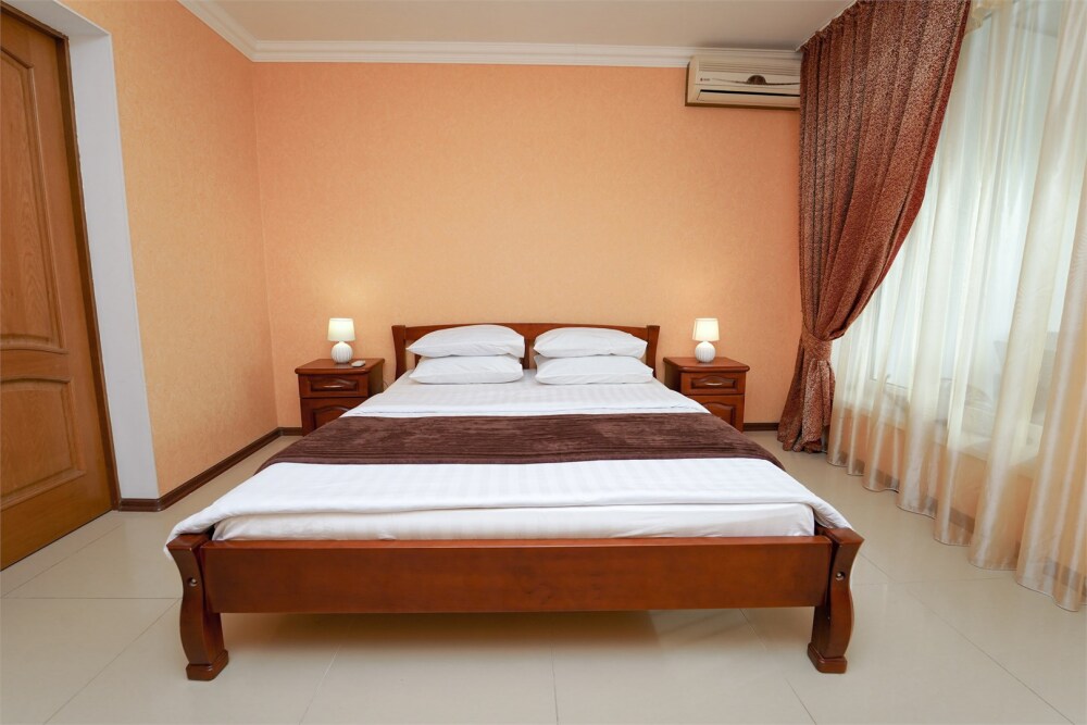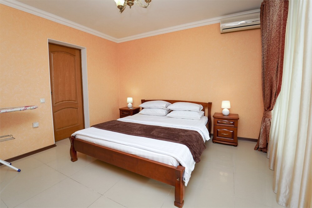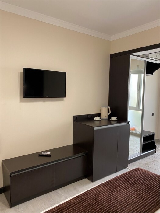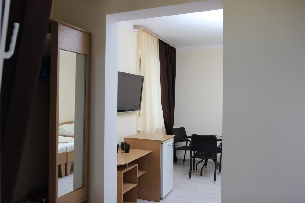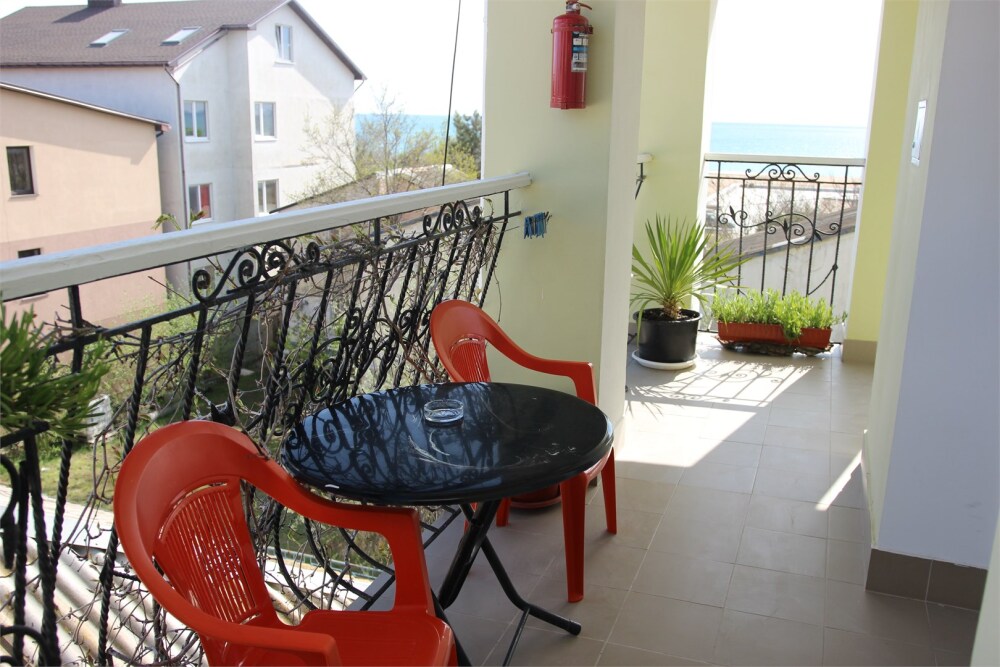 В номере отдельный балкон с ротанговой мебелью, вход в номер осуществляется с балкона. В номере: телевизор, холодильник, кондиционер, шкаф-купе, стол, стулья, чайник, печь свч, мини-кухня, куллер с водой, санузел, горячая/холодная вода круглосуточно, душ, тапочки. Смена полотенец и первая уборка номера происходят на 3-й день проживания. Смена постельного белья, полотенец и уборка происходят на 6й день проживания. Отопление: кондиционер и электробатарея. На кроватях ортопедические матрасы. Возможна трансформация двуспальной кровати в две односпальные. Полуторный диван.