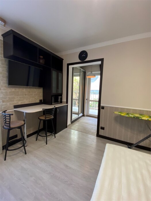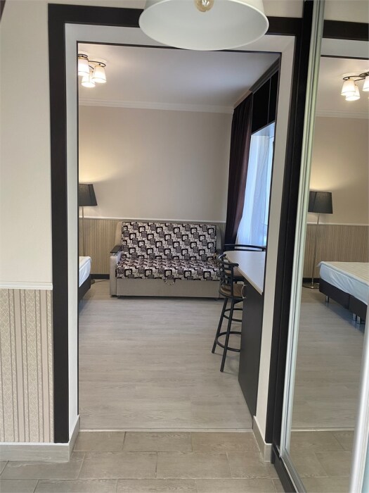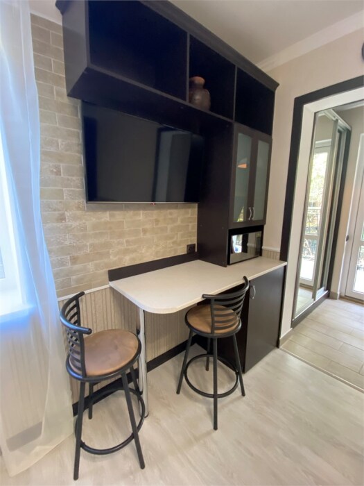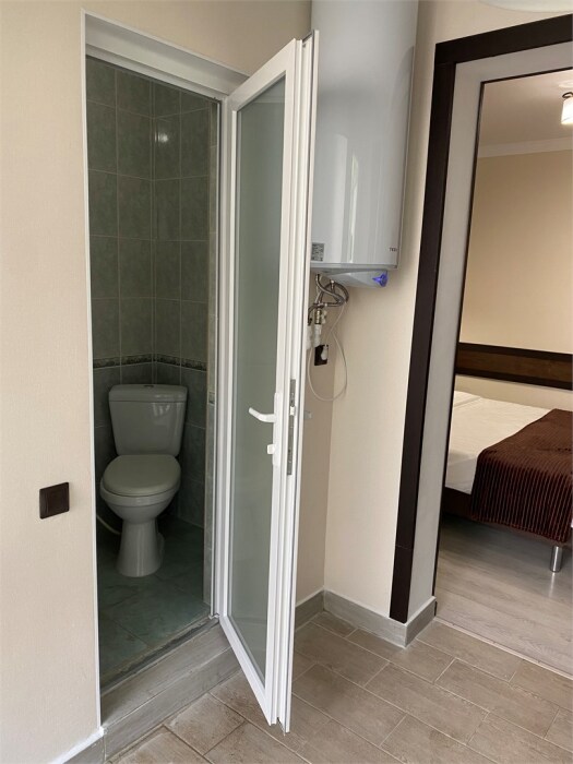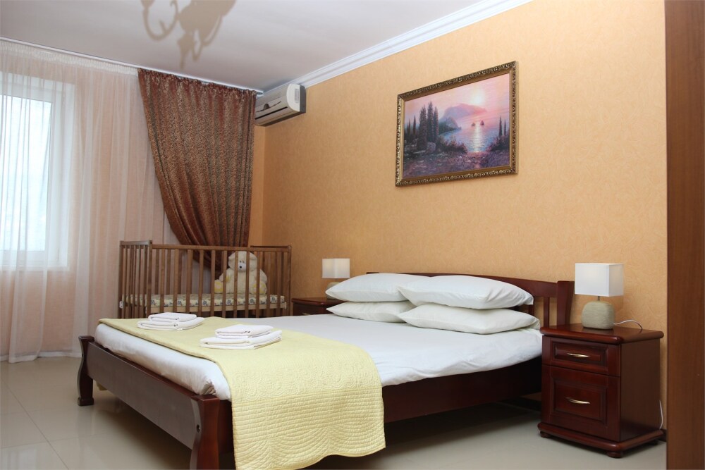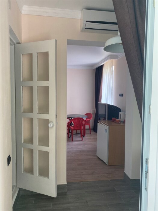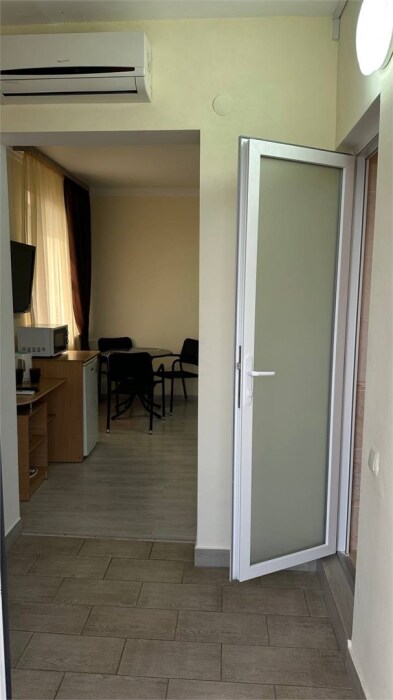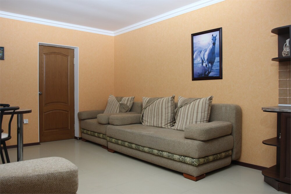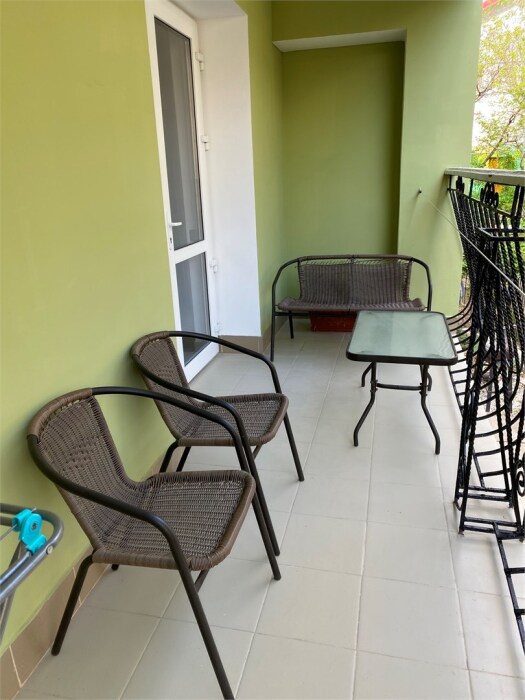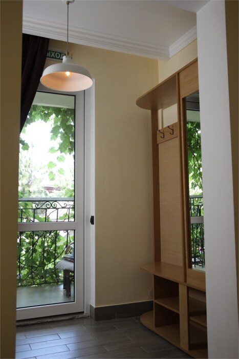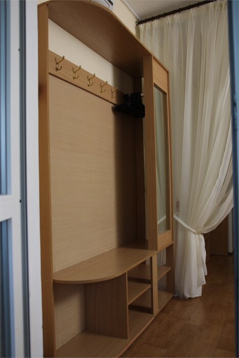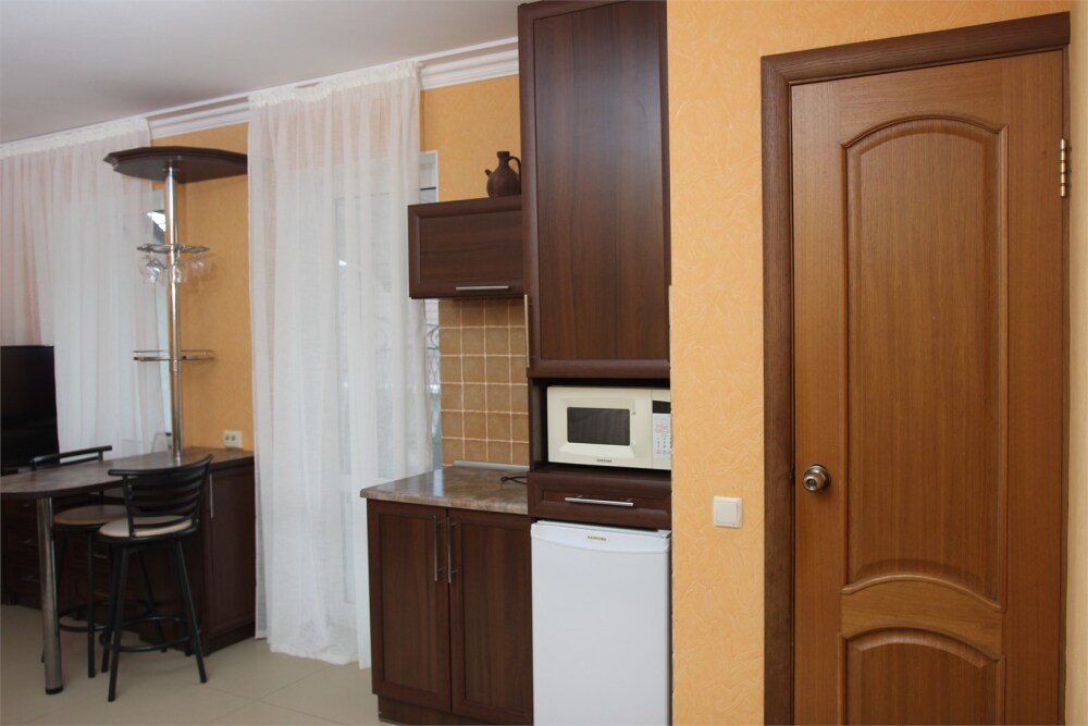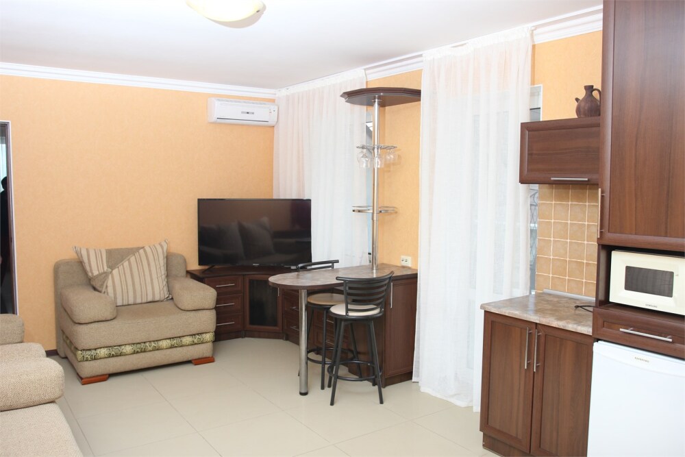 В номере отдельный балкон с ротанговой мебелью, вход в номер осуществляется с балкона. В номере: телевизор, холодильник, кондиционер, шкаф-купе, стол, стулья, чайник, печь свч, мини-кухня, куллер с водой, санузел, горячая/холодная вода круглосуточно, душ, тапочки. Смена полотенец и первая уборка номера происходят на 3-й день проживания. Смена постельного белья, полотенец и уборка происходят на 6й день проживания. Отопление: кондиционер и электробатарея. На кроватях ортопедические матрасы. Возможна трансформация двуспальной кровати в две односпальные. Полуторный диван.