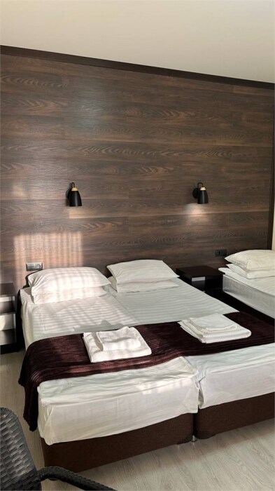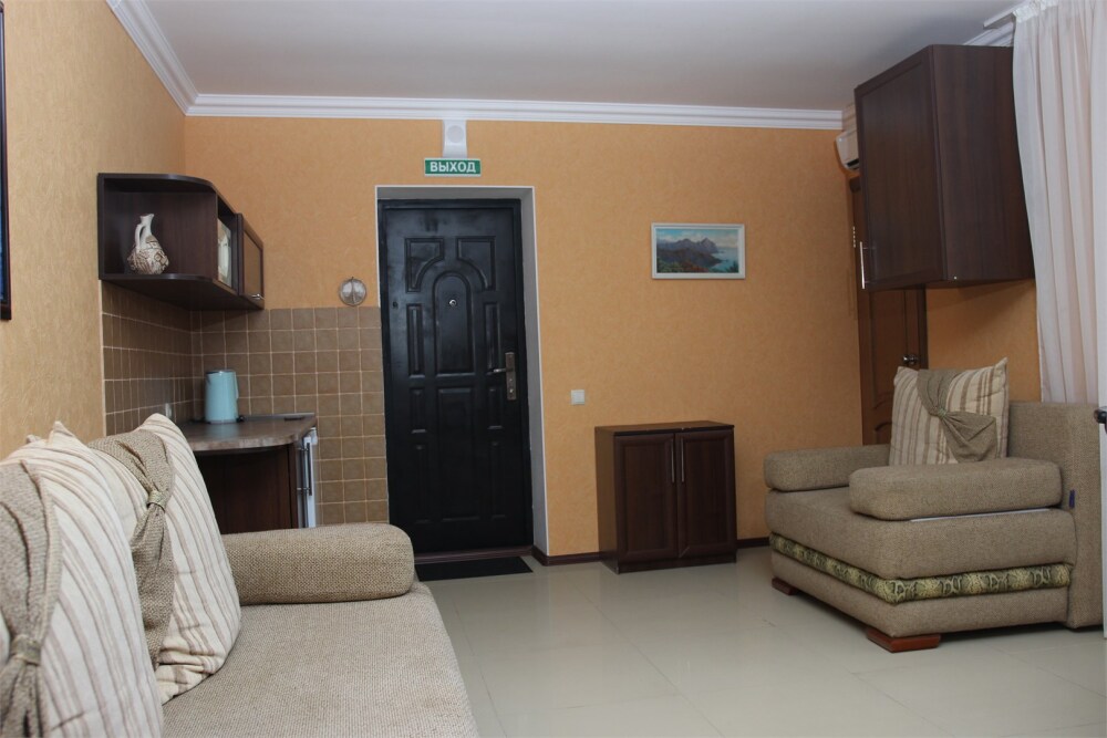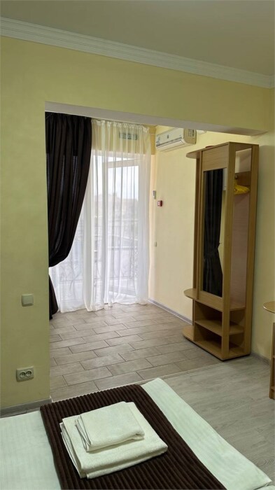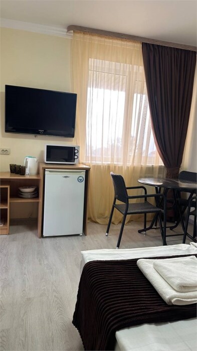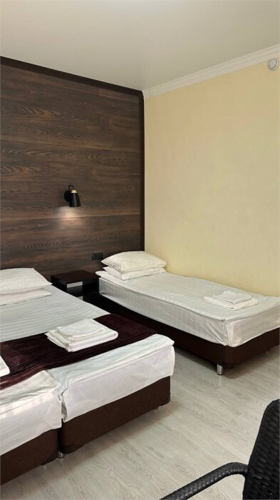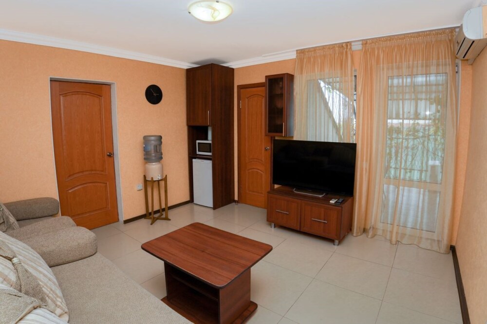 Бронировали де люкс 2-х местный, но по приезду Михаил предложил более удобный для нас вариант, трёхместный номер с отдельным балконом по стоимости двухместного. Очень порадовало. Так как мы были с собакой служебной овчаркой и муж инвалид, то нам было максимально удобно. Пляж для людей с ограниченными возможностями рядом в 100 метрах. Очень удобно сделан заход в воду, шезлонги для инвалидов бесплатно. В номере все чистое, уборку и смену постельного белья и полотенец делали на пятый день. В цокольном этаже есть микроволновка. Вода горячая постоянно, парковка есть и платная и бесплатная. На территории базы много кафешек, магазины, рынок, развлечения для взрослых и детей. Мы очень довольны. Всем рекомендуем. Огромное спасибо Михаилу и всему персоналу за радушный прием!!!
