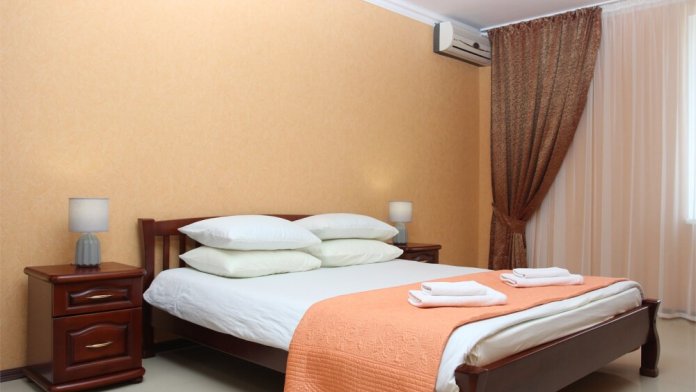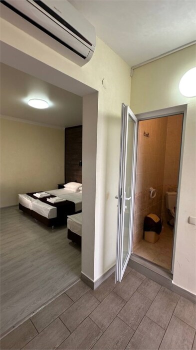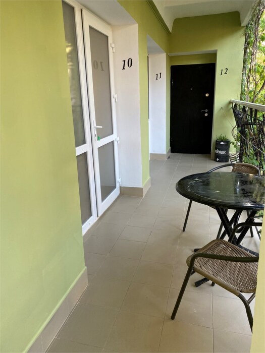 Вход в номер осуществляется с проходного балкона (у каждого гостя есть своя часть балкона для отдыха). В номере: телевизор, холодильник, кондиционер, шкаф-купе, стол, стулья, чайник, печь свч, санузел, горячая/холодная вода круглосуточно, душ, тапочки. Смена полотенец и первая уборка номера происходят на 3й день проживания. Смена постельного белья, полотенец и уборка происходят на 6й день проживания. Отопление: кондиционер + электробатарея. На кроватях ортопедические матрасы. Возможна трансформация двуспальной кровати в две односпальные.