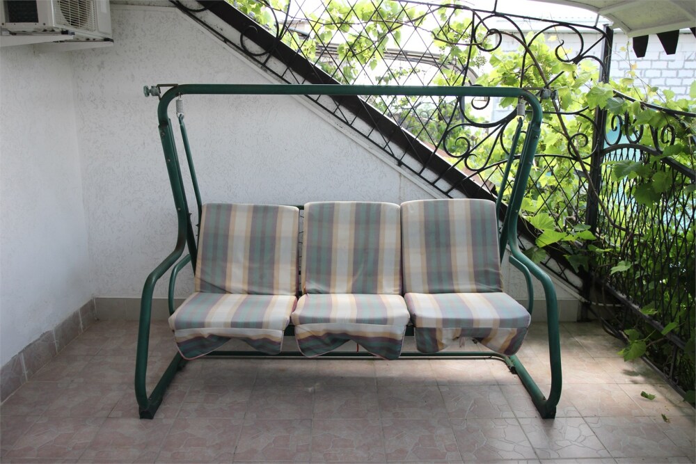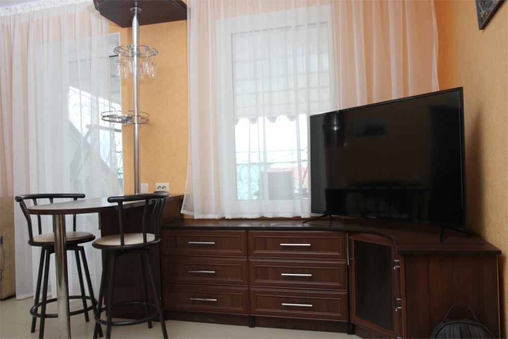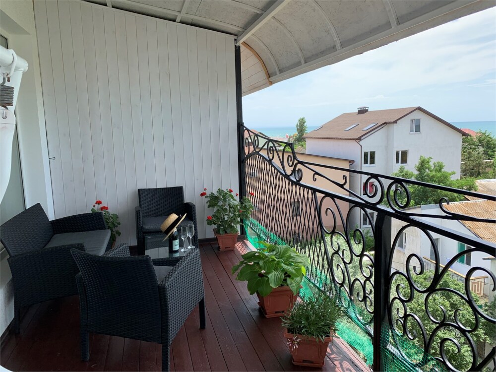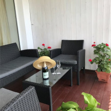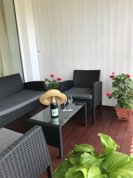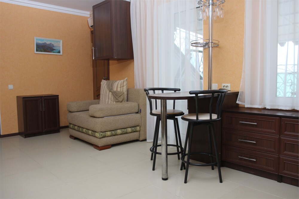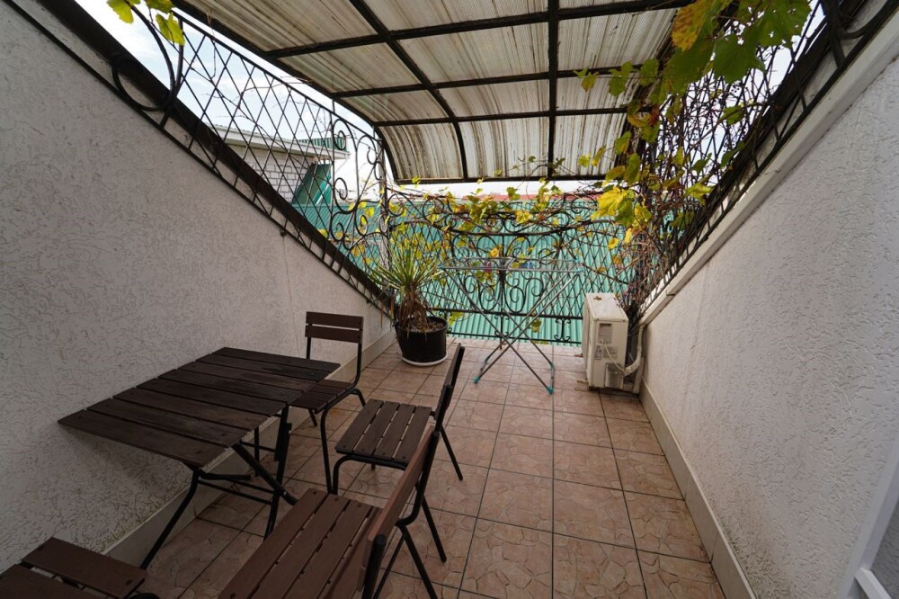 Номер находятся в мансарде здания. В номере просторная гостиная, комфортная спальня, большой балкон с обеденной мебелью и садовой качелью. В гостиной диван трансформируется в спальное место для двоих гостей. В номере: телевизор, холодильник, кондиционер, шкаф-купе, стол, барные стулья, барная стойка, чайник, посуда, столовые приборы, печь свч, мини-кухня, куллер с водой, санузел, горячая/холодная вода круглосуточно, душ, халаты, тапочки. Отопление: кондиционер, электробатарея. На кроватях ортопедические матрасы.