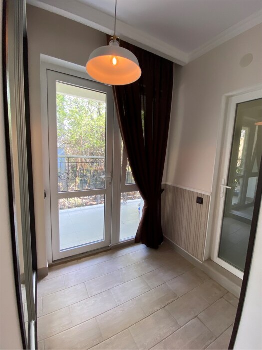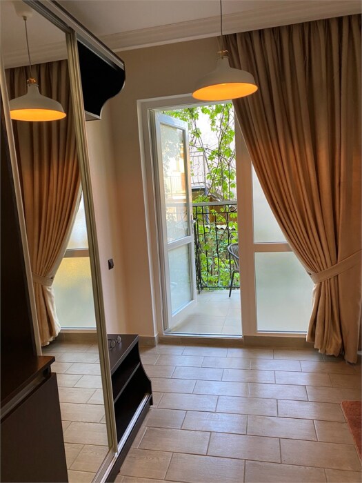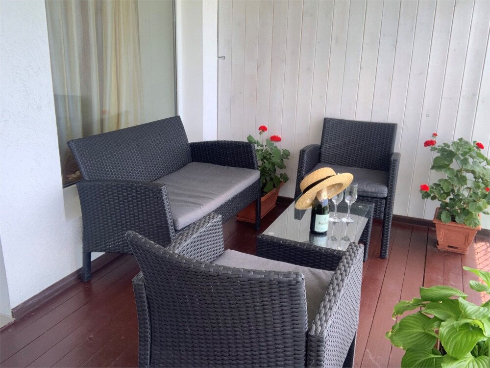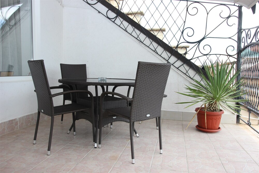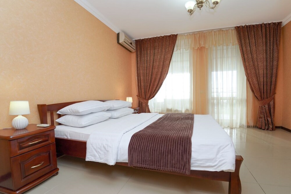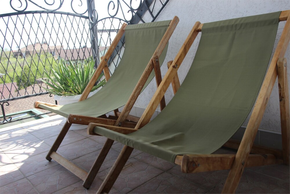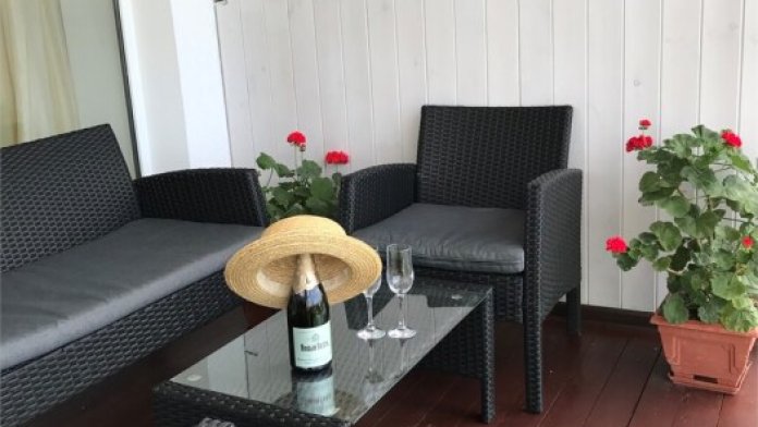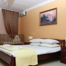Номер находятся в мансарде здания. В номере просторная гостиная, комфортная спальня, большой балкон с обеденной мебелью и садовой качелью. В гостиной диван трансформируется в спальное место для двоих гостей. В номере: телевизор, холодильник, кондиционер, шкаф-купе, стол, барные стулья, барная стойка, чайник, посуда, столовые приборы, печь свч, мини-кухня, куллер с водой, санузел, горячая/холодная вода круглосуточно, душ, халаты, тапочки. Отопление: кондиционер, электробатарея. На кроватях ортопедические матрасы.