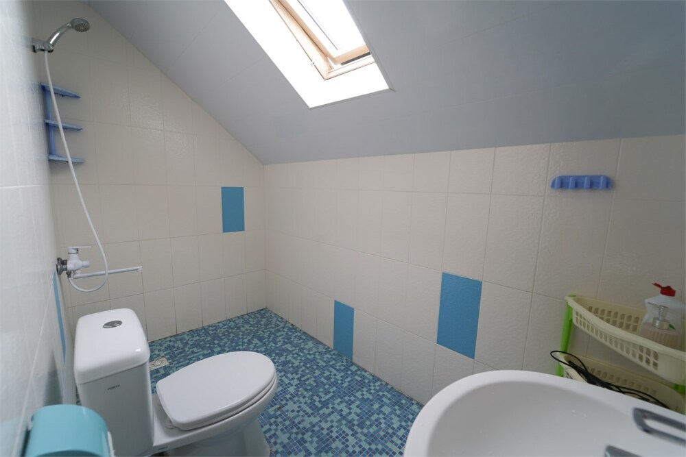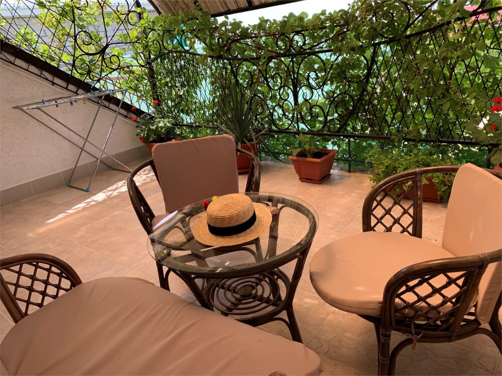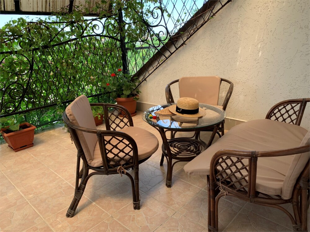 Номер находятся в мансарде здания. В номере просторная гостиная, комфортная спальня, балкон с обеденной мебелью. Видовая терраса с ротанговой мебелью и садовой качелью. В гостиной диван трансформируется в спальное место для двоих гостей. В номере: телевизор, холодильник, кондиционер, шкаф-купе, стол, чайник, посуда, столовые приборы, печь свч, мини-кухня, куллер с водой, санузел, горячая/холодная вода круглосуточно, душ, халаты, тапочки. Отопление: кондиционер, электробатарея. На кроватях ортопедические матрасы.