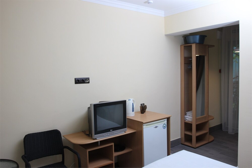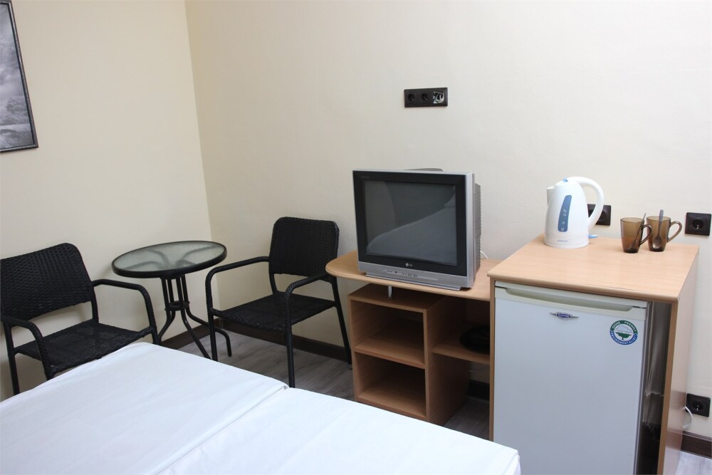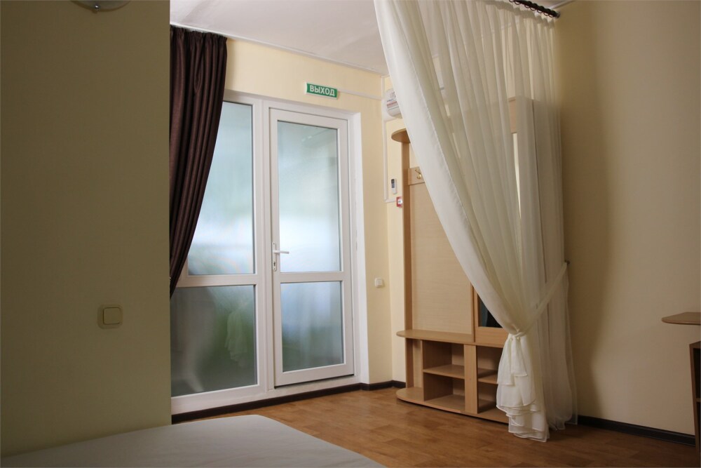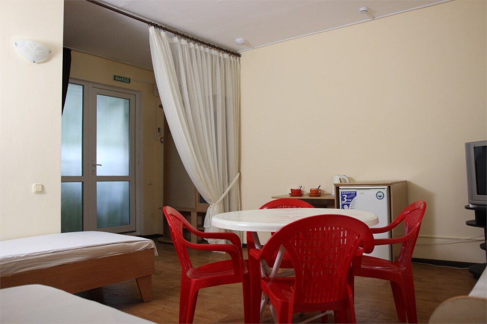 Вход в номер осуществляется с проходного балкона (у каждого гостя есть своя часть балкона для отдыха). В номере: телевизор, холодильник, кондиционер, шкаф, стол, стулья, чайник, санузел, горячая/холодная вода круглосуточно, душ. Смена полотенец и первая уборка номера происходят на 3й день проживания. Смена постельного белья, полотенец и уборка происходят на 6й день проживания. Отопление: кондиционер, электробатарея. На кроватях ортопедические матрасы. Возможна трансформация двуспальной кровати в две односпальные.
