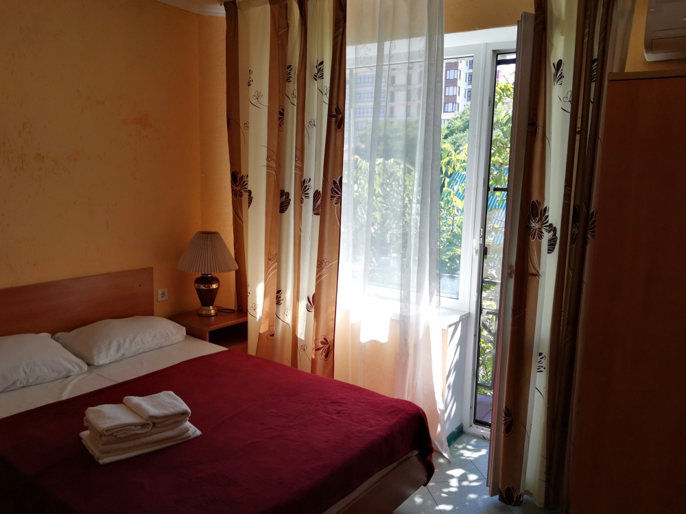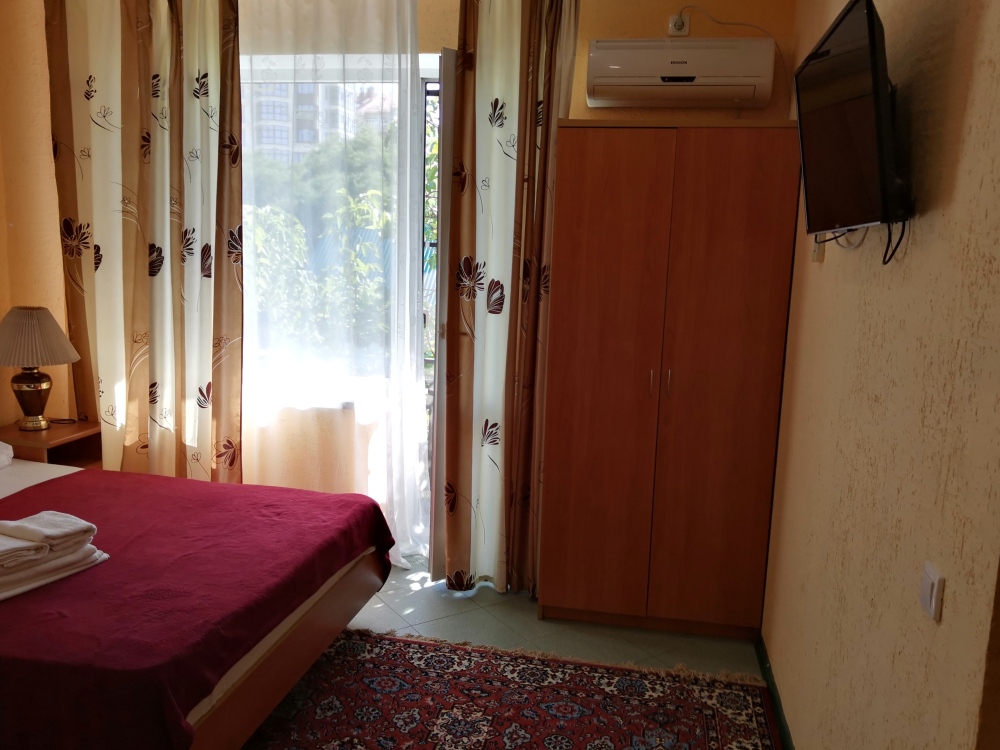 В номере :две 1 сп. кровати и одна 2х сп, шкаф, прикроватные тумбочки, журнальный столик, кондиционер, два кресла, телевизор,холодильник, набор посуды, Эл. Чайник, с/узел+душ, фен, полотенце,балкон.
