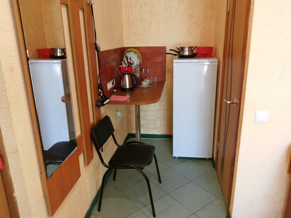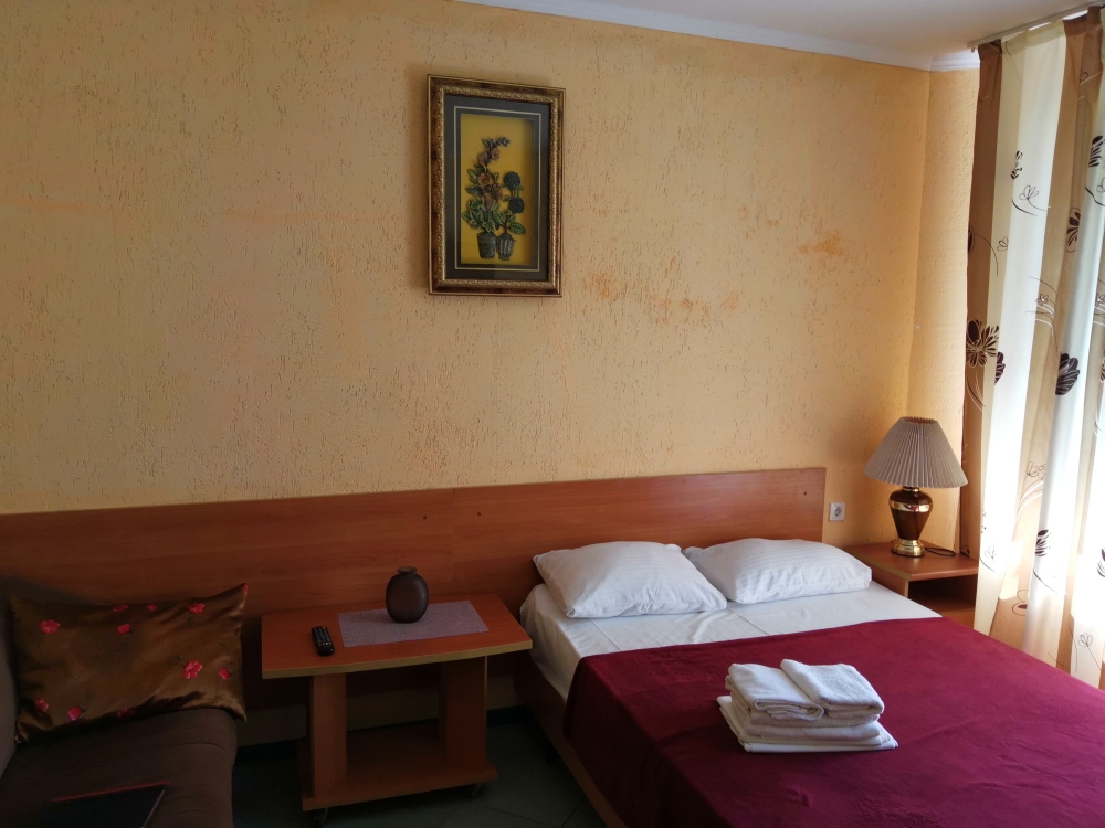 В номере находится 2х сп. кровать, прикроватная тумбочка, журнальный столик, шкаф, диван, холодильник, телевизор, кондиционер, Эл. Чайник, набор посуды, с/узел+душ, фен, полотенца.