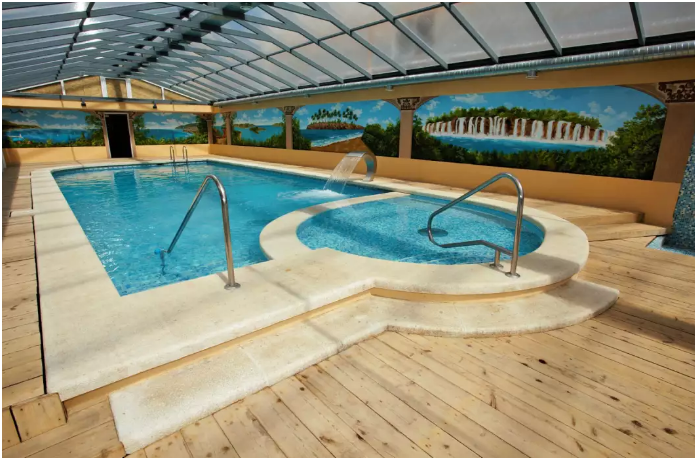 Просторный открытый подогреваемый бассейн площадью - 200 м2 и глубиной - до 1,9 м. Рядом также расположены две детские чаши: каждая площадью по 4,5 м2 и глубиной - 90 см . Работает с 01.06 по 30.09.