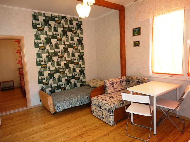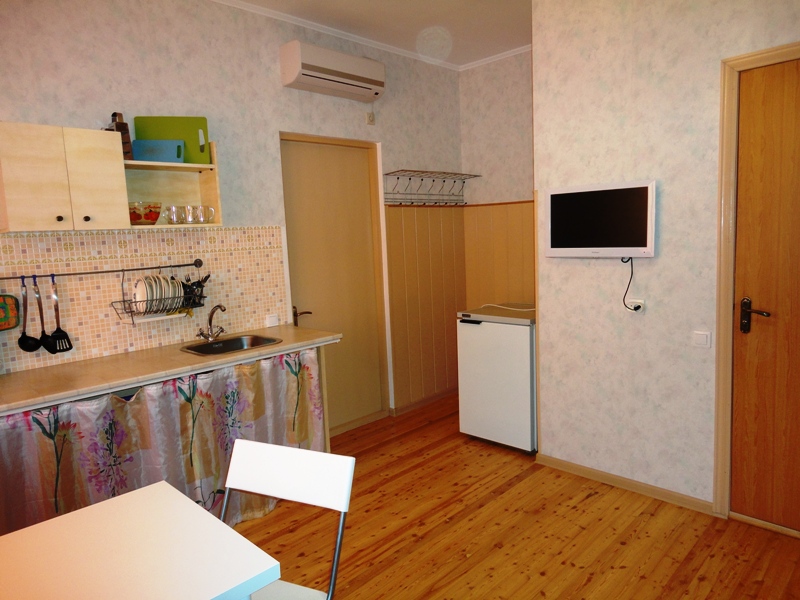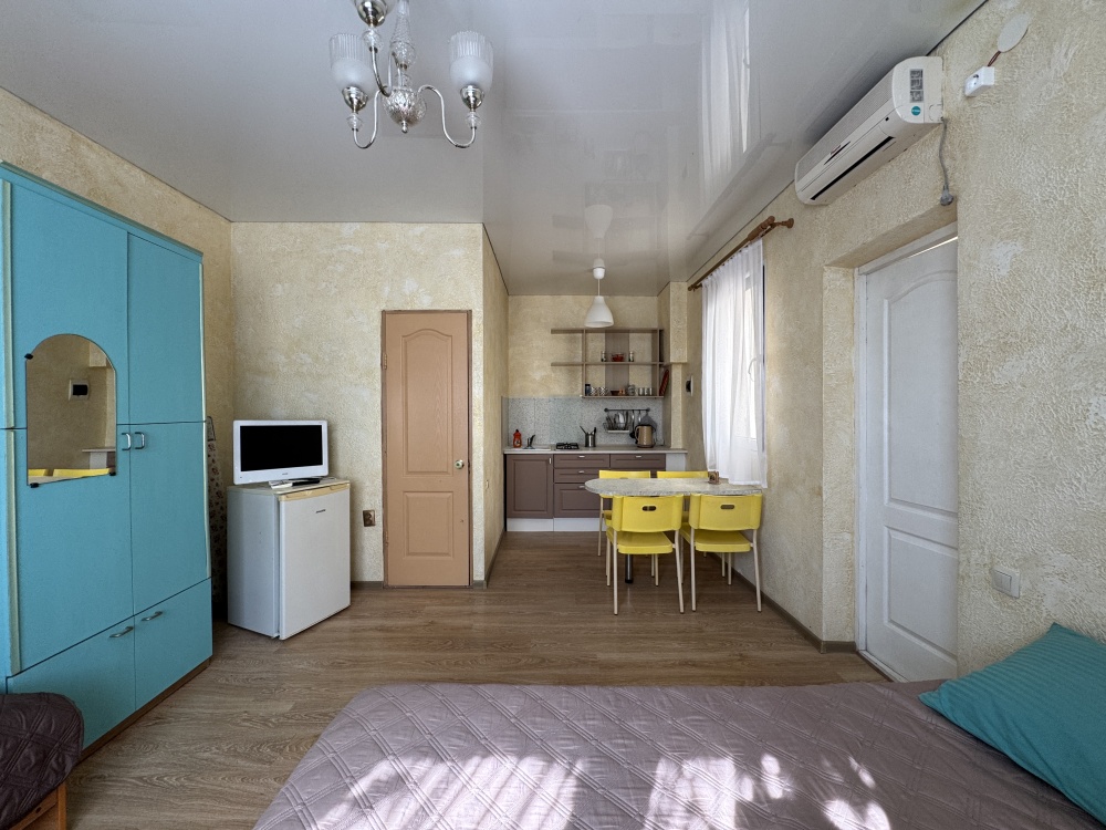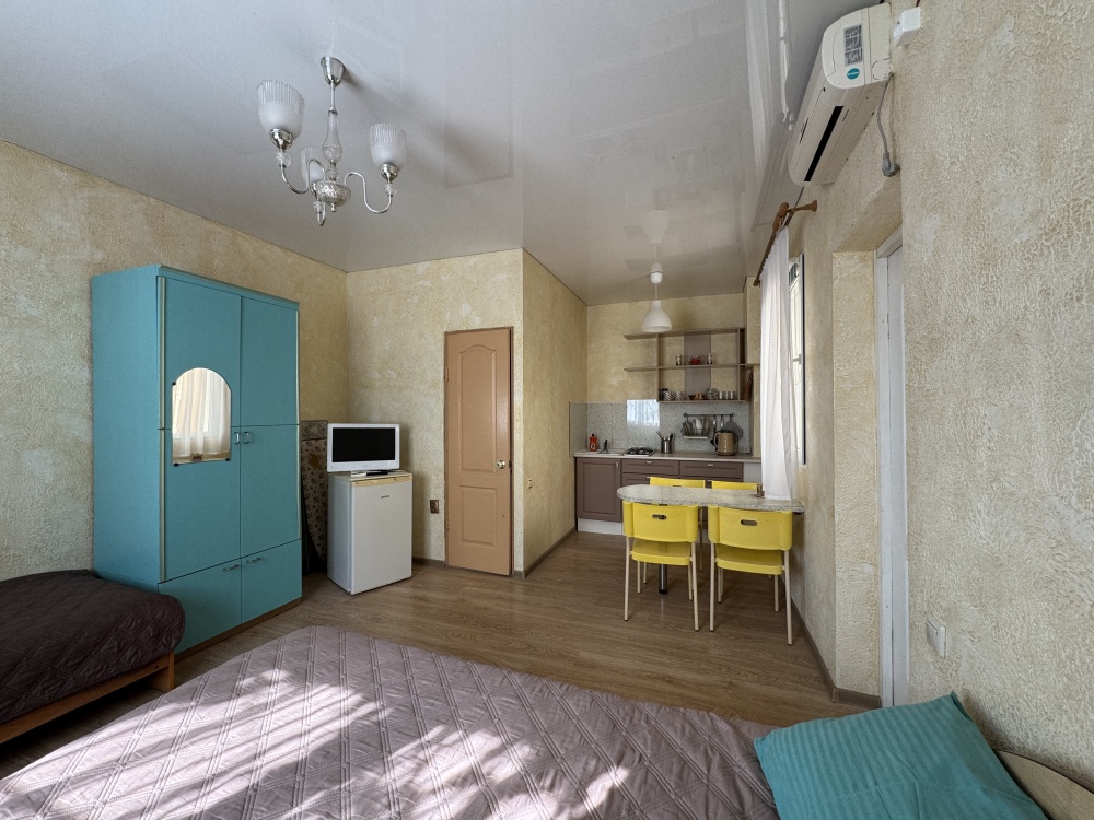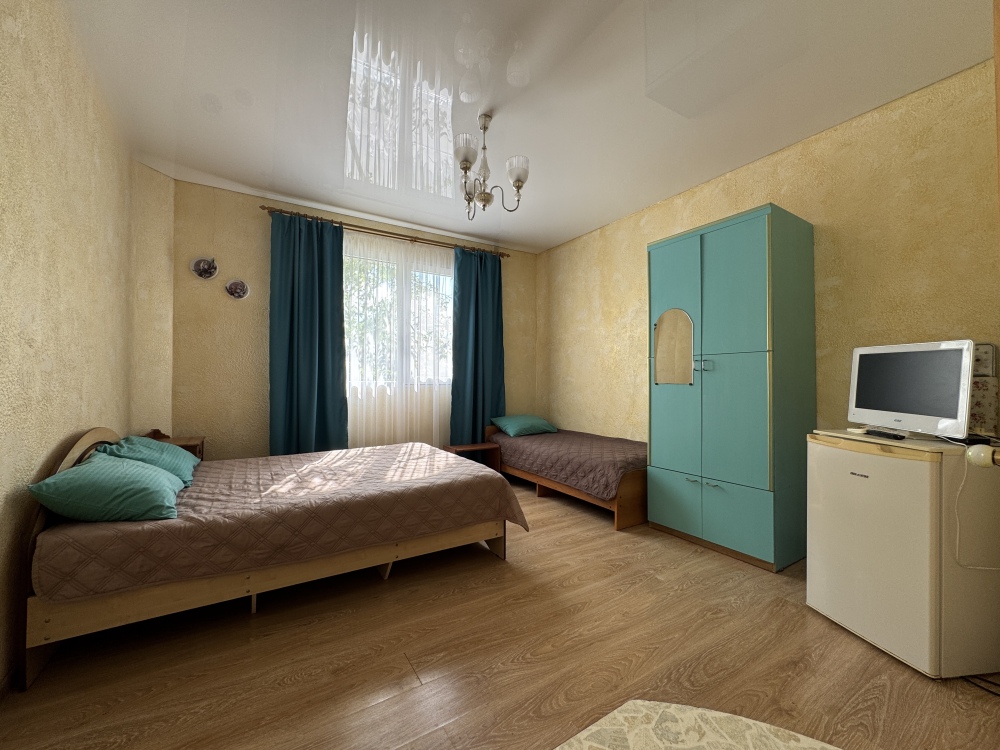 Двухкомнатный Двух-трёхместный уютный номер со всеми удобствами. В номере кухня,санузел, телевизор , кондиционер, двуспальная кровать, односпальная кровать,шкаф, тумбочки.