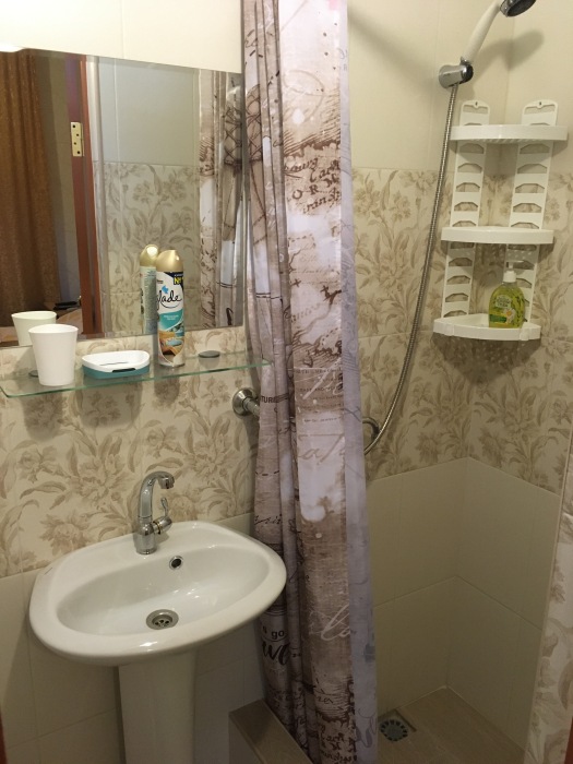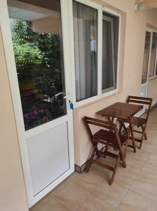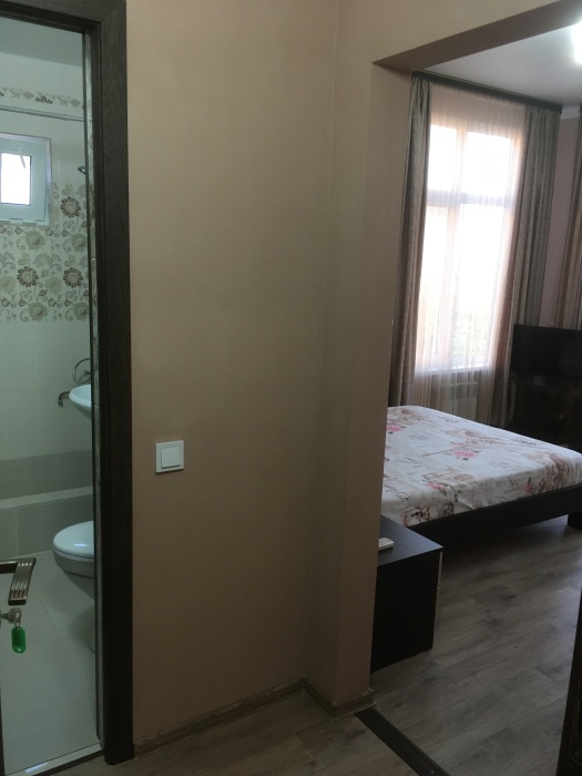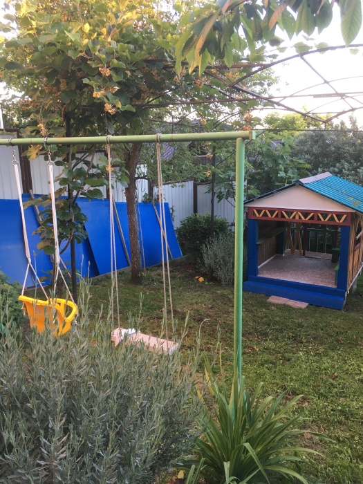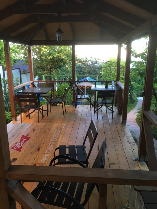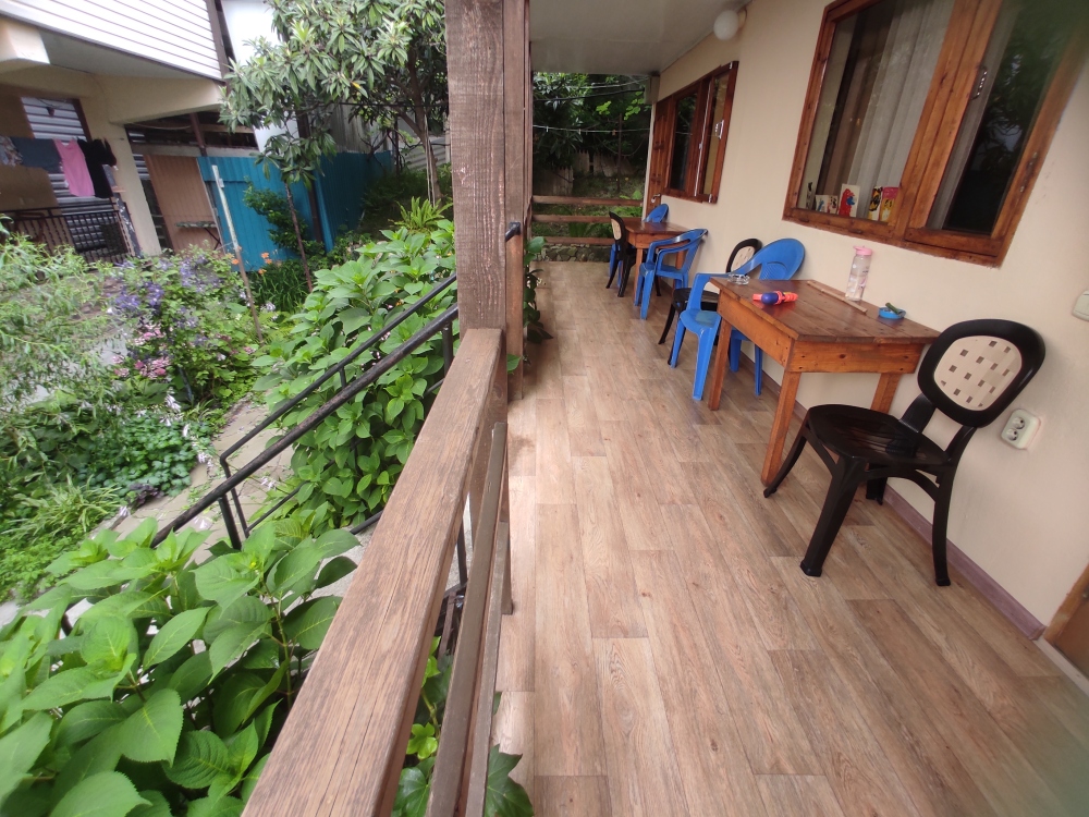 Семейный номер имеет свою собственную зону отдыха в тени на свежем воздухе - возле входа в дом. Важно - на фото есть плита, она не работает. Готовить можно на летней кухне. В номере есть микроволновка и посуда для употребления пищи. Чайник находится на этаже.