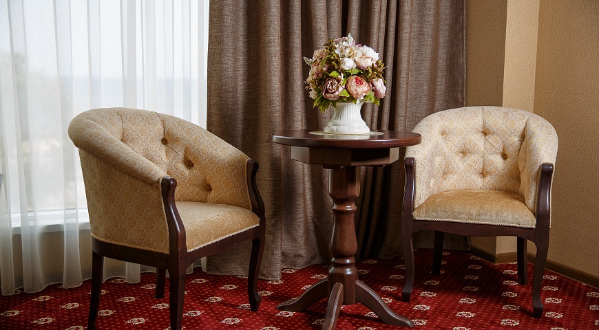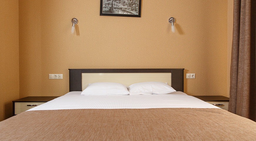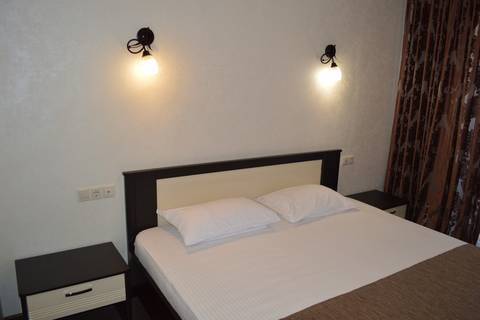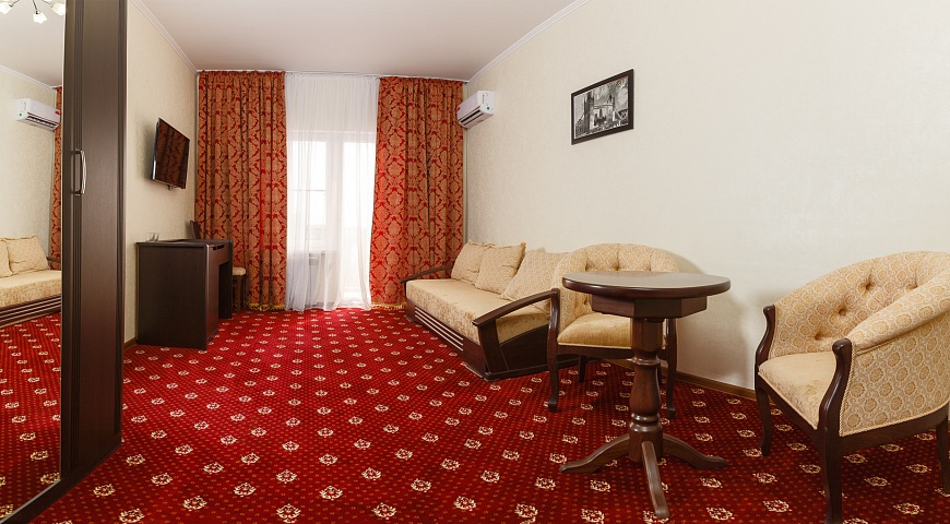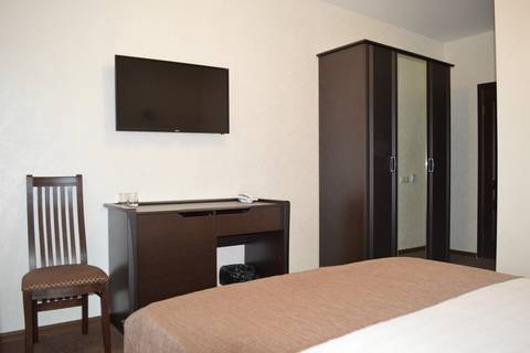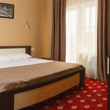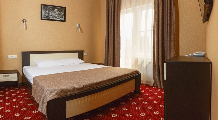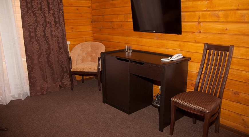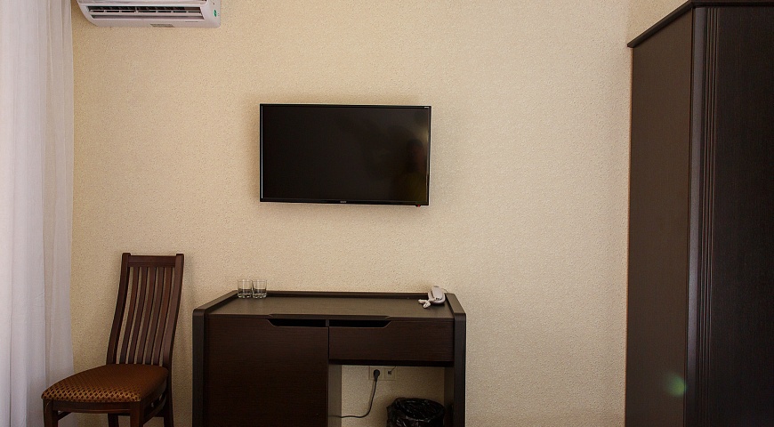 Есть кулер с горячей водой. При желании вместимость номера можно увеличить с помощью дополнительного места (еврораскладушка). Максимальное количество гостей — 5.