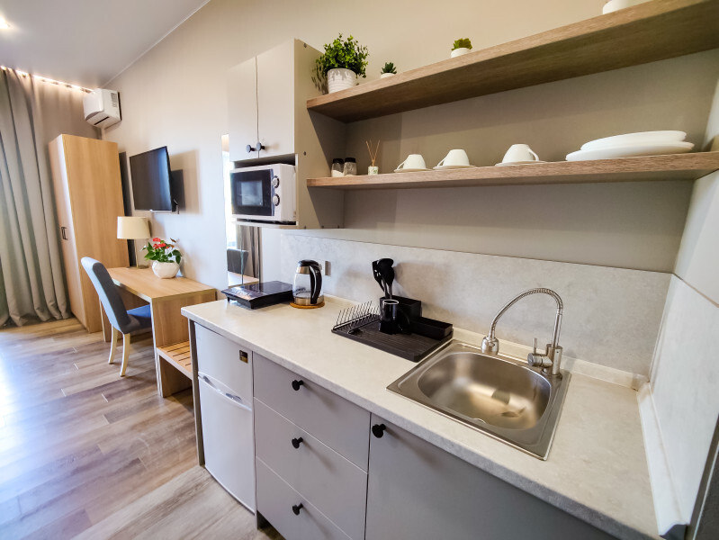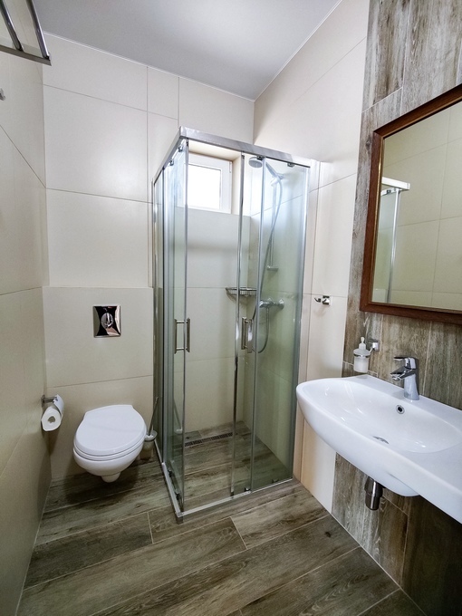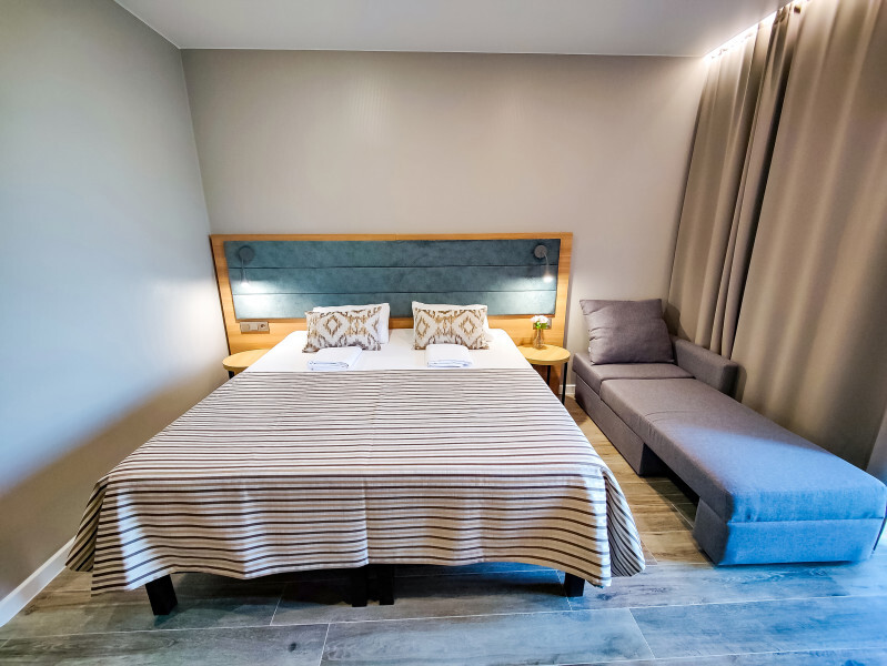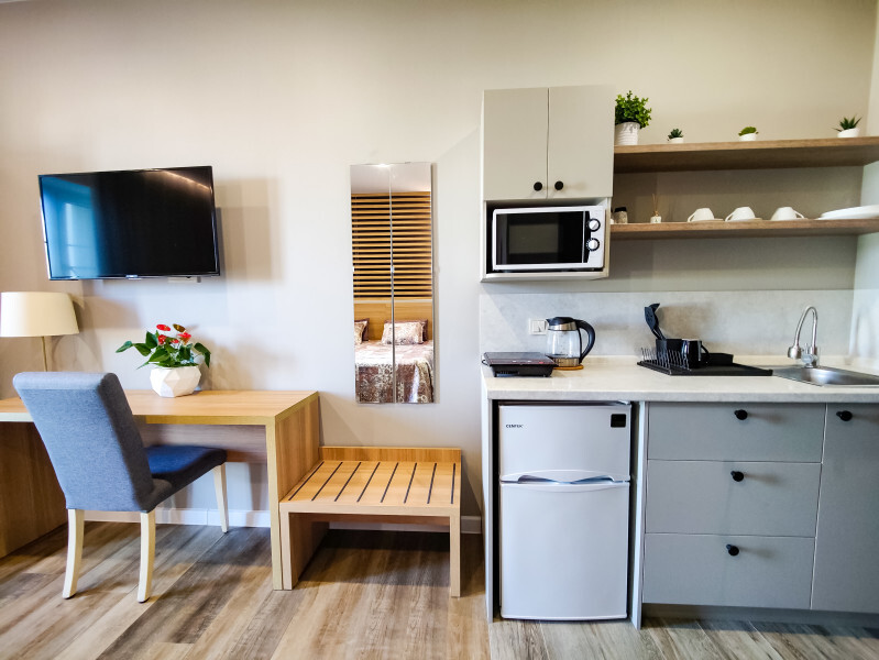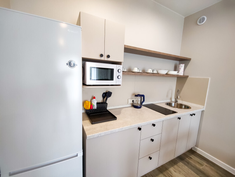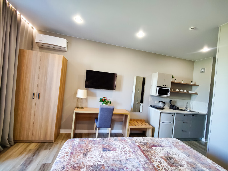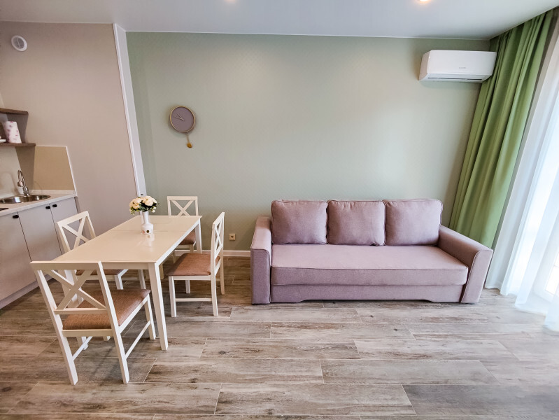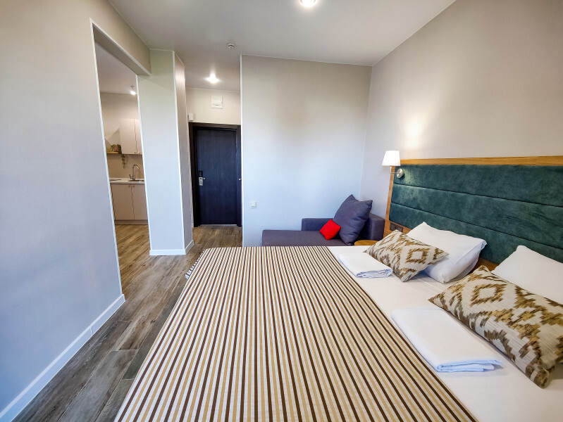 Апартаменты оснащены большой двуспальной кроватью и дополнительным спальным местом - односпальной софой. Новый, профессиональный матрас для здорового сна и идеальная чистота - залог хорошего отдыха.
