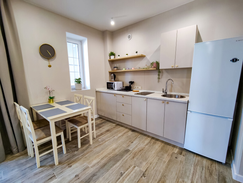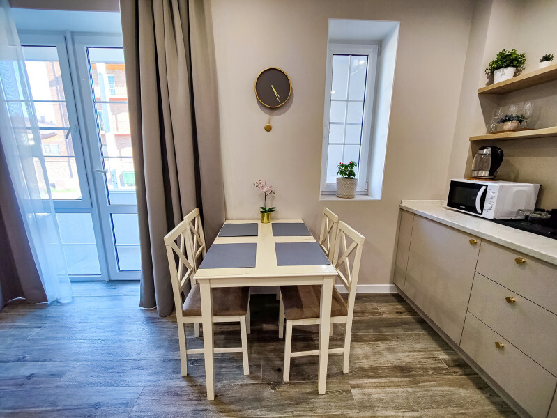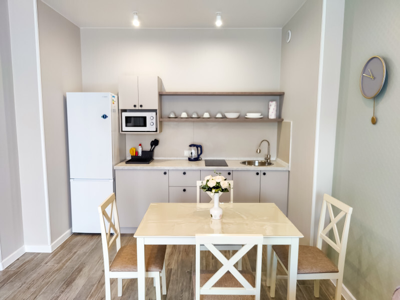 Апартаменты с большим круговым балконом и кухней, оборудованы всей необходимой техникой и мебелью для комфортного проживания.
