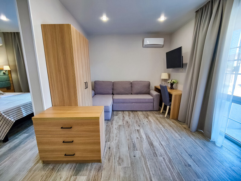 Для Вашего удобства номер оснащен двухместным и трехместным диванами с ортопедическими основаниями для комфортного ежедневного сна.