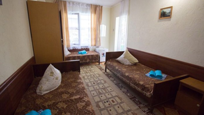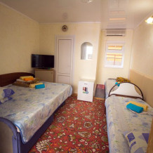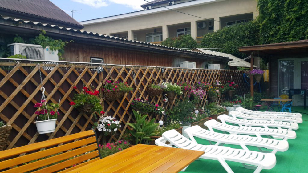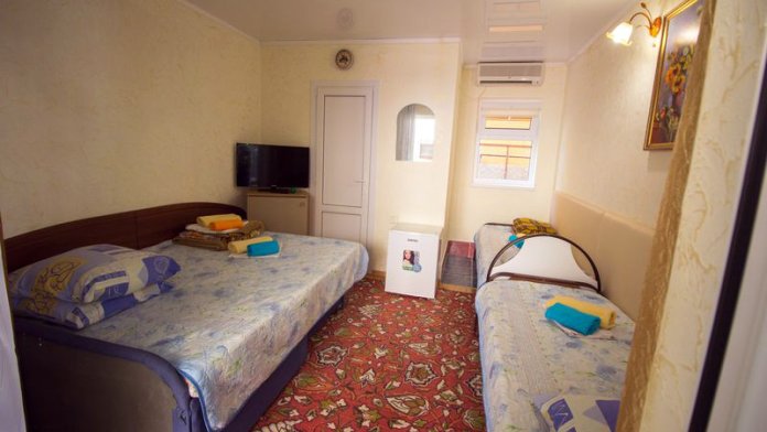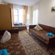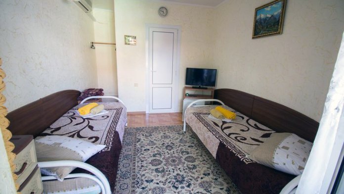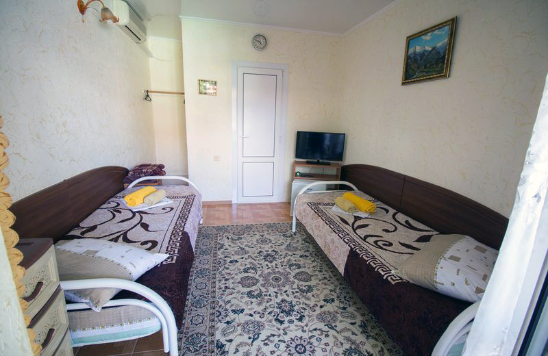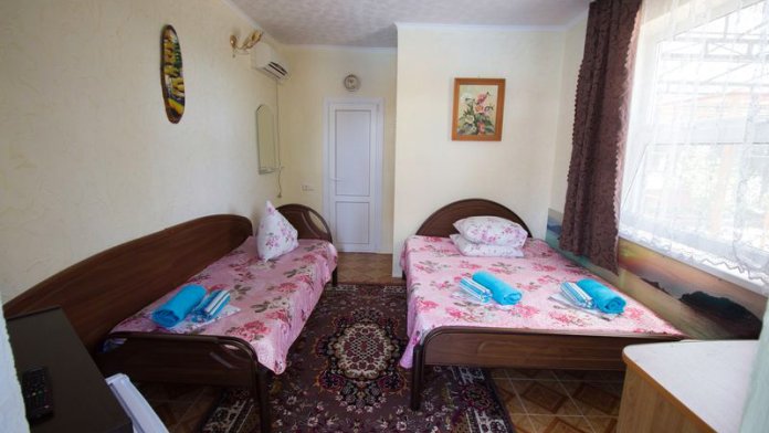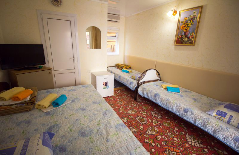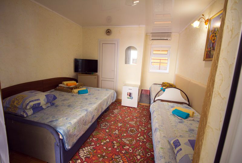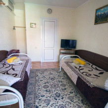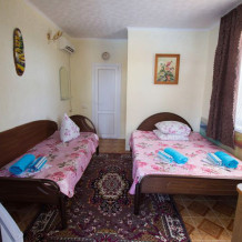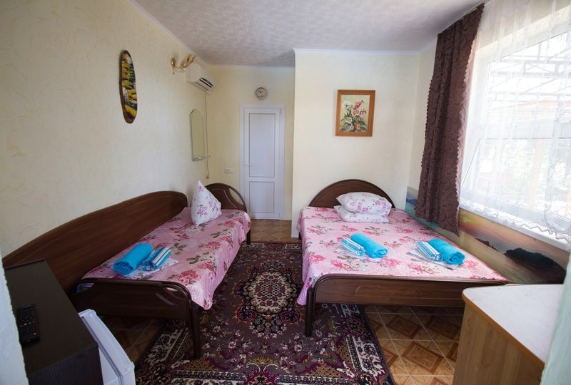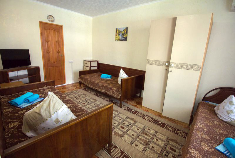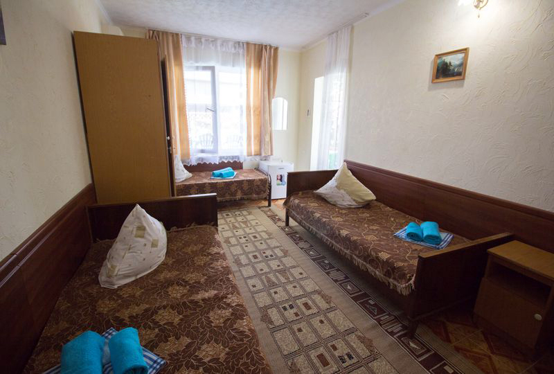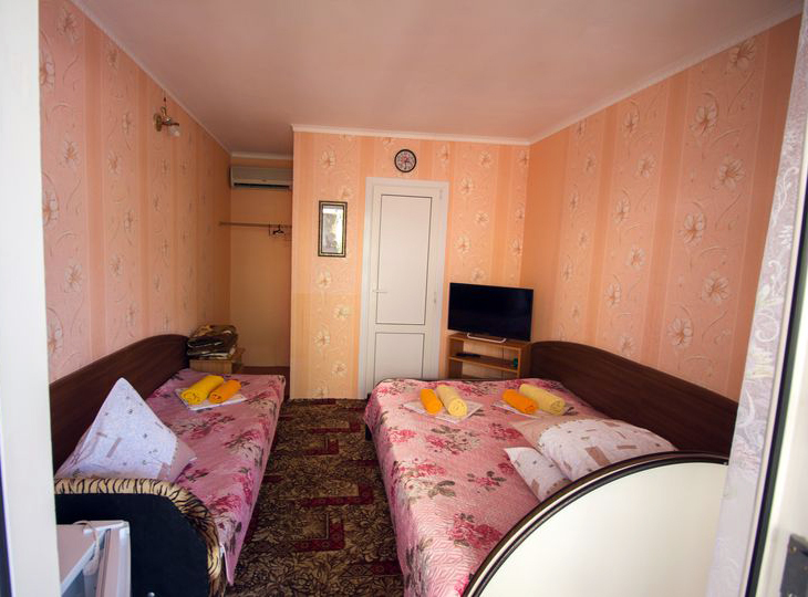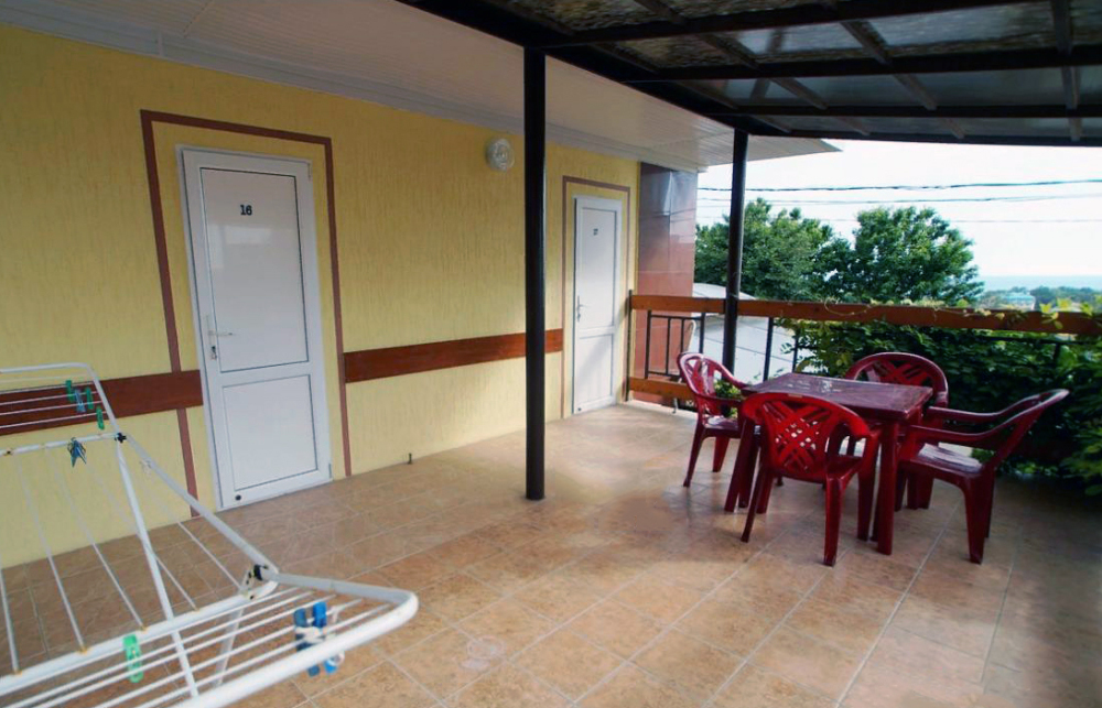 В двухэтажном здании однокомнатные 2-х, 3-х и 4-х местные номера. Все номера с удобствами. На общей площадке с видом на море есть столики и стулья, диваны, холодильники, стол с чайниками для чая и кофе. Стоянка на 5 автомобилей во дворе - бесплатно. Имеется резервная электростанция 15 квт и запас воды 5000 литров на случай внештатных ситуаций.