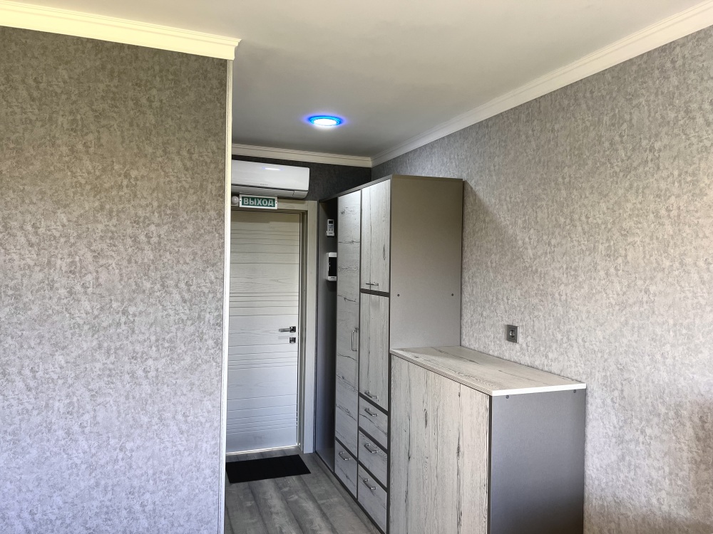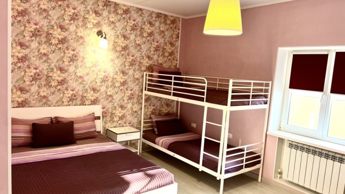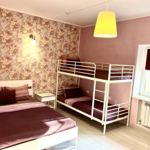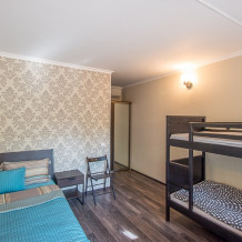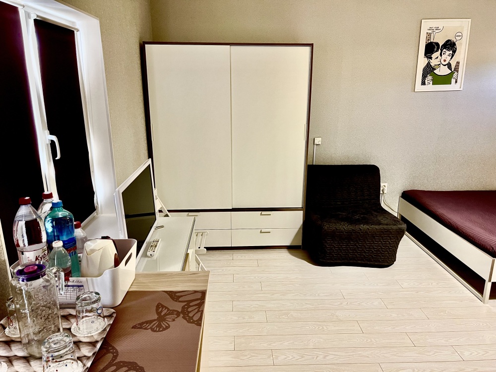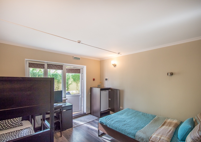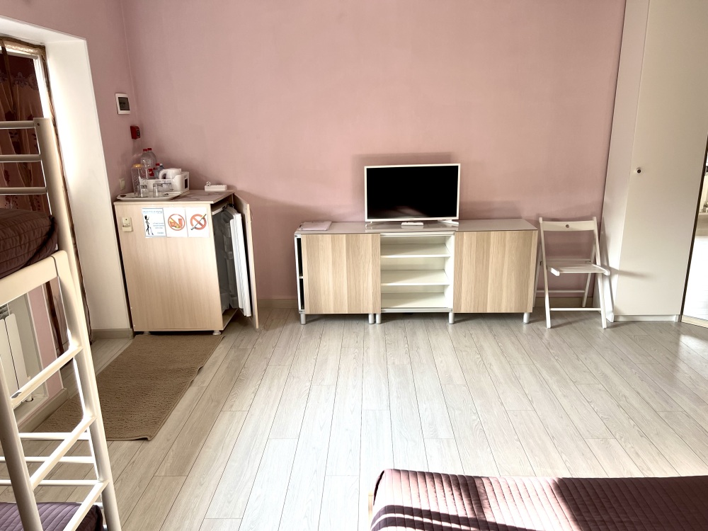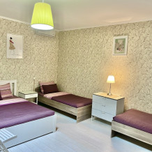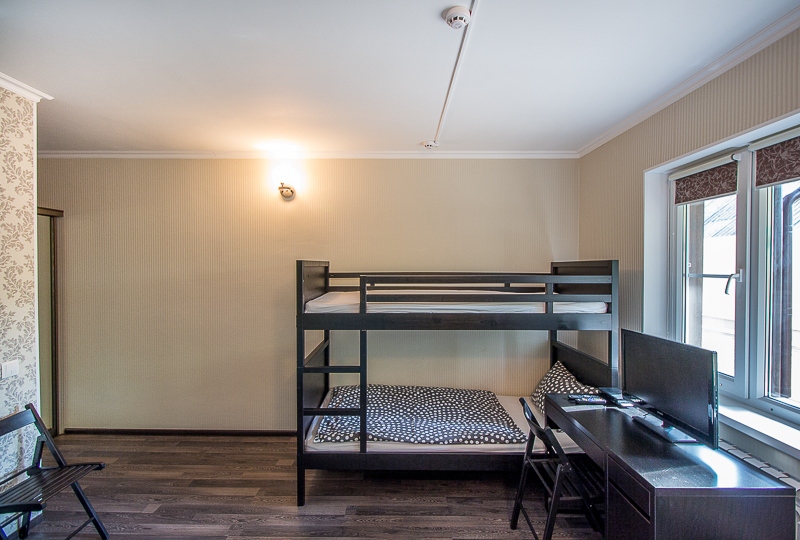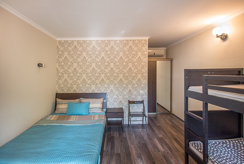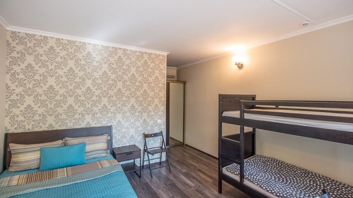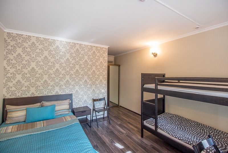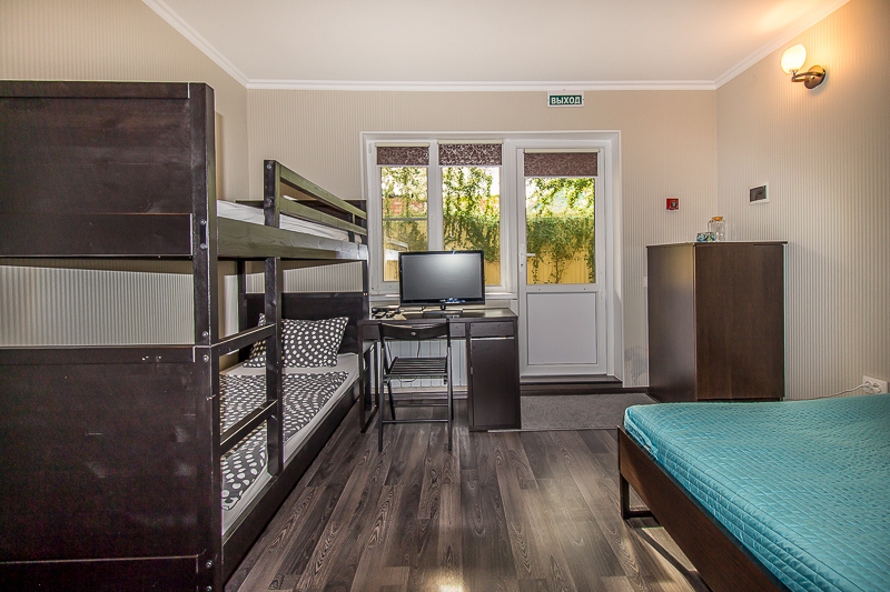 Большой четырехместный номер с двуспальной кроватью (160) и двумя односпальными кроватями . В номере имеется все необходимое для комфортного проживания