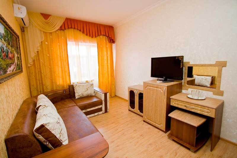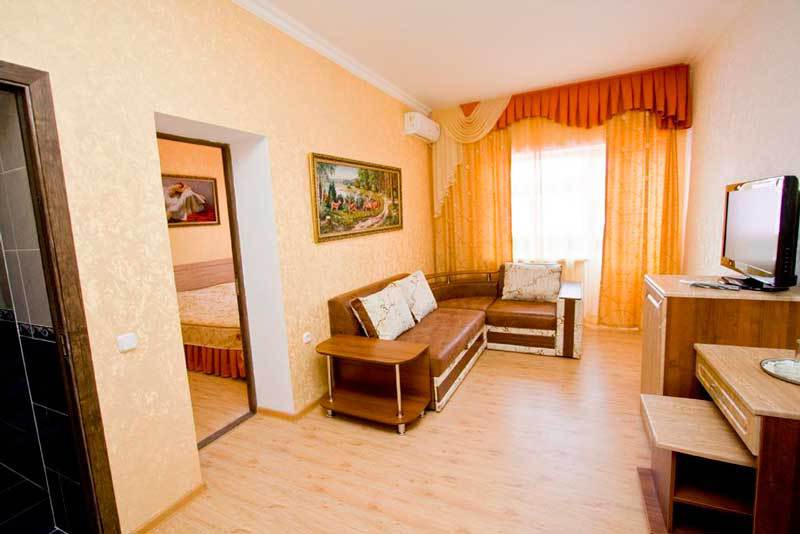 В 4-этажном современном здании с лифтом гостей ждут уютные 2-местные номера категории «Стандарт» с установленным дополнительным местом-креслом-кроватью и двухкомнатные и трехкомнатные категории «Люкс», в которых может разместиться до 5-ти человек. Все номера оборудованы комфортной мебелью, современными телевизорами, холодильниками, санузлами с душевой кабиной или ванными, фенами, сейфом для хранения вещей. Уборка номеров ежедневно, смена постельного белья и полотенец 1 раз в неделю. Гостиница принимает гостей с детьми любого возраста, дети до 4-х лет без предоставления места - бесплатно. В номерах не курят!