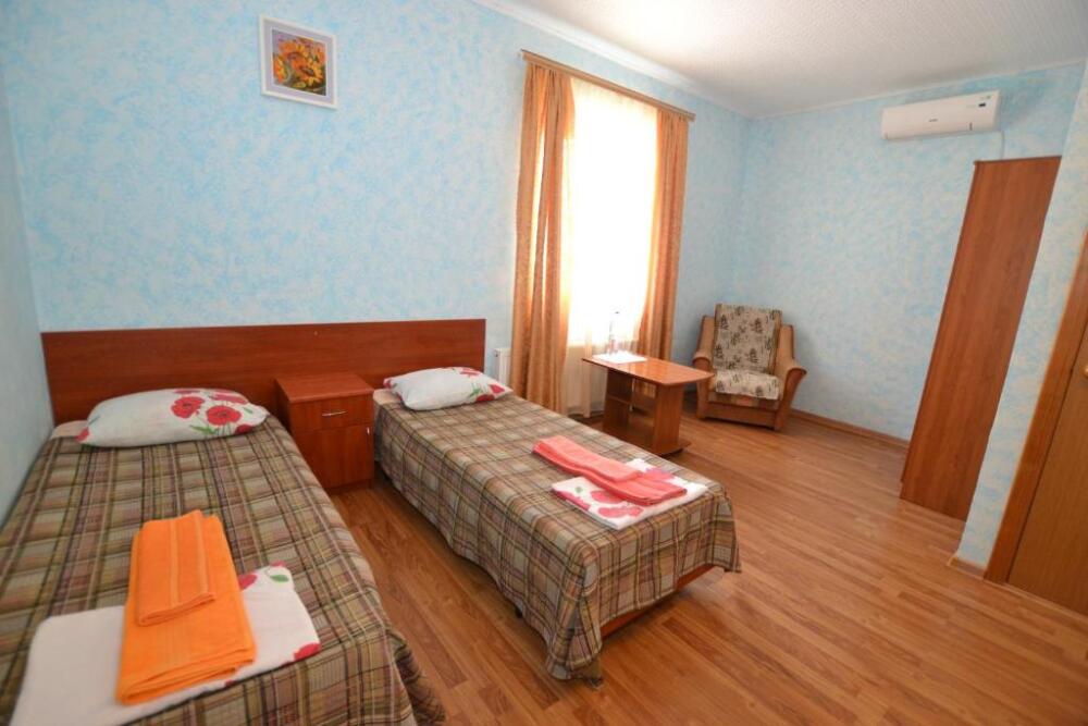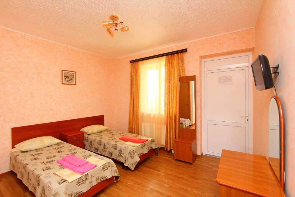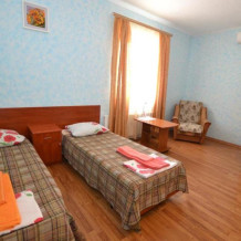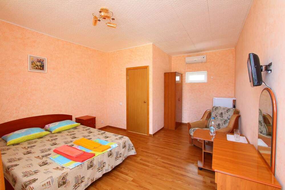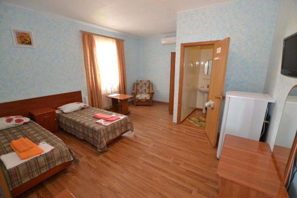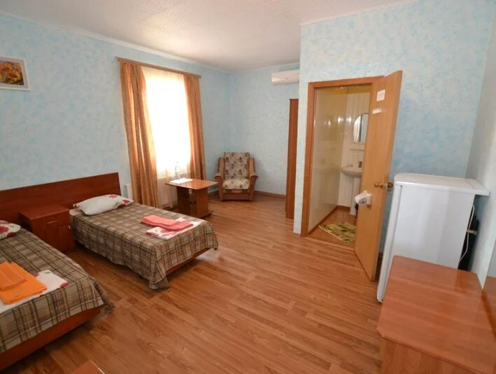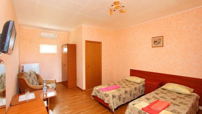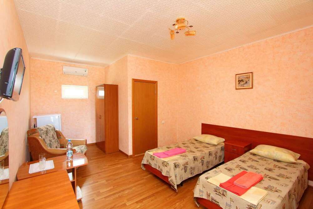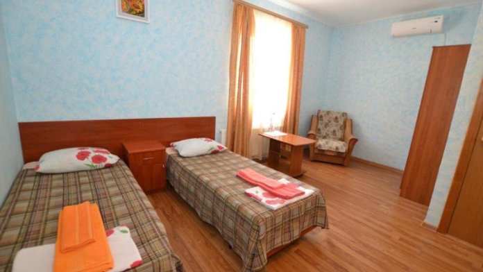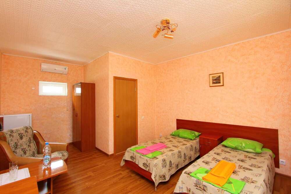 Гостям, для проживания, предлагаются просторные и светлые комнаты со всем необходимым для комфортного отдыха. Большинство комнат в гостевом доме 3-местные. Есть комнаты с двумя односпальными кроватями или одной двуспальной кроватью. Третьим спальным местом во всех комнатах является кресло-кровать (возможна установка ещё одного дополнительного спального места - качественная раскладная кровать). В каждой комнате есть санузел с душевой кабиной, ЖК-телевизор, сплит-система, холодильник, полный набор новой качественной мебели. Из комнат на втором и третьем этажах есть выход на балкон.