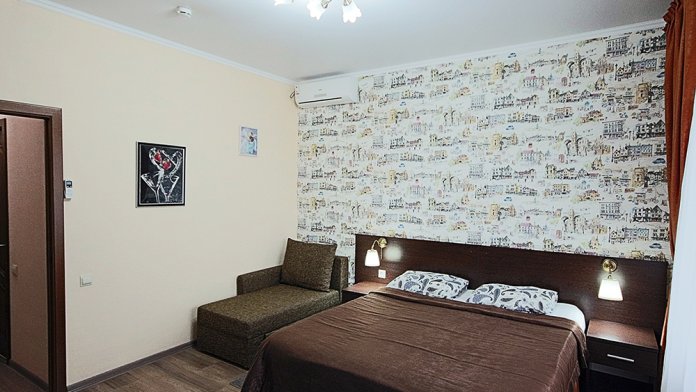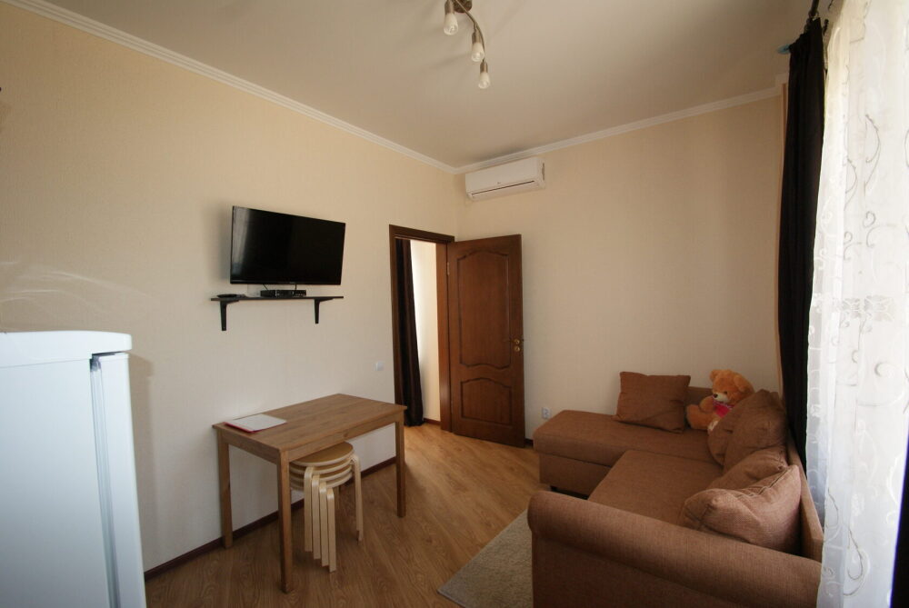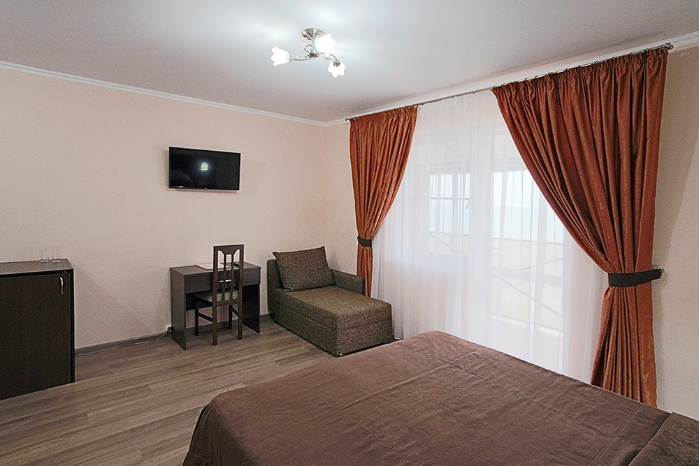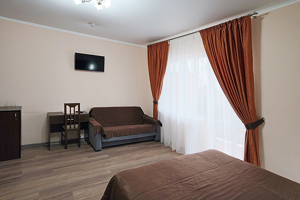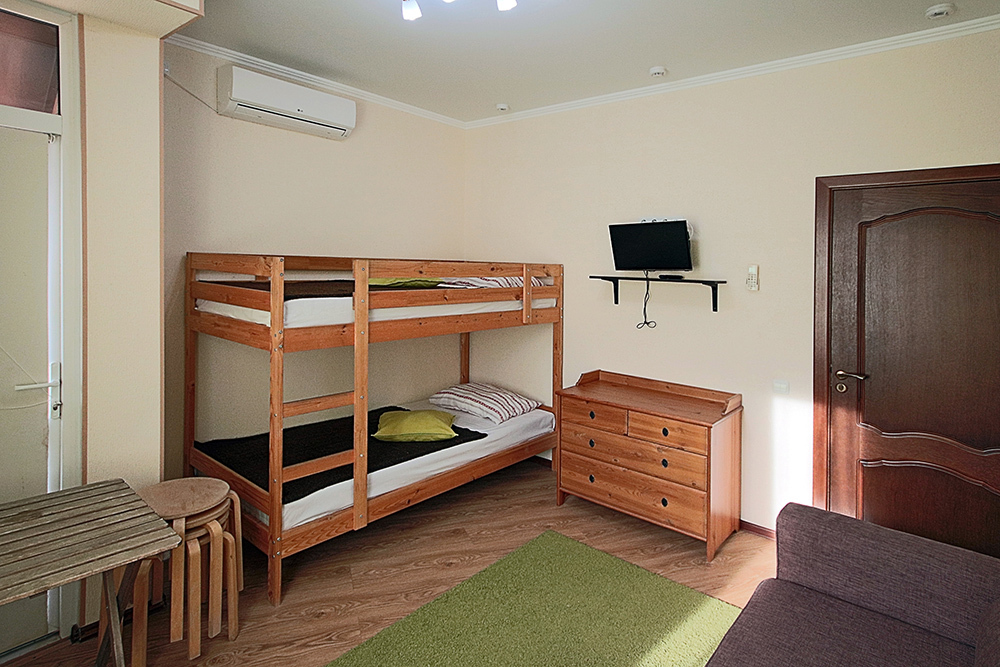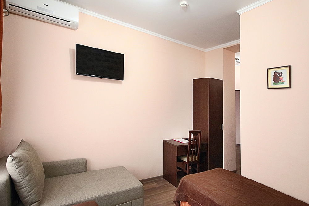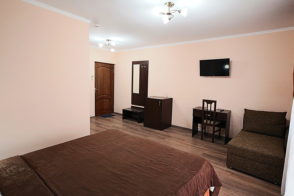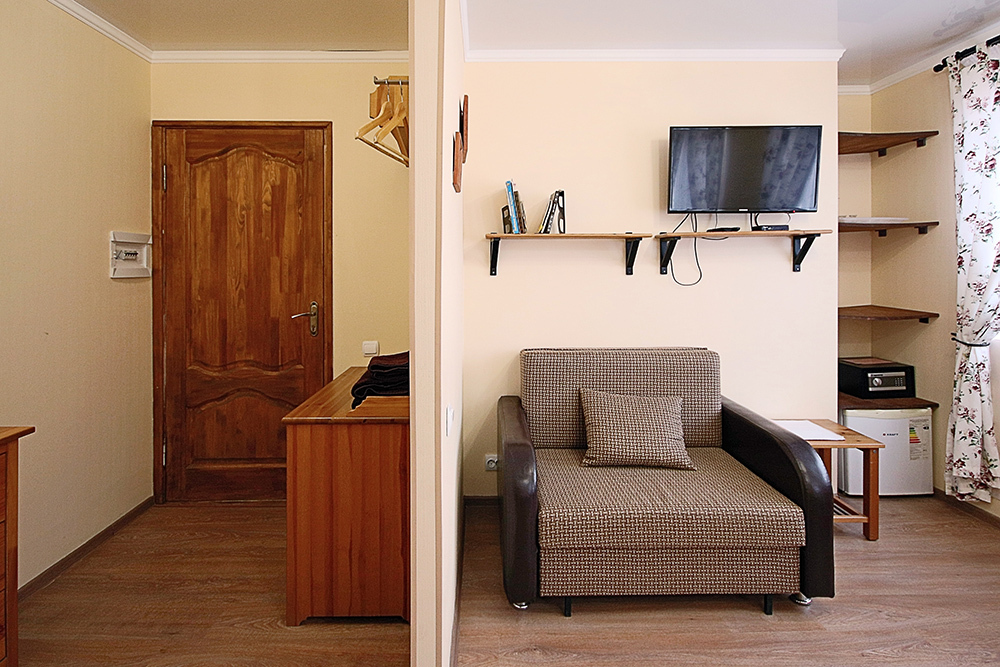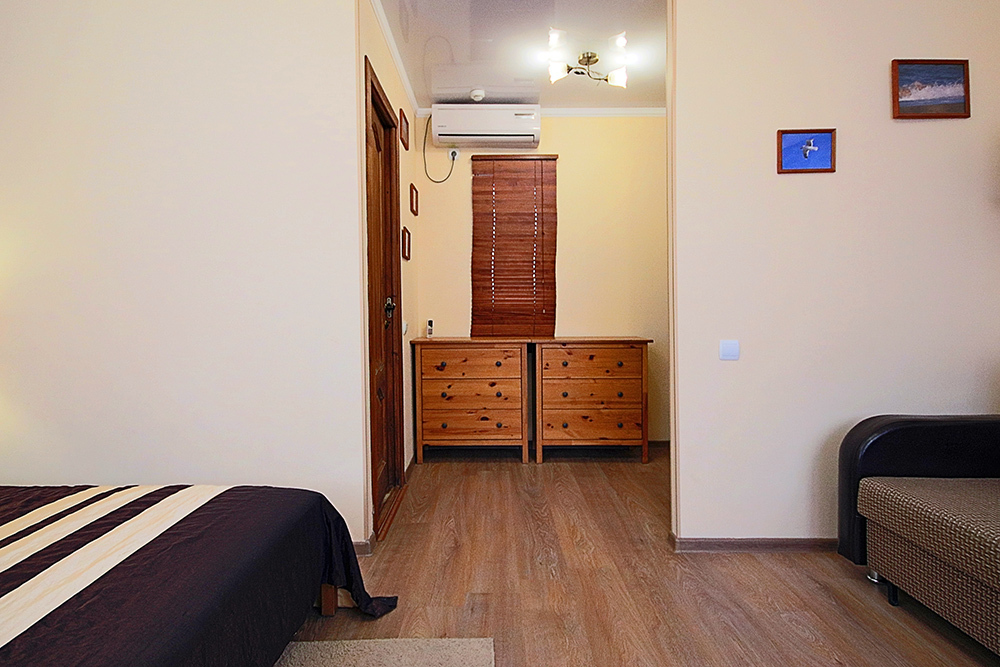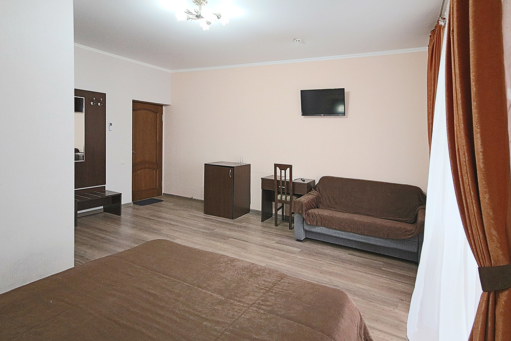 Однокомнатный номер находится в морском корпусе на самом берегу моря. Это прекрасный номер для размещения 2 - 3 человек. В номере стоит двуспальная кровать (либо две односпальные) и раскладная кушетка (полноценное односпальные место).