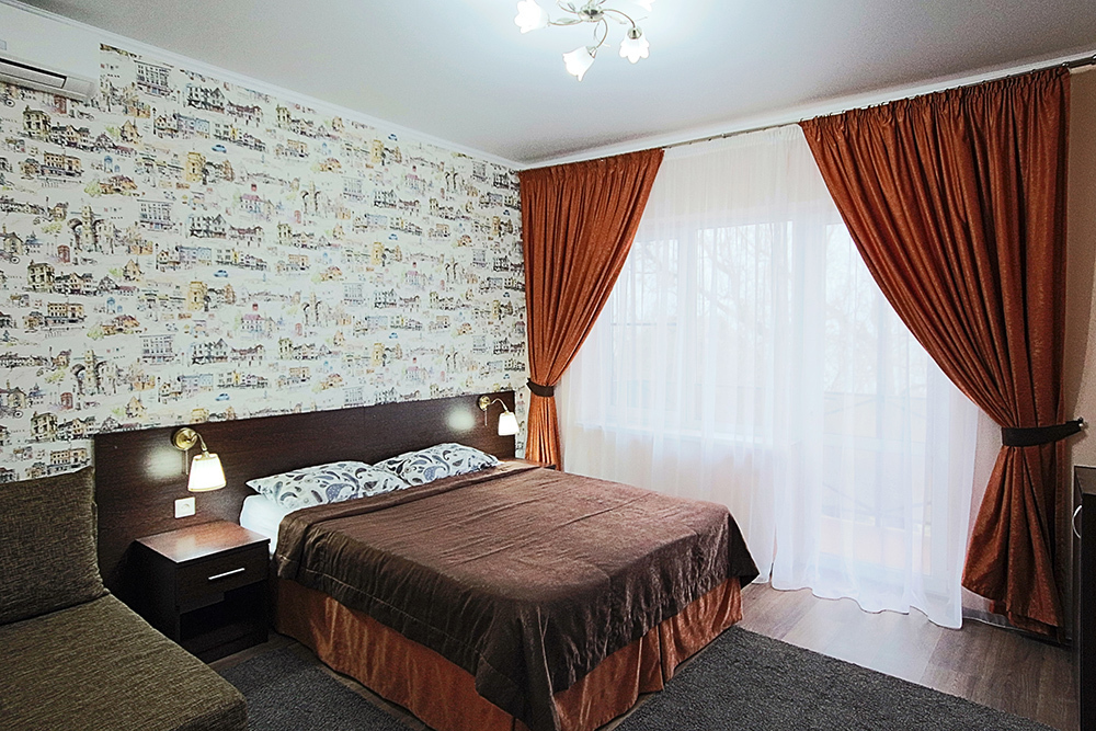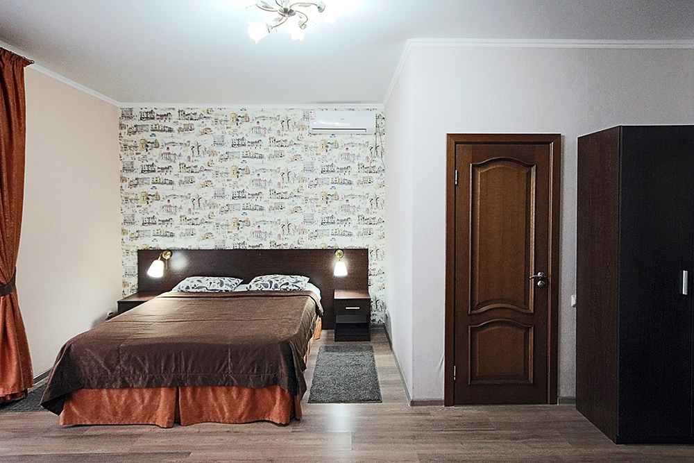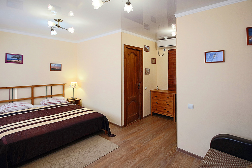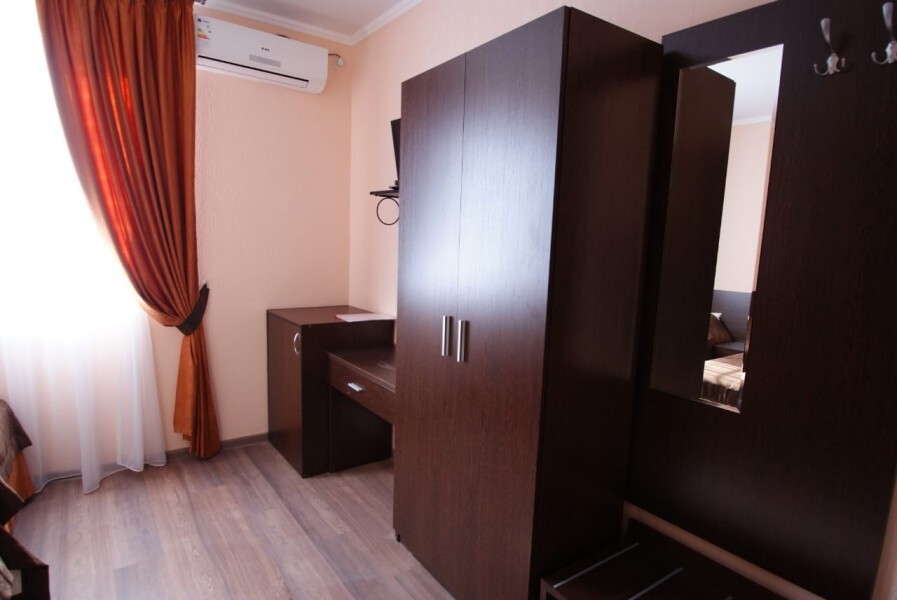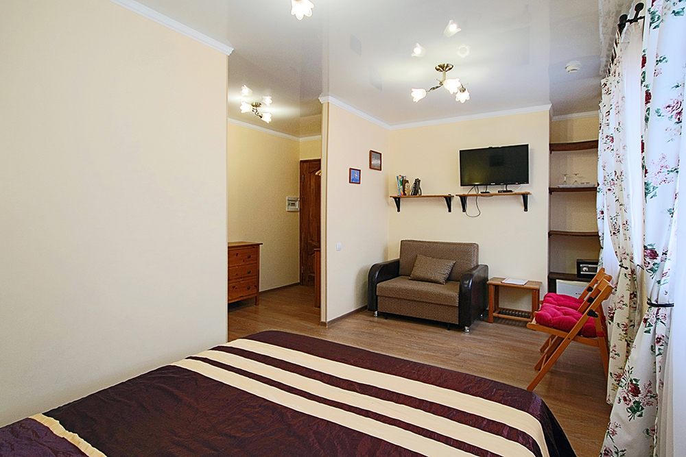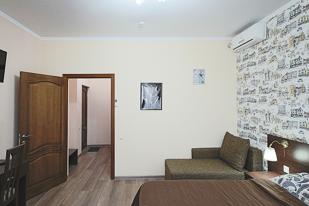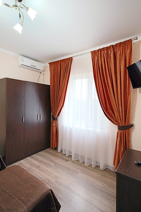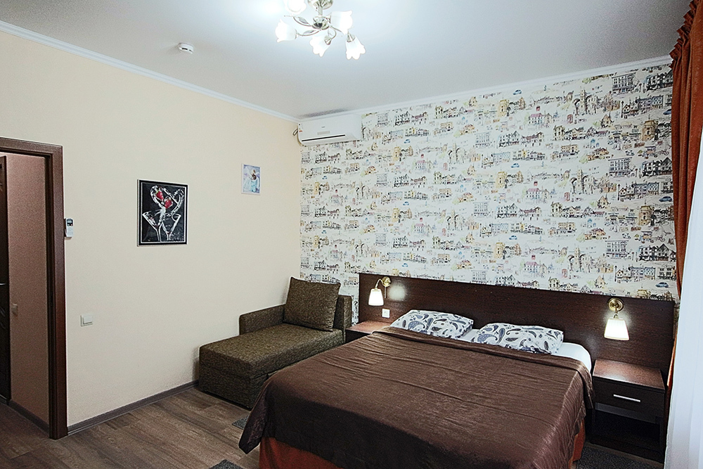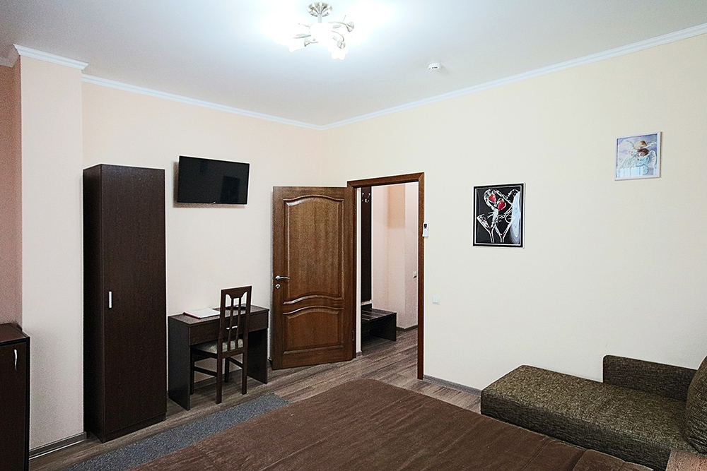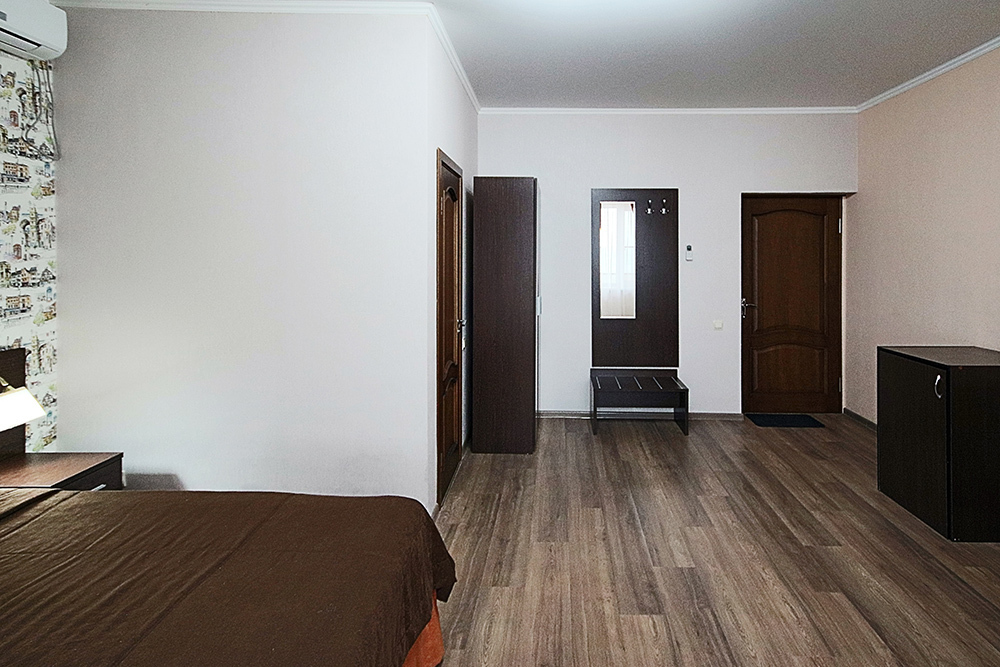 Однокомнатный номер находится в морском корпусе на самом берегу моря. Это прекрасный номер для размещения 2 - 3 человек. В номере стоит двуспальная кровать (либо две односпальные) и раскладная кушетка (полноценное односпальные место).
