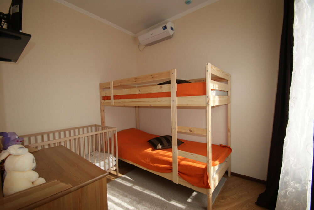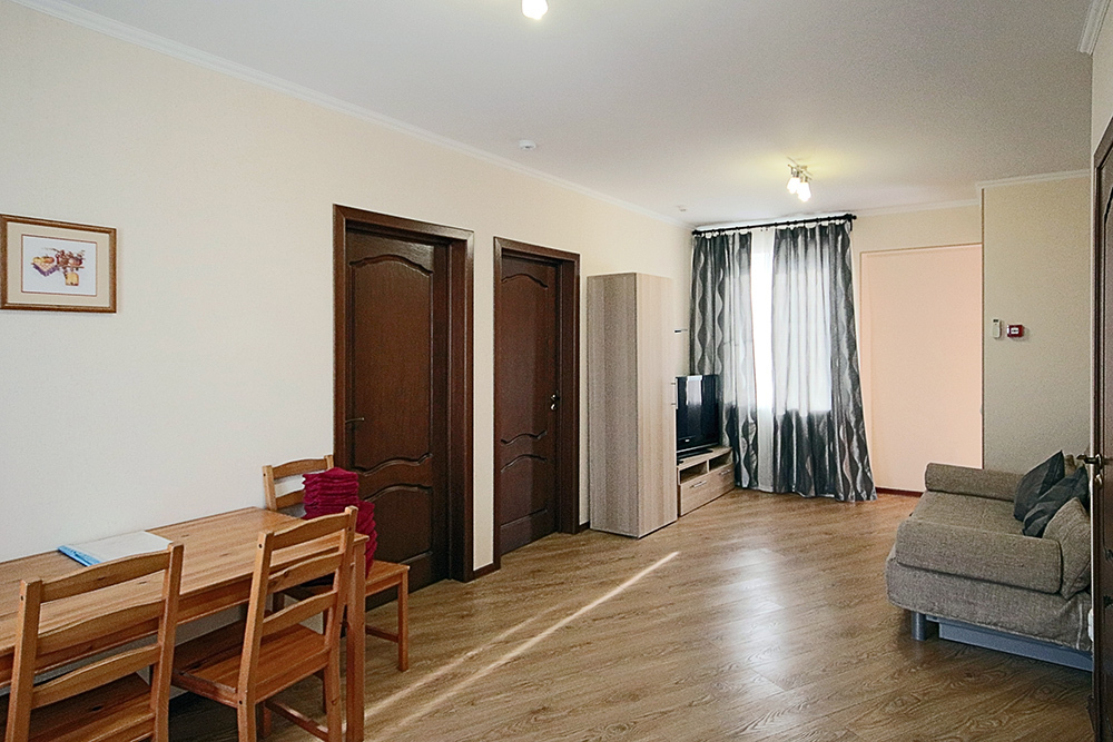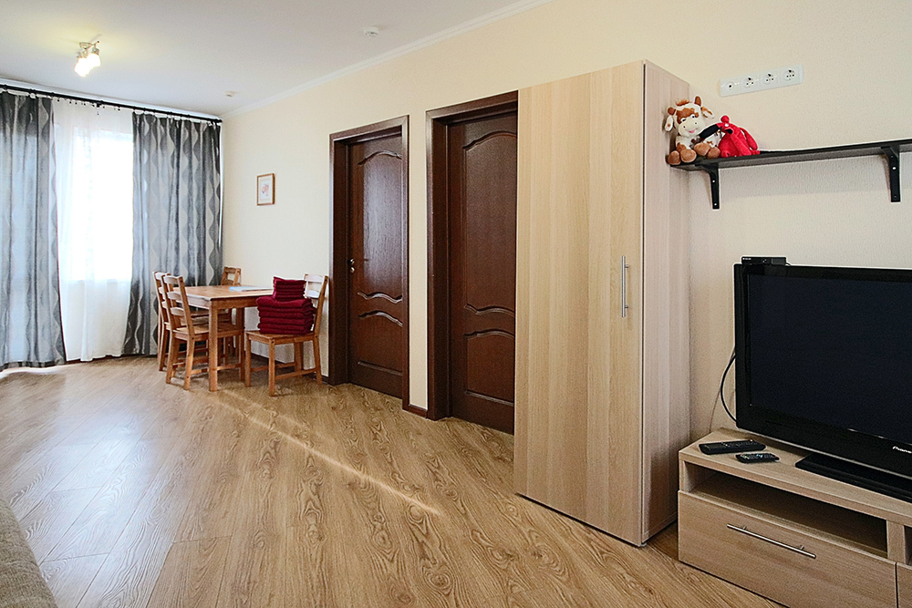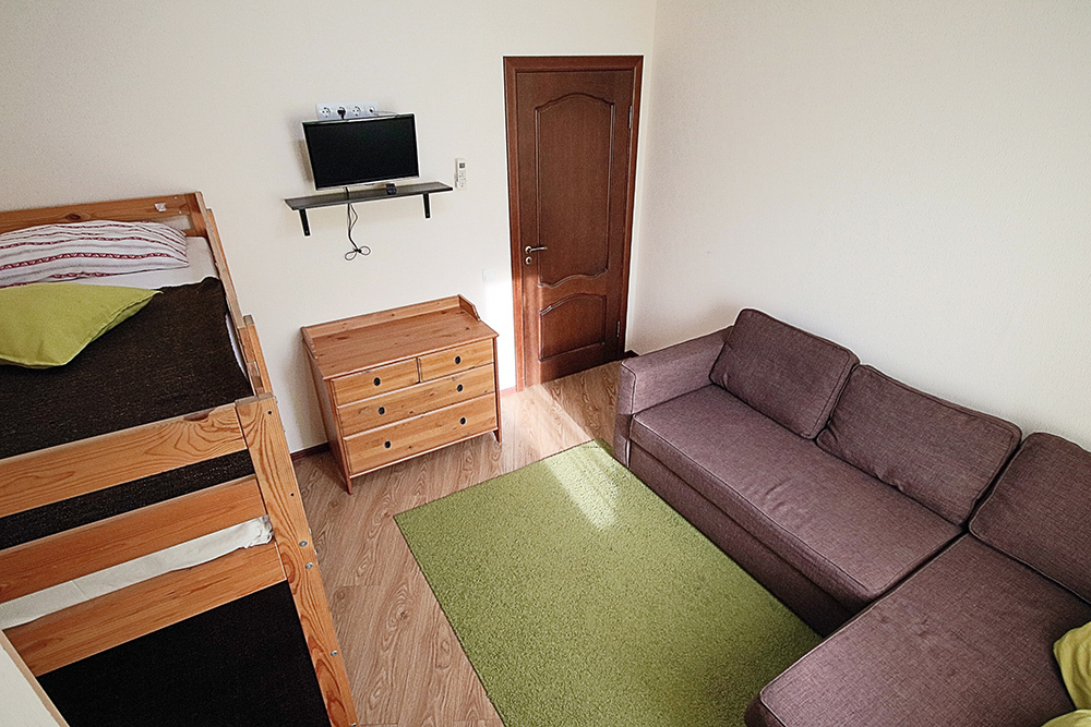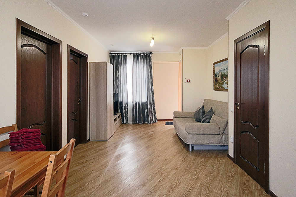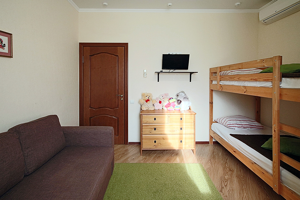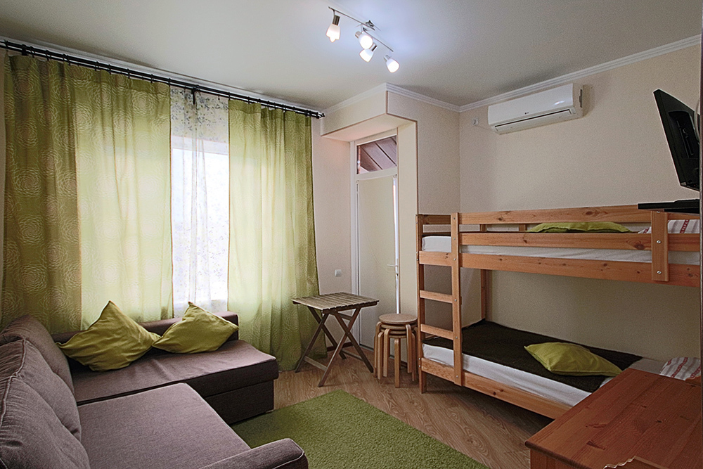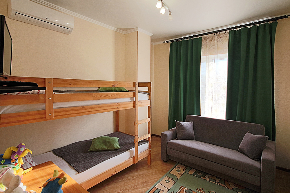 Две комнаты - это спальни с двухъярусными кроватями и двуспальными раскладными диванами-кроватями. Третья комната - гостиная-кухня с комфортным кухонным уголком, газовой плитой и двуспальным раскладным диваном-кроватью. В апартаментах имеются: телевизоры в каждой комнате, сплит-системы в каждой комнате, набор посуды, большой холодильник, санузел с ванной. Имеется сушилка для белья. Номер оборудован сетью Wi-Fi.