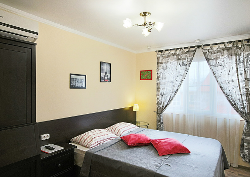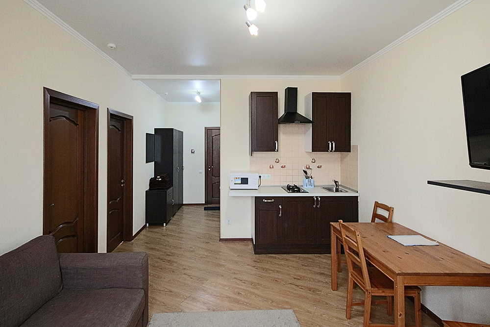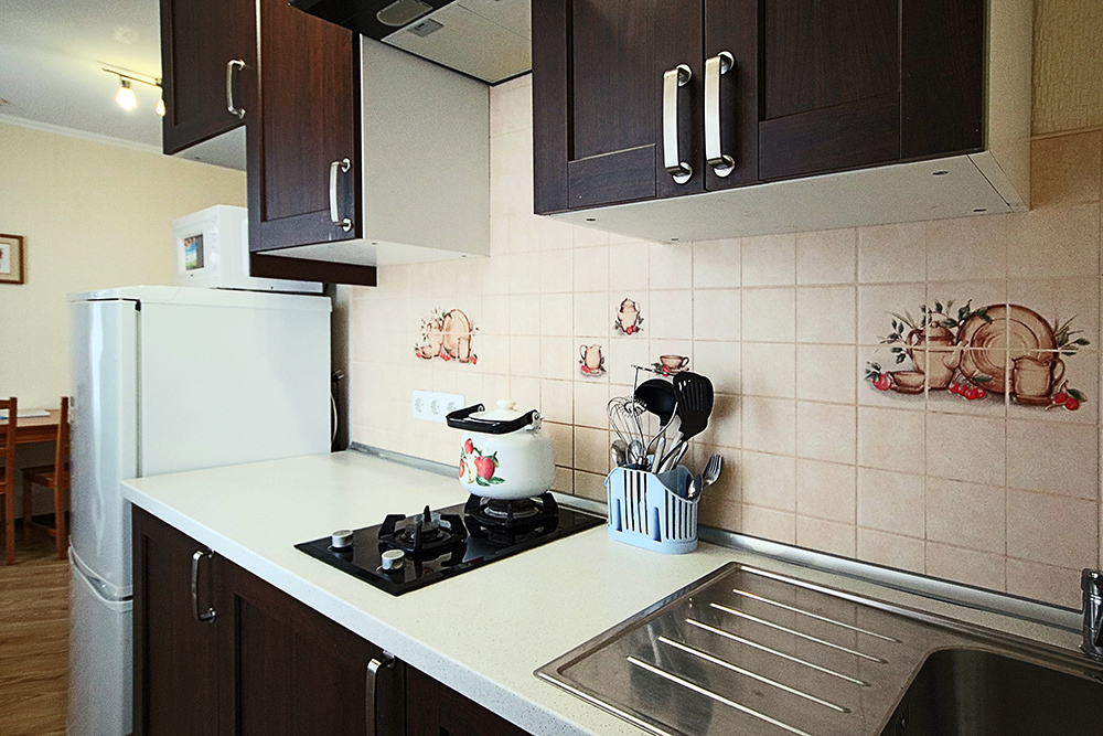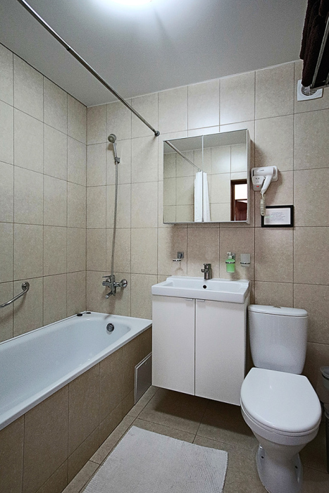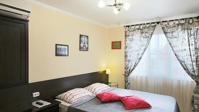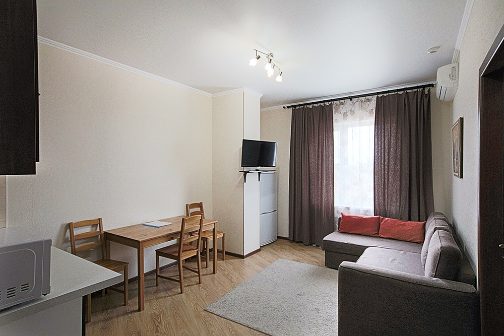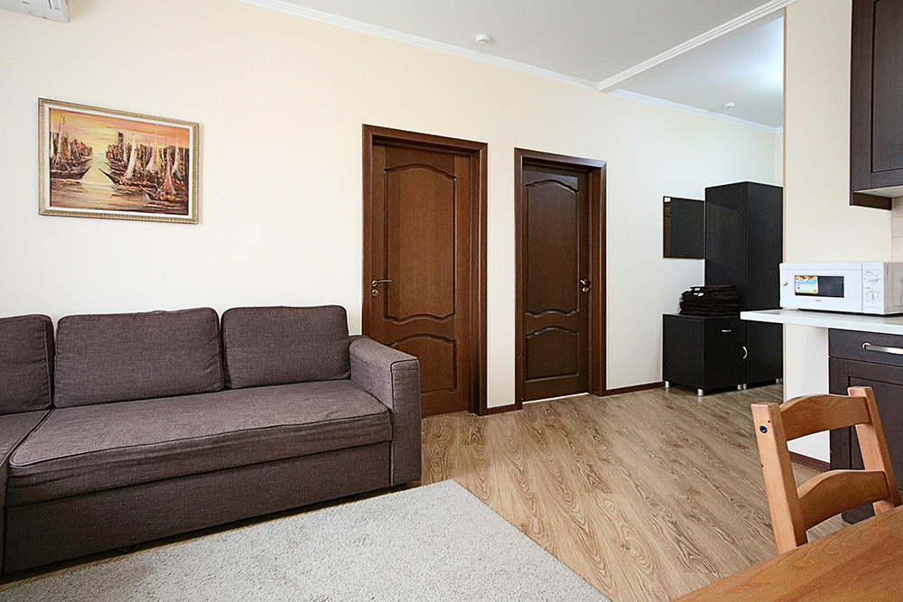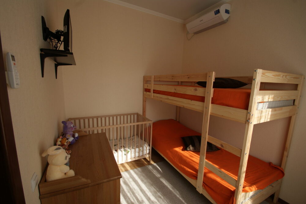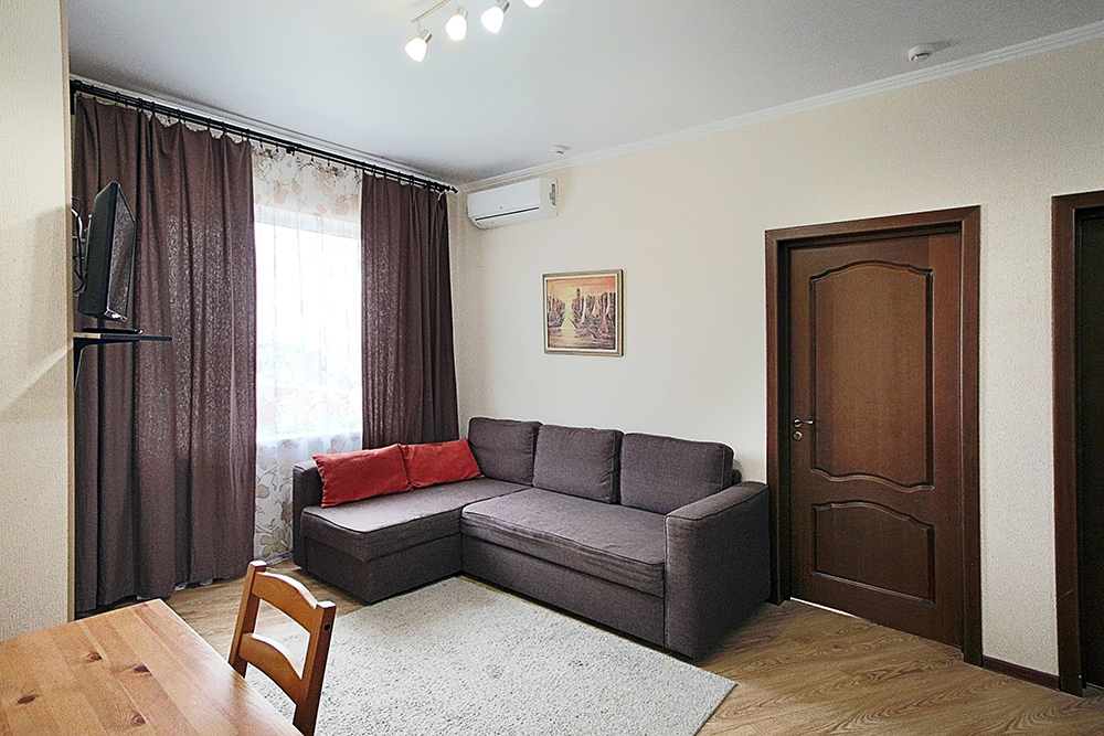 Две комнаты - это спальни с двухъярусными кроватями и двуспальными раскладными диванами-кроватями. Третья комната - гостиная-кухня с комфортным кухонным уголком, газовой плитой и двуспальным раскладным диваном-кроватью. В апартаментах имеются: телевизоры в каждой комнате, сплит-системы в каждой комнате, набор посуды, большой холодильник, санузел с ванной. Имеется сушилка для белья. Номер оборудован сетью Wi-Fi.