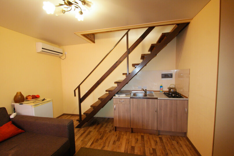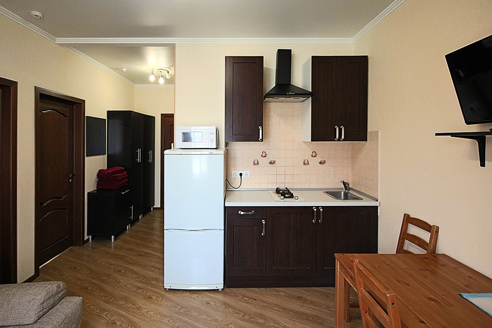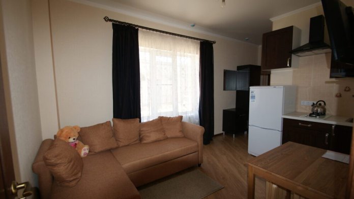 В номере имеются: двуспальная кровать, раскладное широкое кресло-кровать, санузел с ванной, телевизор, сплит-система, холодильник. Номер оборудован сетью Wi-Fi. Рядом с номером - выход на крышу дома на оборудованную для отдыха веранду - с мангалом, столиками, навесом от солнца и санузлом (веранда общая для двух номеров). Имеется сушилка для белья. Кухня - общая для двух номеров сезонного корпуса(на первом этаже).