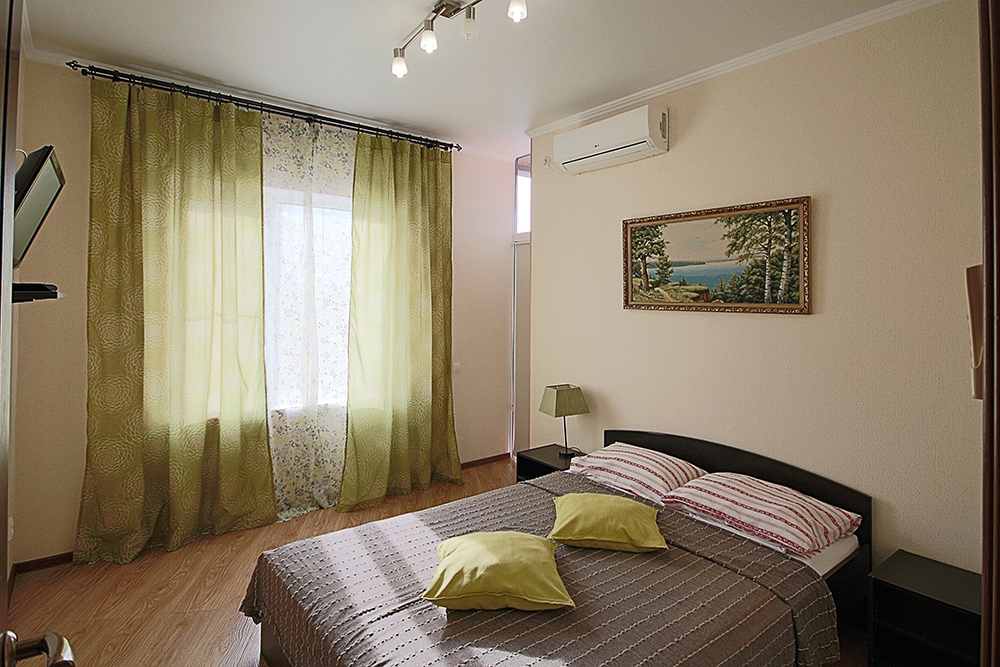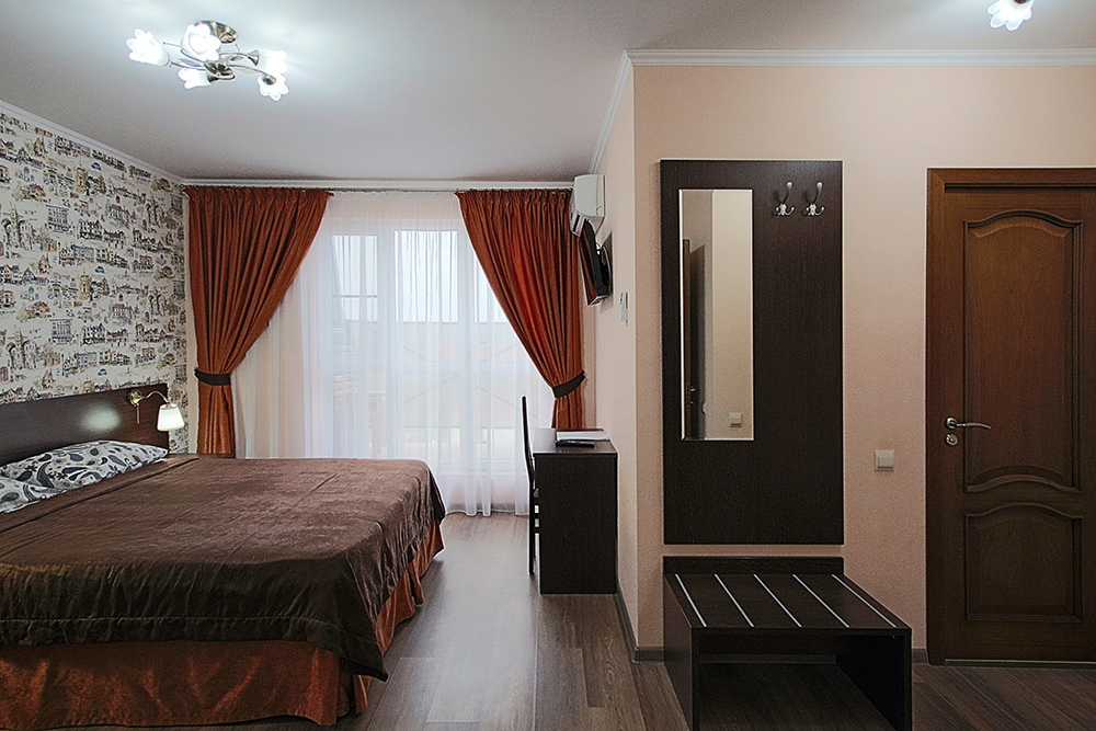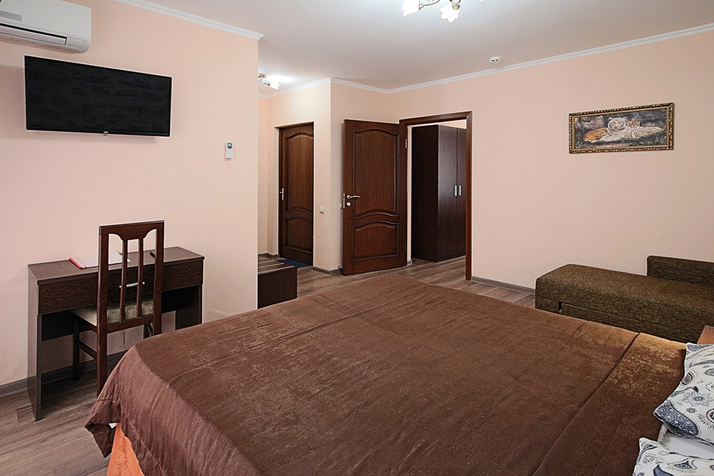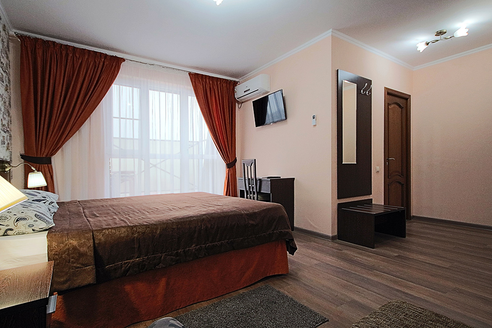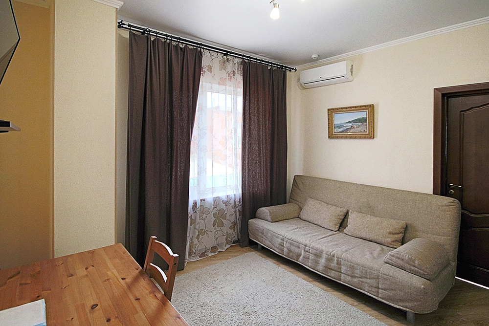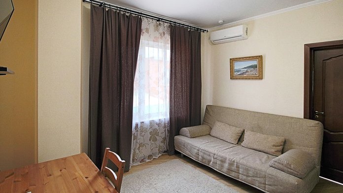 Это прекрасный однокомнатный номер для размещения 2 - 4 человек. В номере стоит двуспальная кровать (либо две односпальные) и раскладной двуспальный диван. В номере огромный балкон с видом на море. Номер оснащен холодильником, телевизором, сплит-системой. Имеется фен и сейф. На балконе есть сушилка для белья.