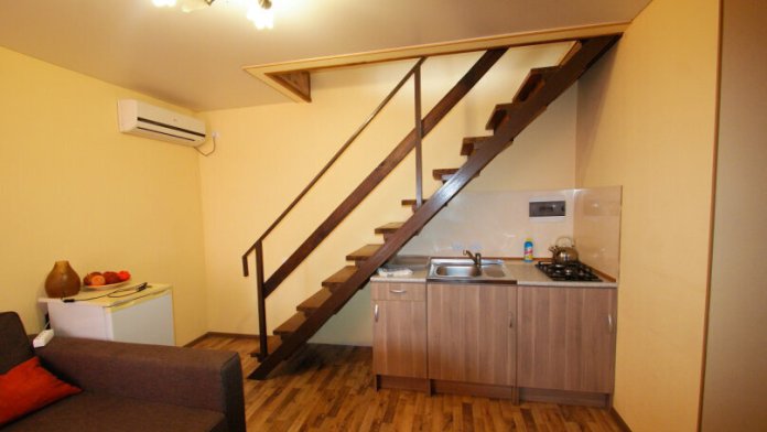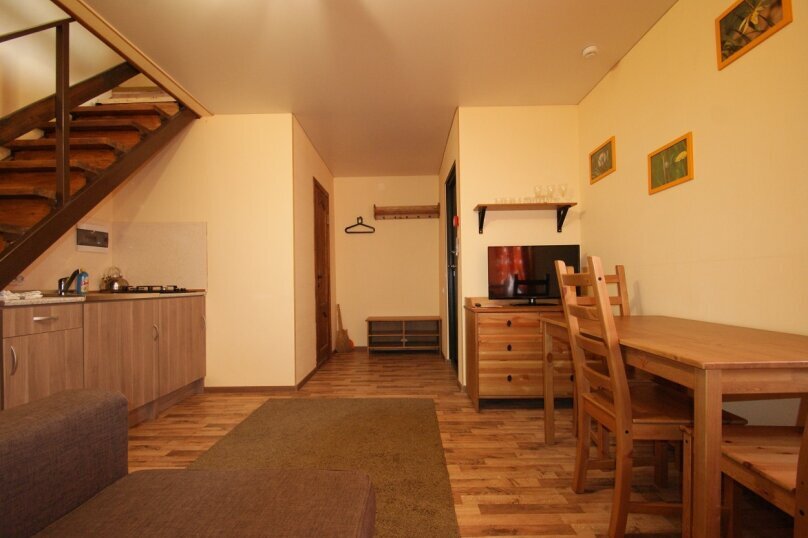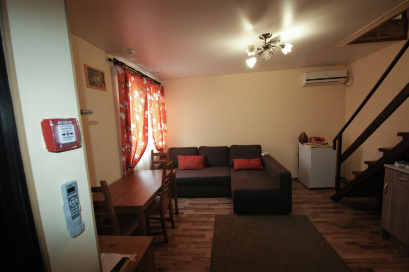 Этот номер представляет собой собственные полдома сезонного корпуса с отдельным входом - два жилых этажа и веранда - площадка для отдыха на крыше дома. На первом этаже расположена большая гостиная с двуспальным раскладным диваном-кроватью, санузел с ванной, небольшая прихожая и кухня. На втором этаже расположены две самостоятельные спальни (в одной - двуспальная кровать, в другой - двухярусная кровать), коридор и санузел. Со второго этажа - выход на крышу дома на оборудованную для отдыха веранду - с мангалом, столиками, навесом от солнца и санузлом. Имеется сушилка для белья.